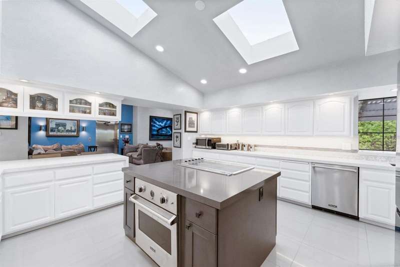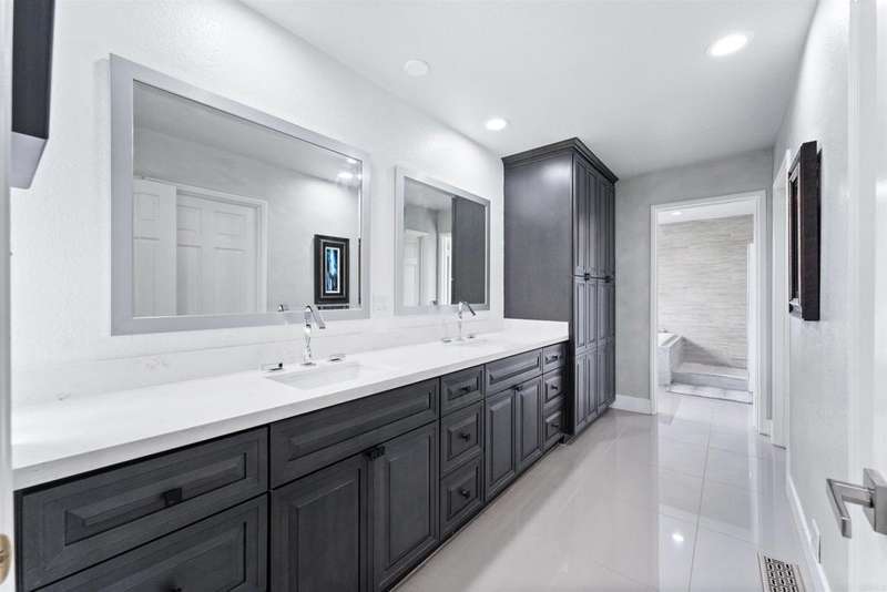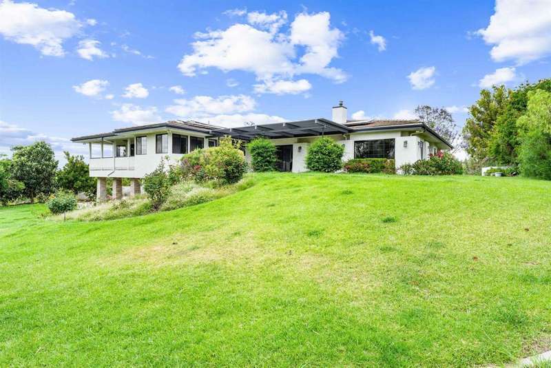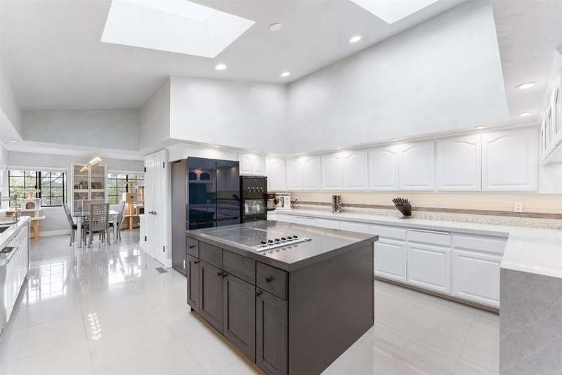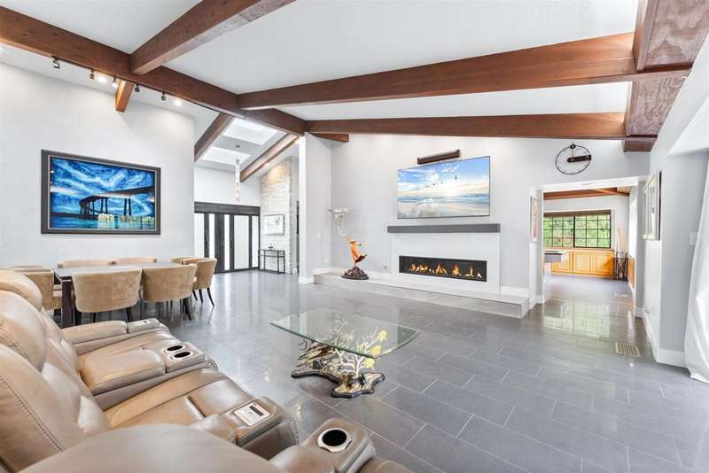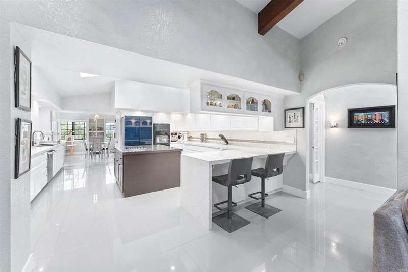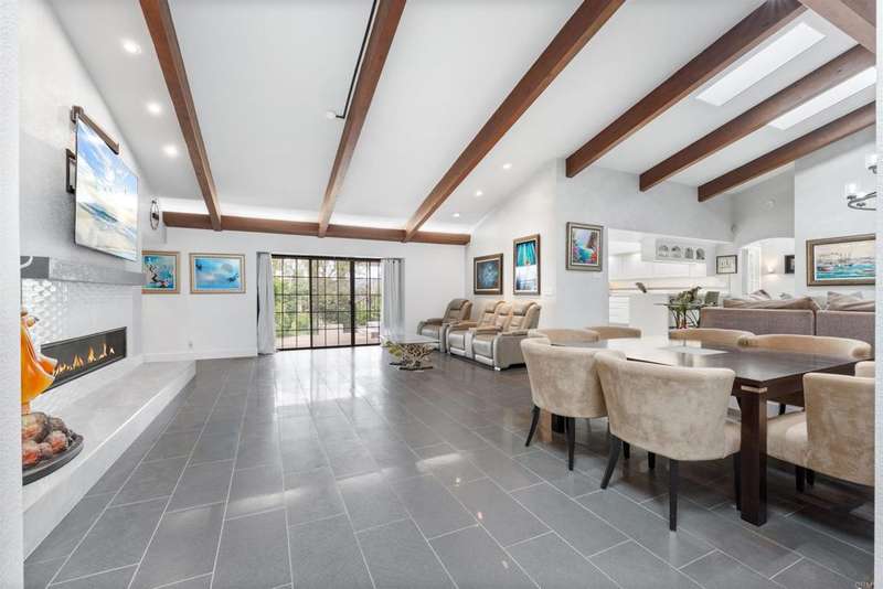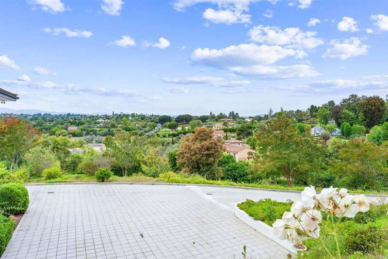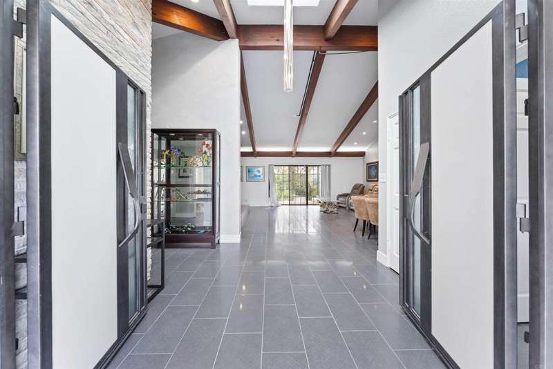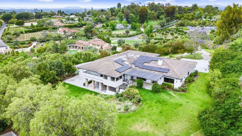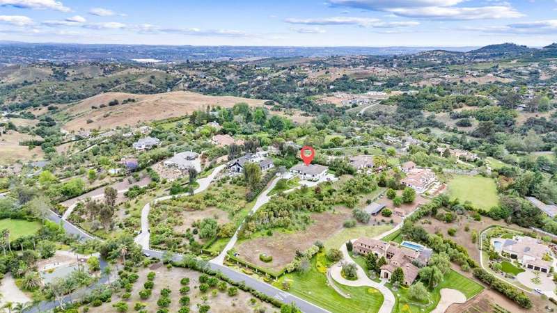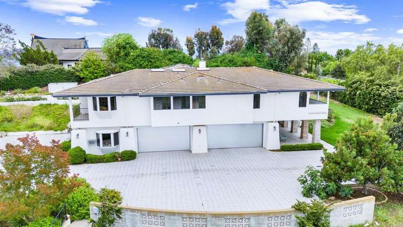 Welcome to an extraordinary lifestyle in Fallbrook's prestigious Rolling Hills gated community, offering privacy and security with 24-hour guard service. Enter through beautifully landscaped grounds featuring tranquil water features and lush park-like settings. Enjoy access to the clubhouse and tennis courts amid rolling hillsides. This impeccably modernized estate sits on 2.65 fully fenced acres, perfect for gatherings and includes a sprawling orchard of avocados and fruit trees, irrigated mainly by a well with a new pump, filter, motor, and reservoirs installed in 2023. Step inside to a formal entry and living room with cathedral-beam ceilings, a sleek linear fireplace, and abundant natural light from skylights. The gourmet kitchen boasts Viking appliances, a grey quartz island, white quartz countertops, a walk-in pantry, and a breakfast area opening to the patio. All secondary bathrooms are newly remodeled with a fresh modern look; the guest bath features a charming retro-modern style. The primary bathroom is fully transformed with a large walk-in shower, oversized rain showerhead, and a luxurious soaking tub. A water softener was installed in 2021. The spacious primary suite includes a private deck with panoramic views. Two additional bedroom suites each have full baths and deck access overlooking the grove. The living room opens to a game room, ideal for entertaining. A new elevator (2024) connects the main level to the oversized 4-car garage with insulated stainless steel doors and ample storage. An attached 500 sq ft ADU with a kitchenette, exterior entrance, and parking adds versatility. Dual A/C and heating systems ensure comfort year-round. Exterior stucco repairs and paint were completed in March 2023. Owned solar panels installed in 2019 provide energy efficiency. Live in one of Fallbrook's most sought-after neighborhoods, close to new wineries, restaurants, golf courses, and just a short drive to beaches and vibrant entertainment. Don't miss this magnificent estate--contact us today to schedule your private tour.