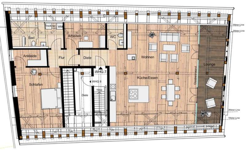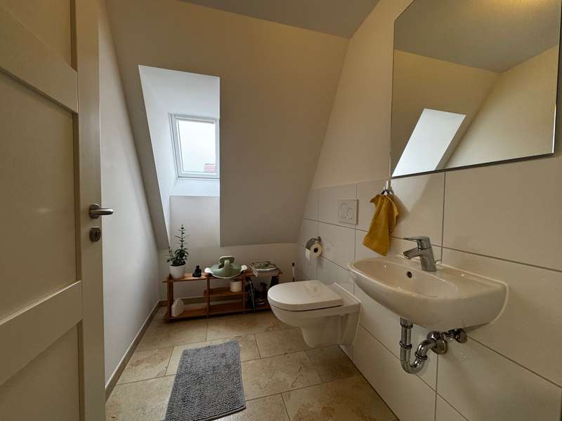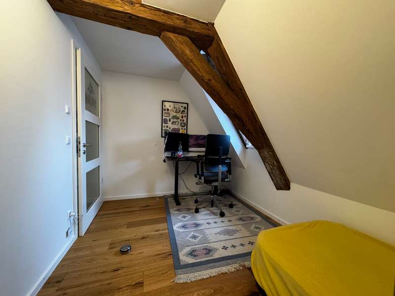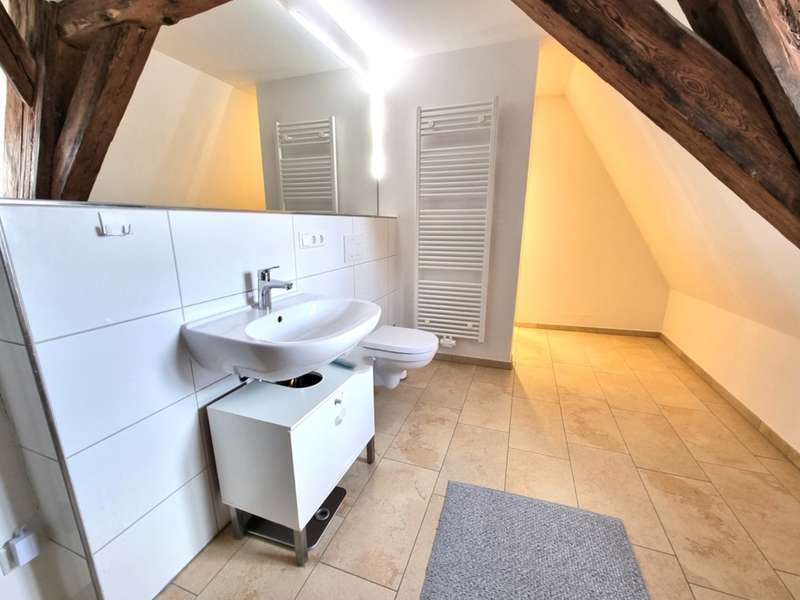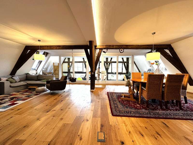 VON POLL IMMOBILIEN offers you the opportunity to purchase this exclusive top-floor apartment, which is located in a historic building dating back to 1460 in the heart of Nördlingen's old town. The apartment was completely modernized in 2018 as part of a comprehensive core renovation of the building and offers a living space of approx. 154.9 m². It comprises 4.5 rooms and combines the historic charm of the building with modern living comfort. The living spaces impress with their exclusive furnishings and have been fitted with underfloor heating, which provides pleasant warmth in all rooms. The floor is covered with high-quality parquet flooring, which gives the rooms a warm and elegant atmosphere. The open-plan living, dining and cooking area forms the heart of the apartment. A high-quality fitted kitchen has been integrated here, which is included in the purchase price. This spacious area is ideal for sociable evenings with family and friends. The large lounge area, which adjoins this open-plan area with approx. 22 m², offers a spectacular view of the Nördlingen landmark, the "Daniel". The spacious bedroom is directly connected to a dressing area and therefore offers plenty of storage space. The daylight bathroom is equipped with a modern shower, washbasin and WC and also has a space for a washing machine and tumble dryer. The apartment comes with a parking space, which is located directly at the property and can be purchased for €20,000. A passenger elevator facilitates access to the 3rd floor of the building, making the apartment easily accessible. The apartment has been rented since 2023 and currently generates a monthly rental income of €1,325. The condition of the property can be described as as good as new, which illustrates the high standard of the recent refurbishment. In summary, this top-floor apartment offers a unique living experience in a historic setting with modern comforts. It harmoniously combines historical architecture and modern furnishings and thus offers a very special kind of home right in the heart of Nördlingen. Interested parties are invited to see the many advantages of this property for themselves and arrange a viewing appointment.