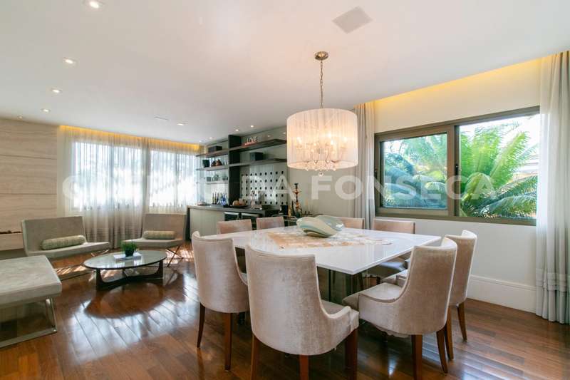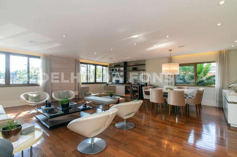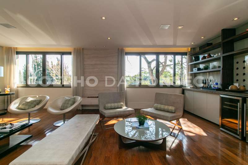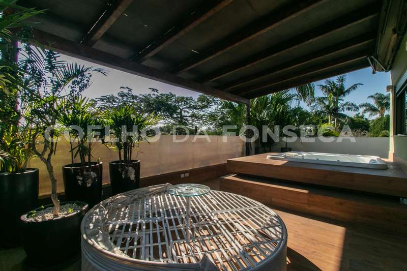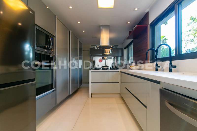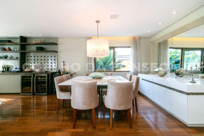Casa com excelente projeto e ótimo acabamento. Reformada. Living amplo com ambientes integrados, cozinha planejada, sala de home theater e cinco ótimas suítes, sendo a master no piso superior, com sala íntima, closet, varanda com jacuzzi e uma linda vista para o verde!