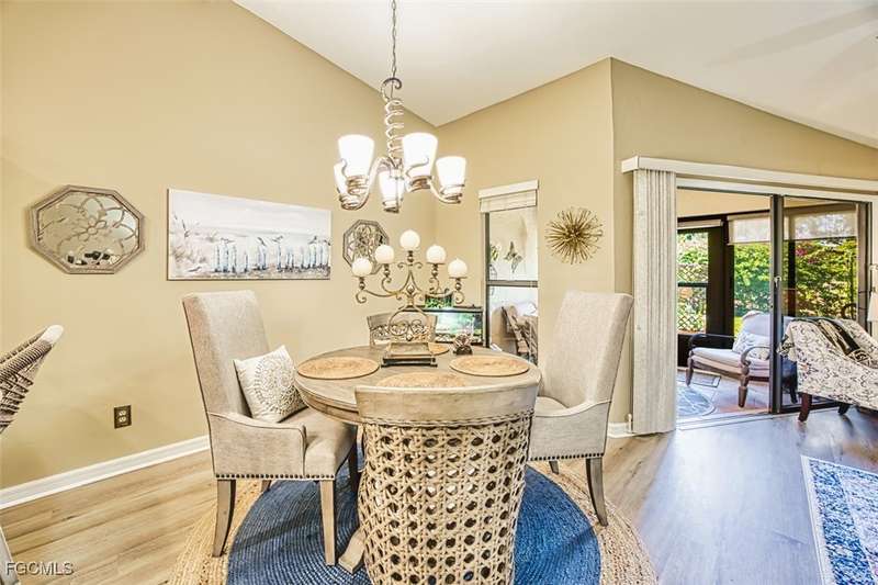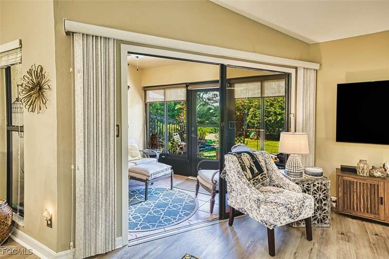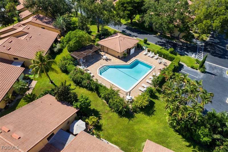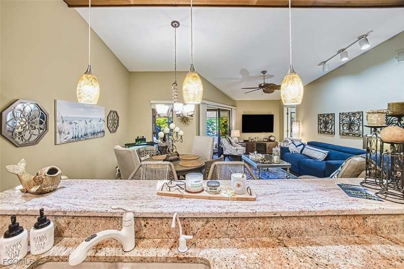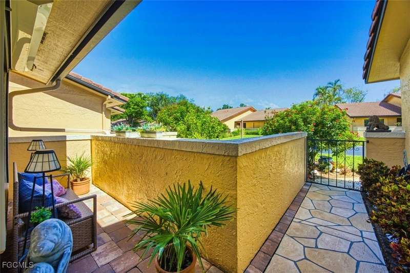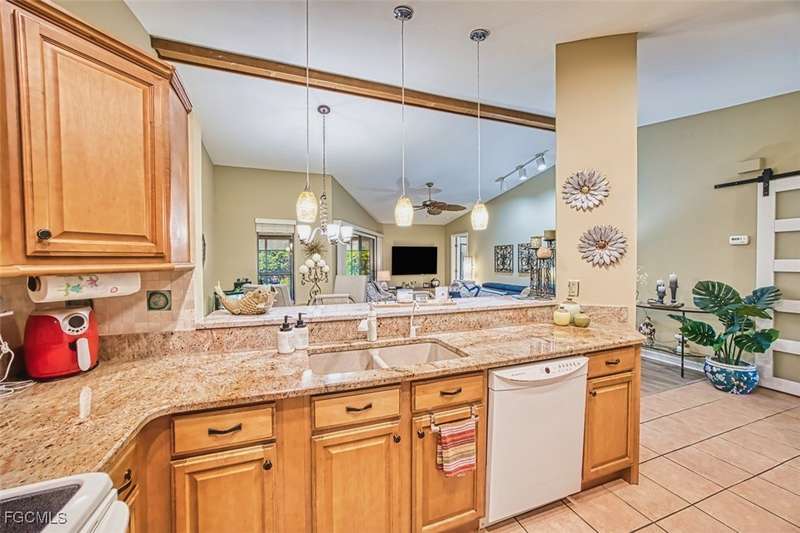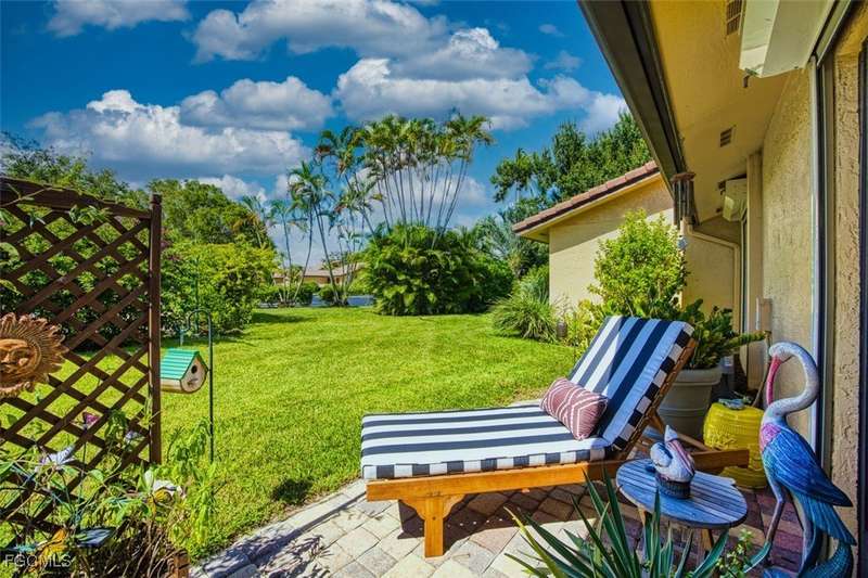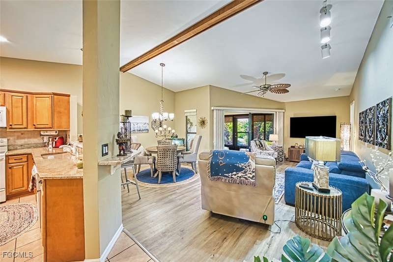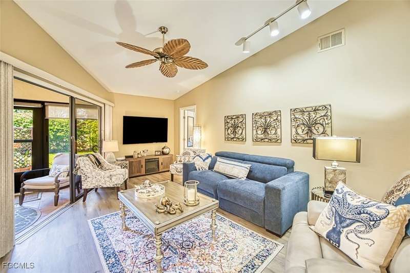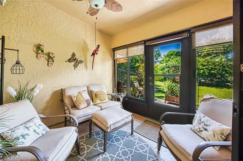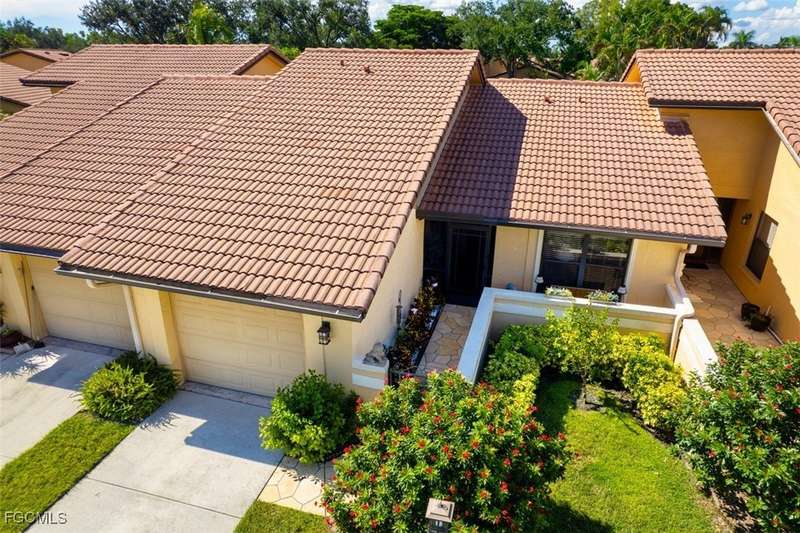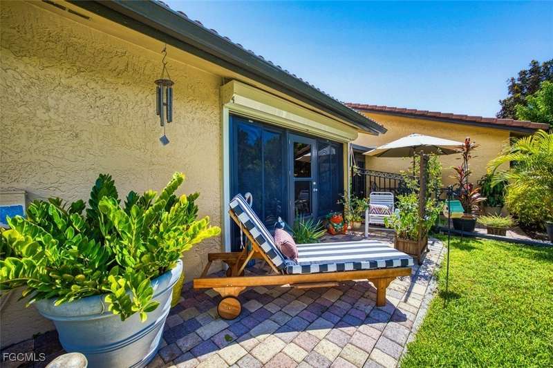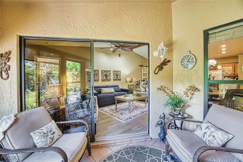 Discover this beautifully updated 2BR/2BA villa in the gated community of Governors Island-just a few steps from the community pool! This rare floor plan features two ensuite bedrooms, perfect for hosting guests or accommodating multigenerational living. Enjoy soaring vaulted ceilings with exposed beams, a granite kitchen with rich wood cabinetry, and durable LVT and tile flooring throughout. The enclosed, air-conditioned lanai provides ideal flex space for a home office, den, or hobby area. Relax or entertain outdoors with a private gated courtyard in the front and a secluded backyard patio-perfect for grilling and al fresco dining. Prime location tucked behind Bell Tower Shops-close to top shopping, dining, RSW airport, beaches, and spring training stadiums. LOW HOA includes: exterior building insurance, roof maintenance, cable, Wi-Fi, lawn care, pest control & more.