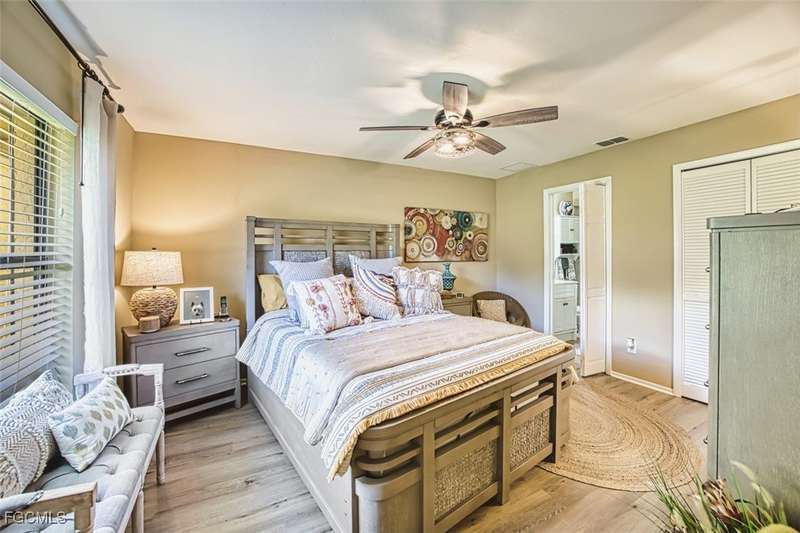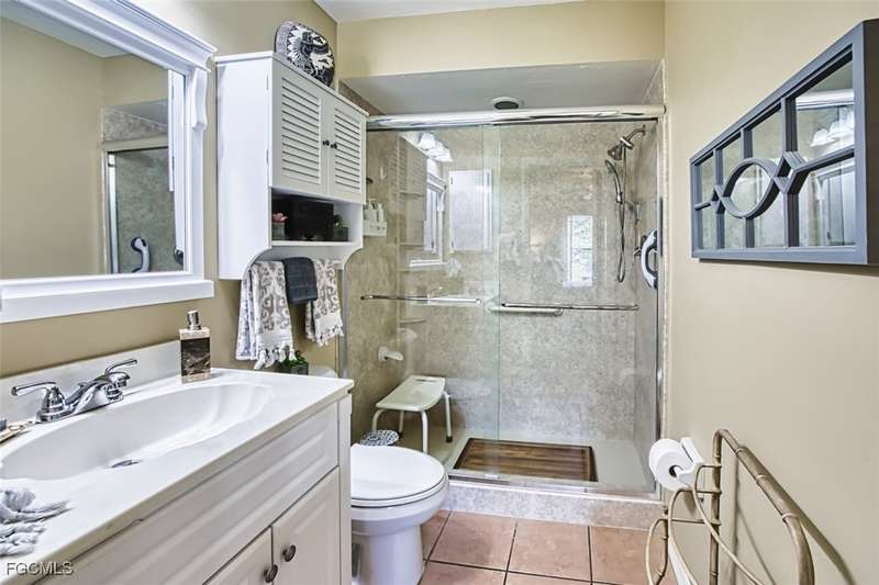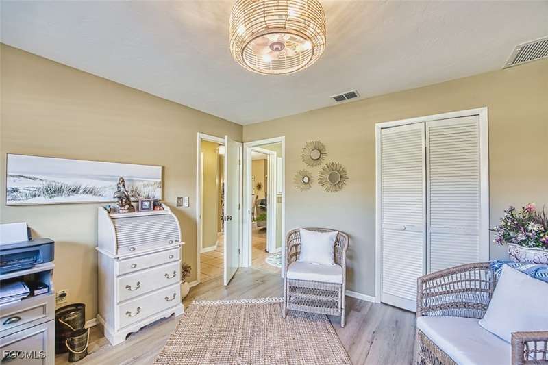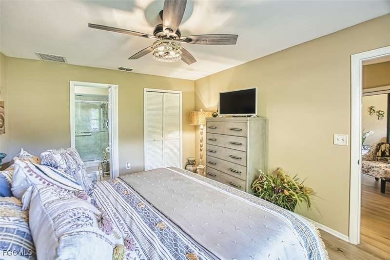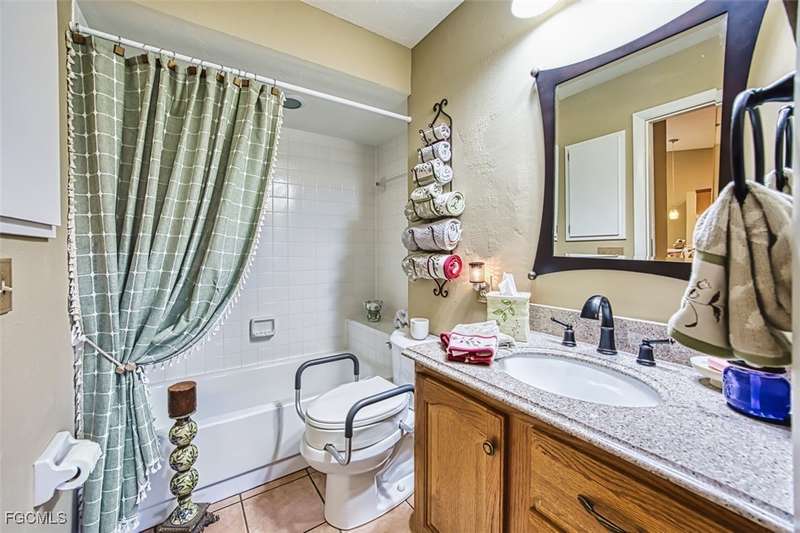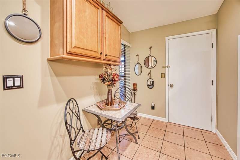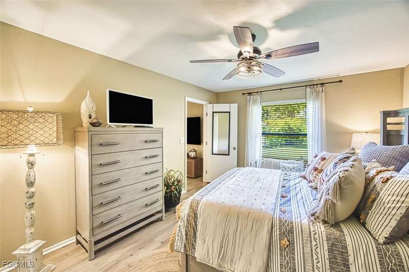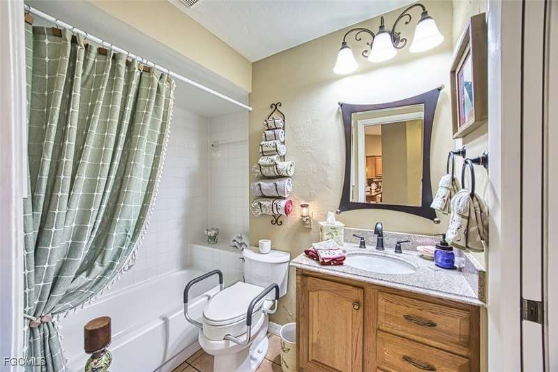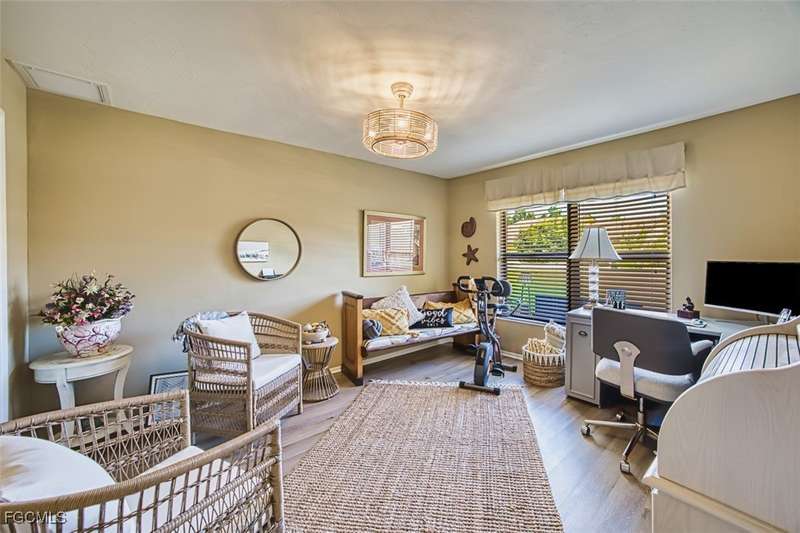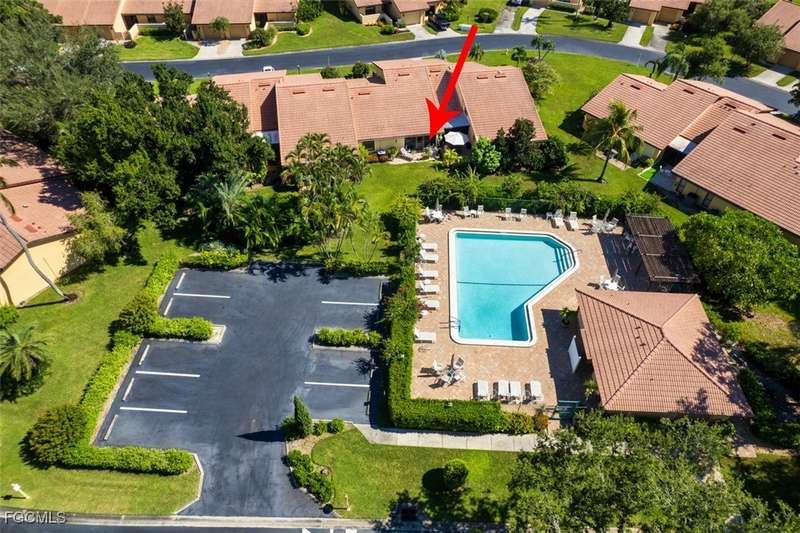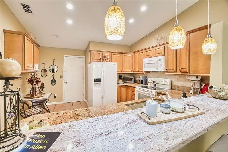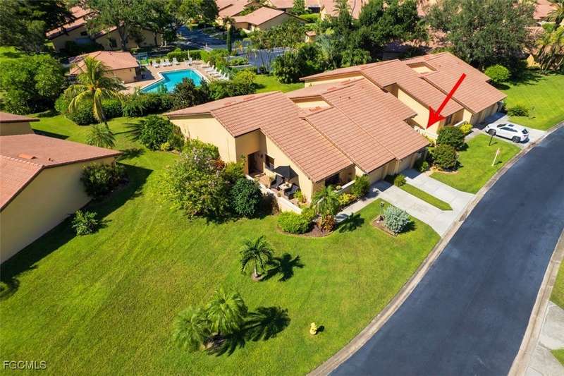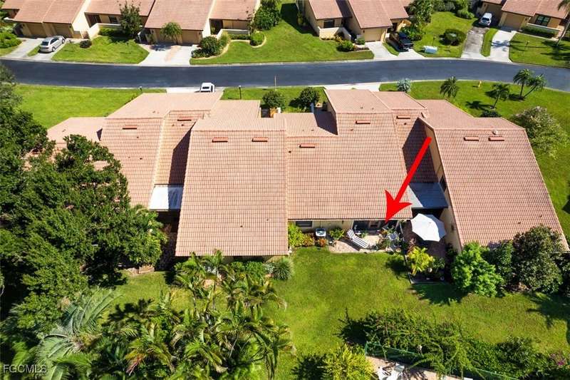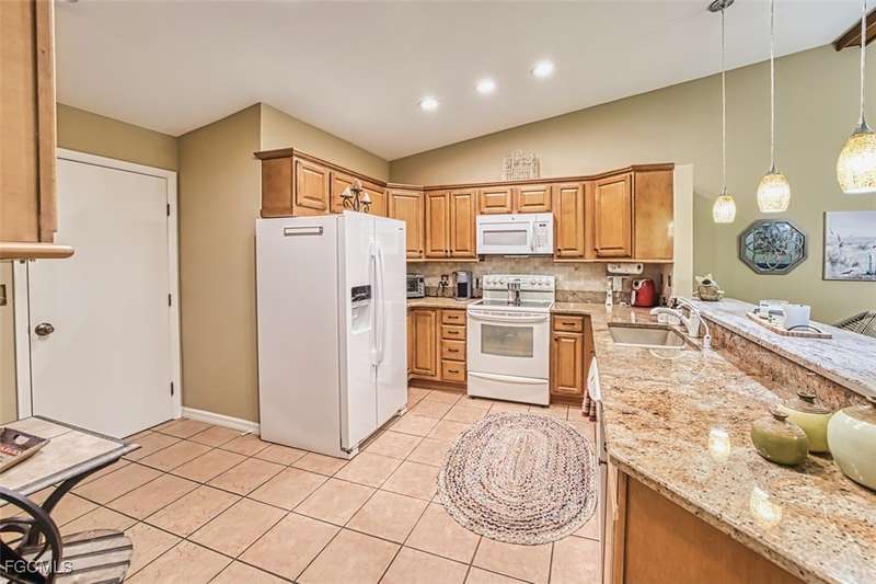 Discover this beautifully updated 2BR/2BA villa in the gated community of Governors Island-just a few steps from the community pool! This rare floor plan features two ensuite bedrooms, perfect for hosting guests or accommodating multigenerational living. Enjoy soaring vaulted ceilings with exposed beams, a granite kitchen with rich wood cabinetry, and durable LVT and tile flooring throughout. The enclosed, air-conditioned lanai provides ideal flex space for a home office, den, or hobby area. Relax or entertain outdoors with a private gated courtyard in the front and a secluded backyard patio-perfect for grilling and al fresco dining. Prime location tucked behind Bell Tower Shops-close to top shopping, dining, RSW airport, beaches, and spring training stadiums. LOW HOA includes: exterior building insurance, roof maintenance, cable, Wi-Fi, lawn care, pest control & more.