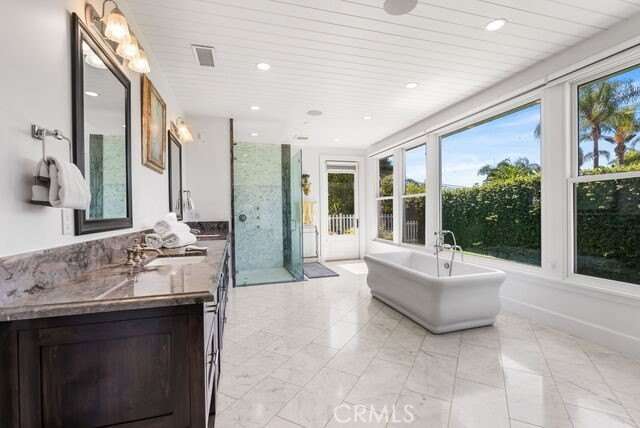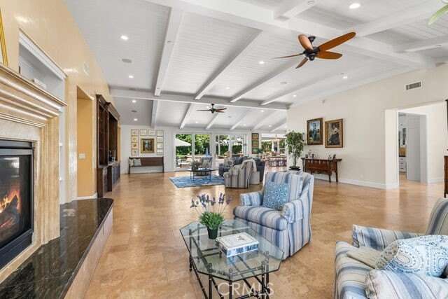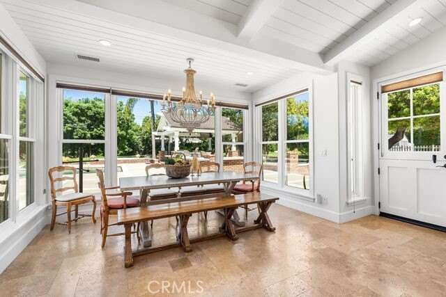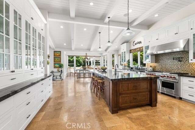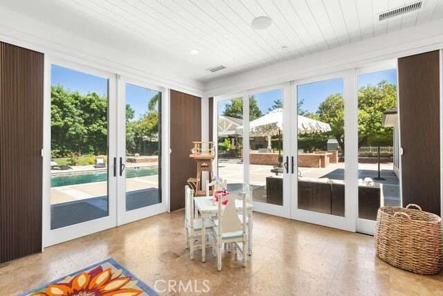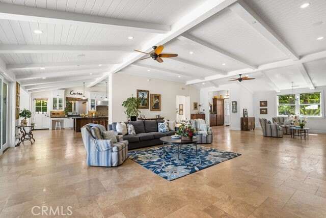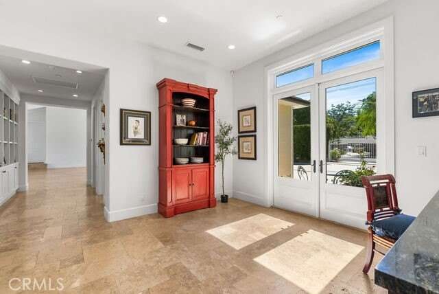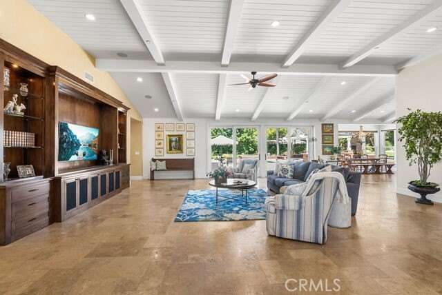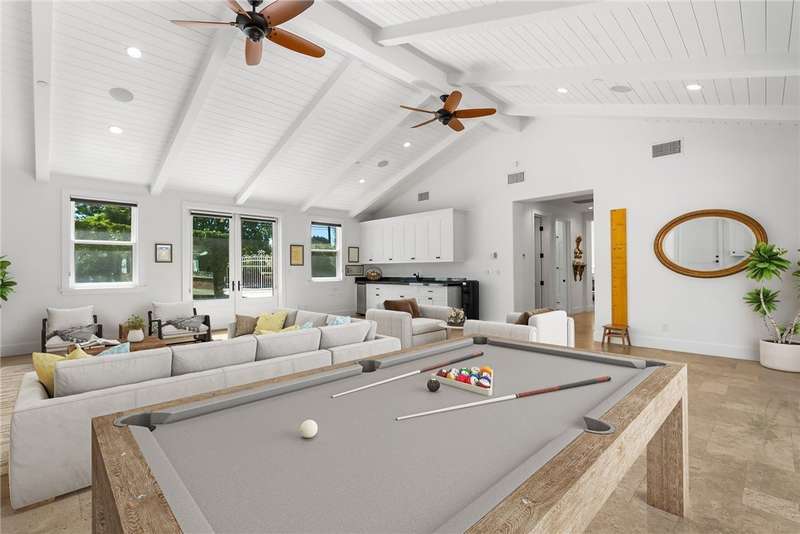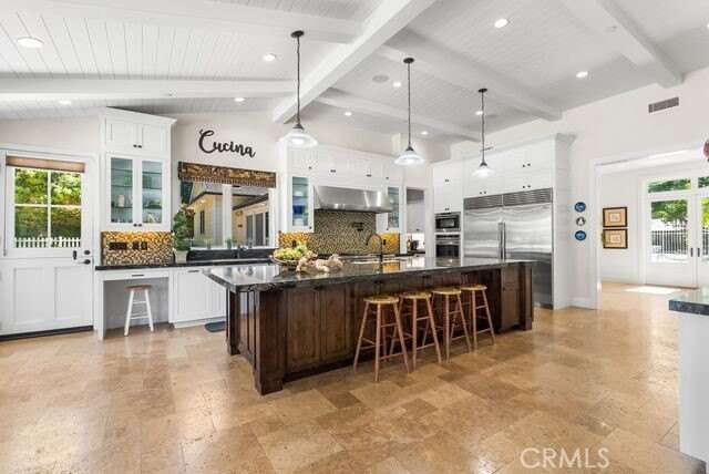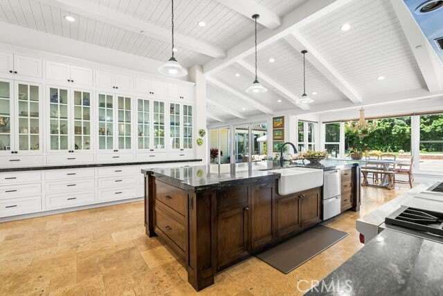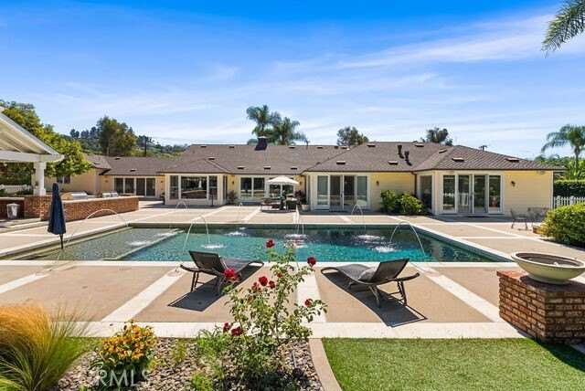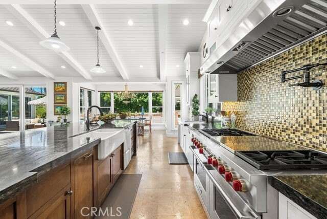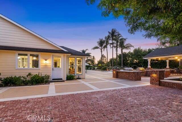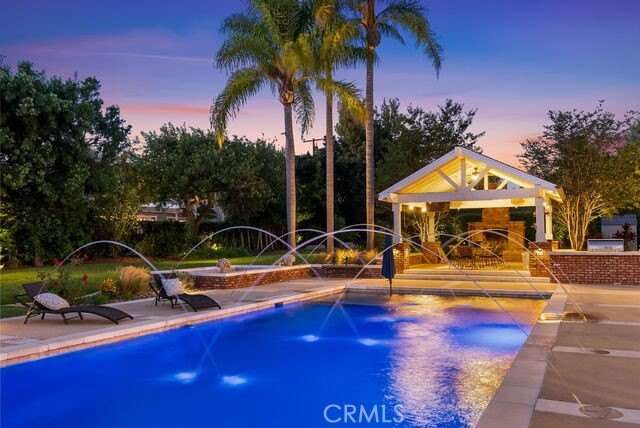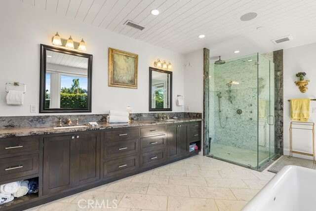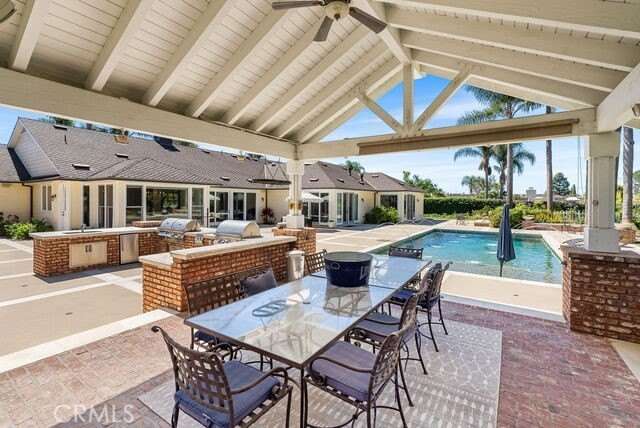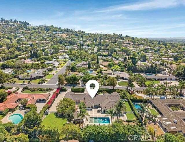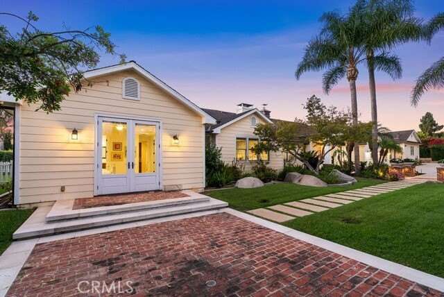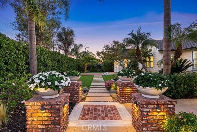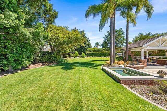 Set on nearly an acre of flat, gated grounds in the hills of North Tustin, 11581 Arroyo Avenue is a custom single-level estate that captures the essence of California luxury living. Offering more than 6,700 square feet of thoughtfully designed living space, this one-of-a-kind property was torn down and reimagined in 2012 to blend timeless architecture with modern design. Through grand double doors, soaring ceilings, travertine floors, wood-beam accents, and expansive windows create an open, light-filled atmosphere. A welcoming open office off the entry features French doors that frame views of the front gardens, providing the perfect setting for working from home. Formal living and dining rooms provide an elegant backdrop for gatherings and celebrations. At the heart of the home, the chef’s kitchen boasts Sub-Zero and Wolf stainless steel appliances, three dishwashers, a hot water pot filler, a warming drawer, floor-to-ceiling custom cabinetry, a massive center island, a walk-in pantry, and a charming Dutch door that opens to the resort-inspired backyard. The primary suite offers a private retreat with a separate living room, fireplace, dual boutique-style walk-in closets, and a spa-like bath with soaking tub, frameless shower, and dual vanities, while each additional bedroom is en-suite for privacy and comfort. Entertainment is at every turn with a game room and a versatile play or pool room, both opening to the outdoors. Multiple French doors and floor-to-ceiling windows extend the living space outside to a backyard designed for resort-style living, featuring a sparkling pool with a baja shelf and spa, an outdoor kitchen, a cabana, a fireplace, a putting green, expansive lawns, and raised garden beds surrounded by mature landscaping that ensures privacy. Additional highlights include a three-car garage, expansive motor court for parking up to 14 cars, an integrated sound system, and advanced security system. 11581 Arroyo Avenue is more than a home—it is a private compound offering flexible living spaces, luxury amenities, and a premier North Tustin location close to top-rated Tustin schools and all that Orange County has to offer.