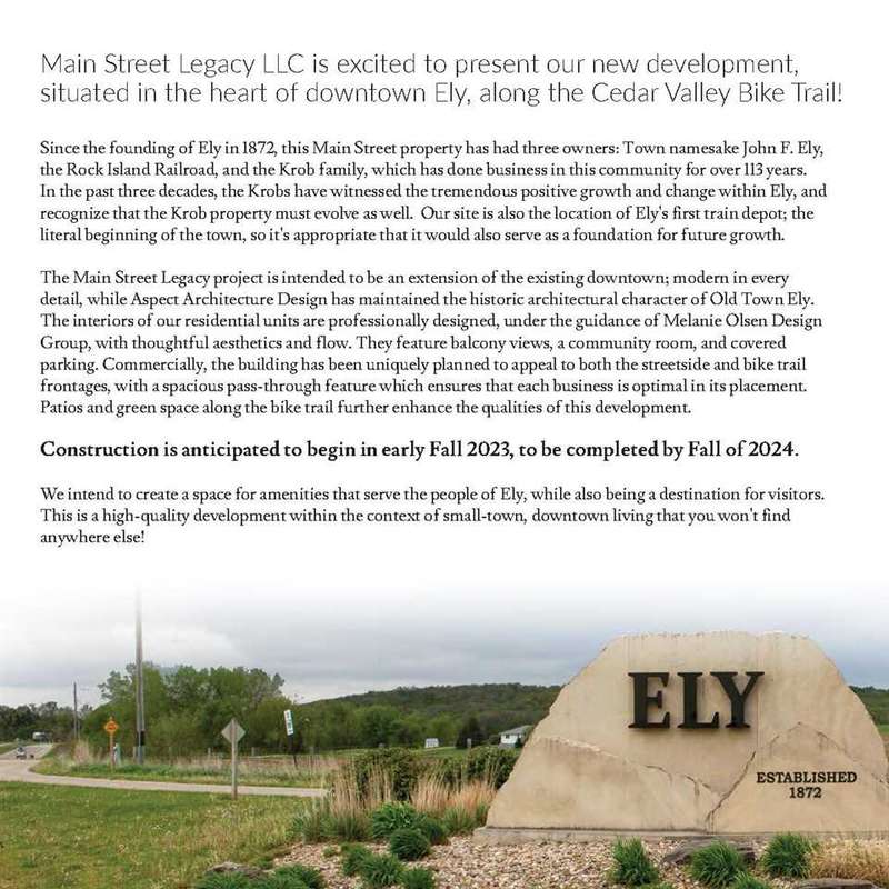 Welcome to Ely IA and the newest project in town! Located directly on the Cedar Valley Nature Trail and at the east end of Main Street, the Mainstreet Legacy LLC is committed to building this mixed use commercial and residential project. We are just months away from our residentials spaces being move in ready. Our current goal is to have possession of the building by October of 2025, so now is the time to be picking your unit and securing your space in this great building. Located just 15 min from downtown Cedar Rapids, and just over 25 from downtown Iowa City, this is a great location to escape the big city and enjoy quite small town living while still being just minutes from the action. This is not going to be your typical condo experience, these are going to be exceptional! Special care has been taken by Melanie Olsen Design to create a space which is warm, professional, and executive level in every way. The residential space has a common area for larger gatherings and for all to use. The building offers heated indoor parking, geo-thermal, filtered water system, spaces for electric vehicles to plug-in, security, elevator service from the parking to the second floor for a zero stairs experience, extra storage for each residential unit in the parking space, bike parking, and custom firepits along the bike trail for all to enjoy