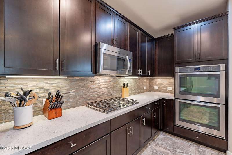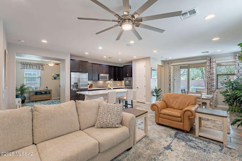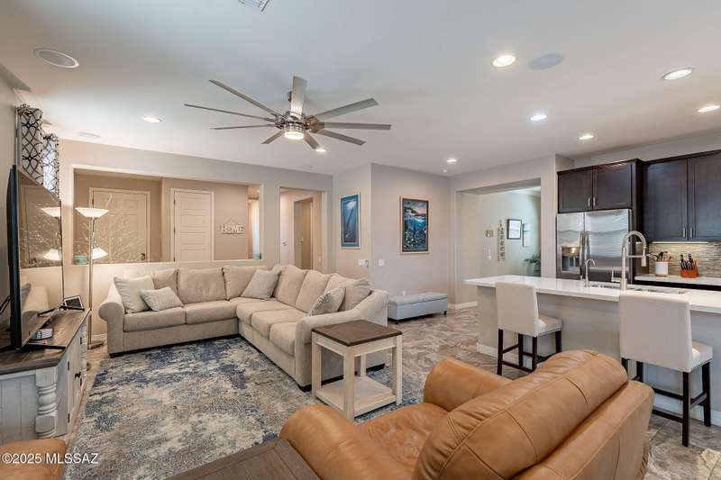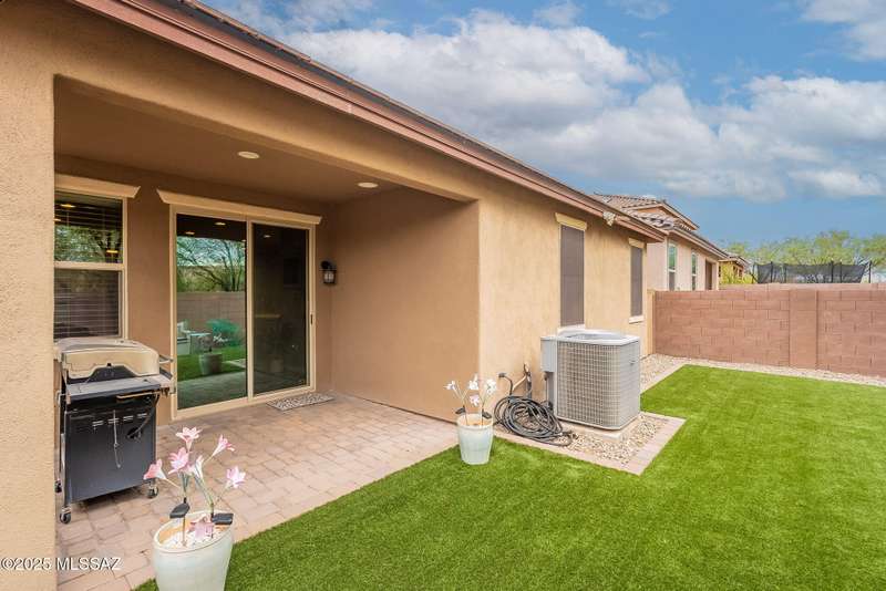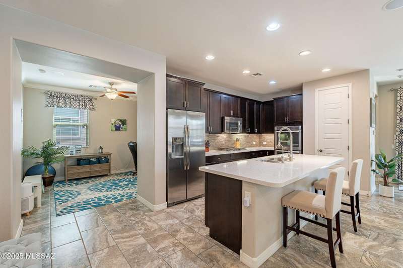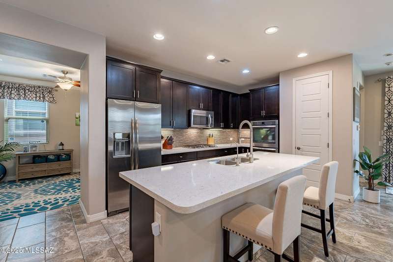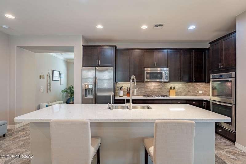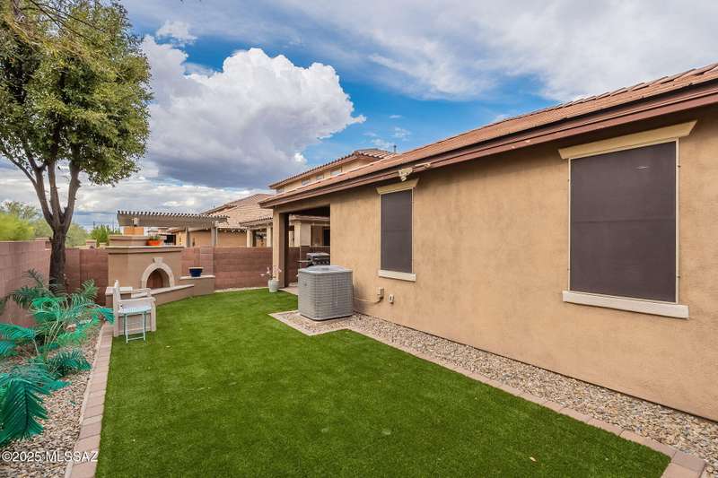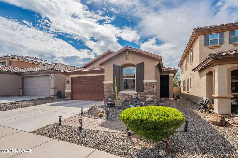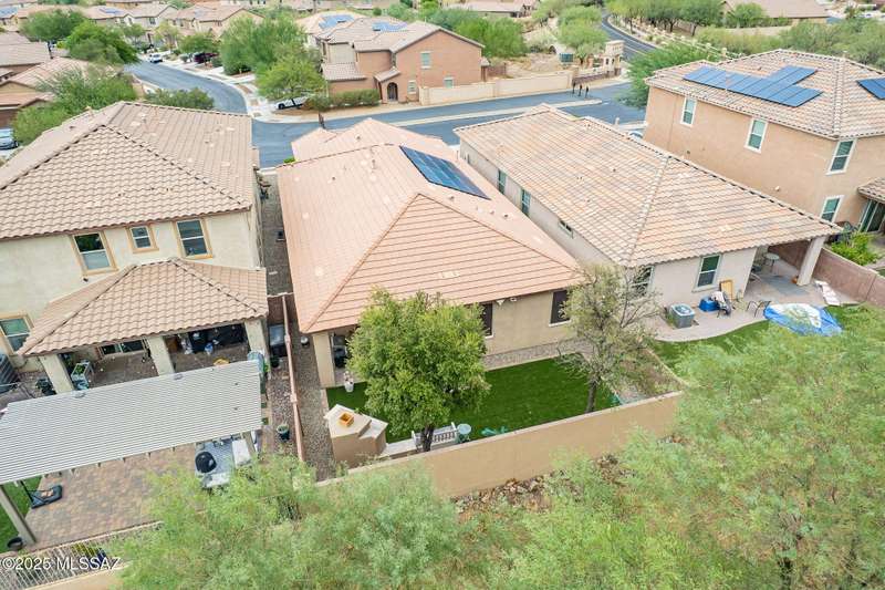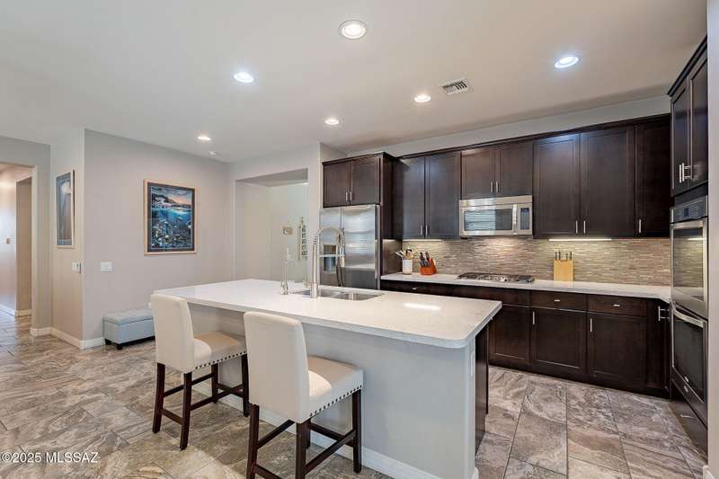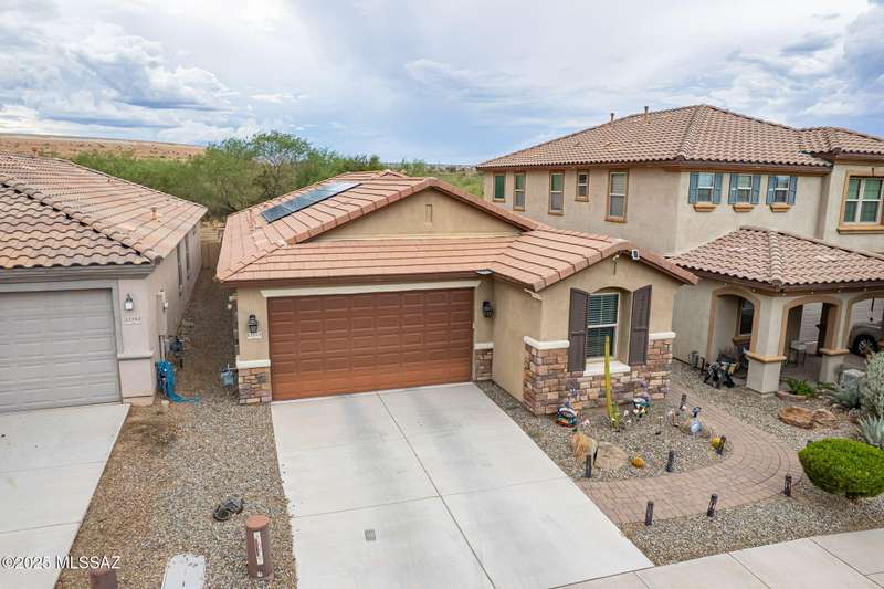 Highly upgraded property that looks like a model home in the fabulous master planned community of Rancho Sahuarita. The thoughtfully designed floorplan feels larger than the square footage! Owned 4 kilowatt solar system gives the added benefit of lower electric bills. Split bedroom plan features 3 bedrooms plus a large open den; gourmet kitchen with stainless steel appliances, gas stove top, double ovens, custom backsplash, 42'' cabinets w/ soft close drawers & pull out shelves. Large kitchen island with seating. Surround sound with volume control wall switches inside and outside. Laundry room with cabinets and washer & dryer on pedestals. Water softener, under sink water filter, upgraded flooring, and ceiling fans. Security door, alarm system and ring doorbell give you peace of mind!