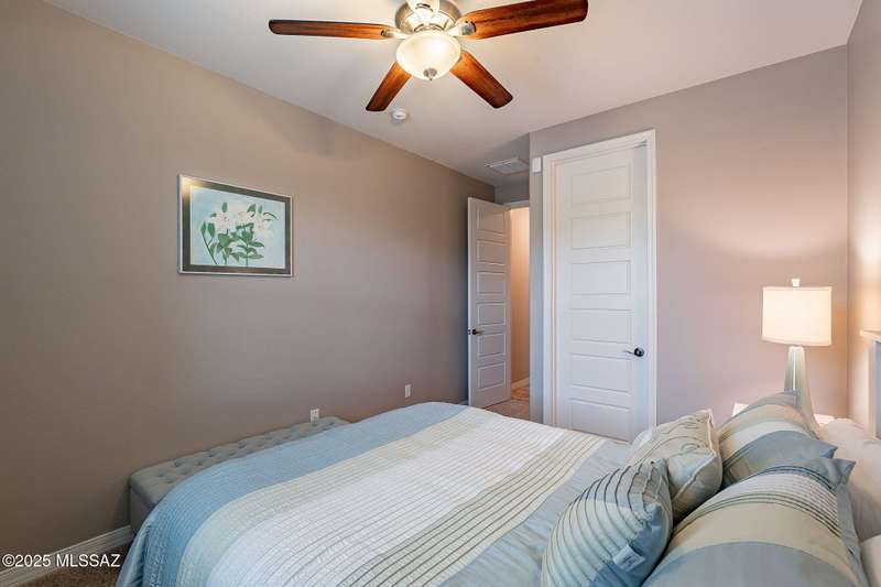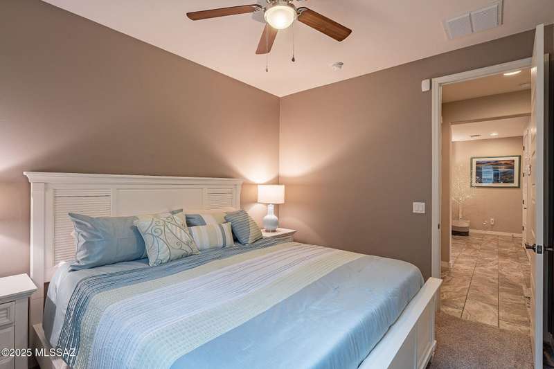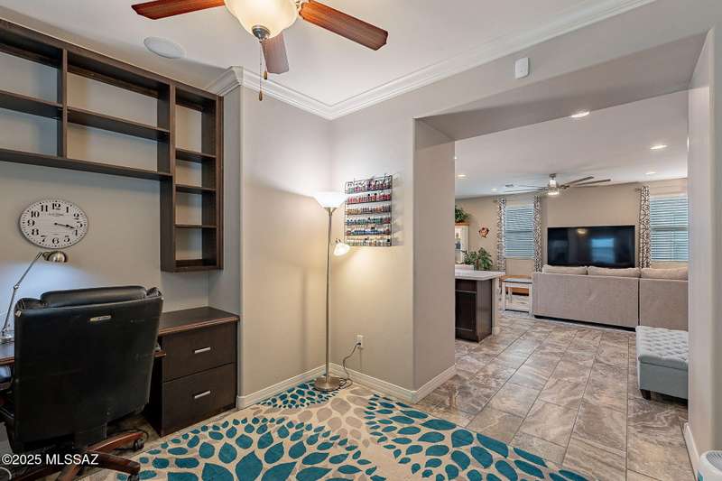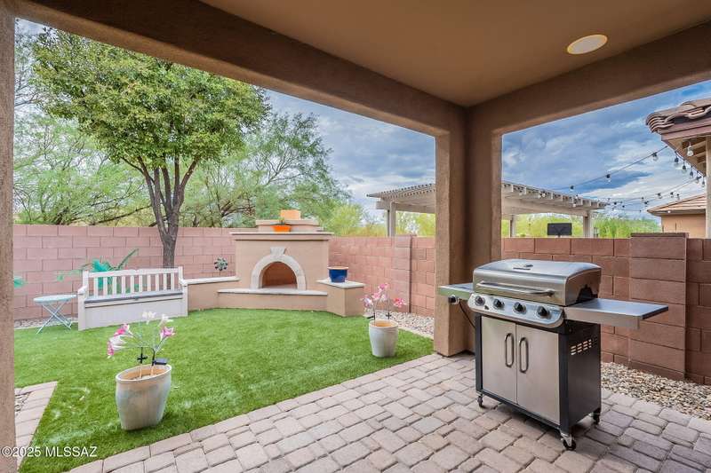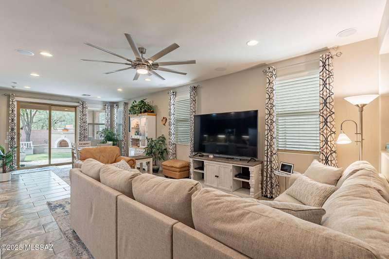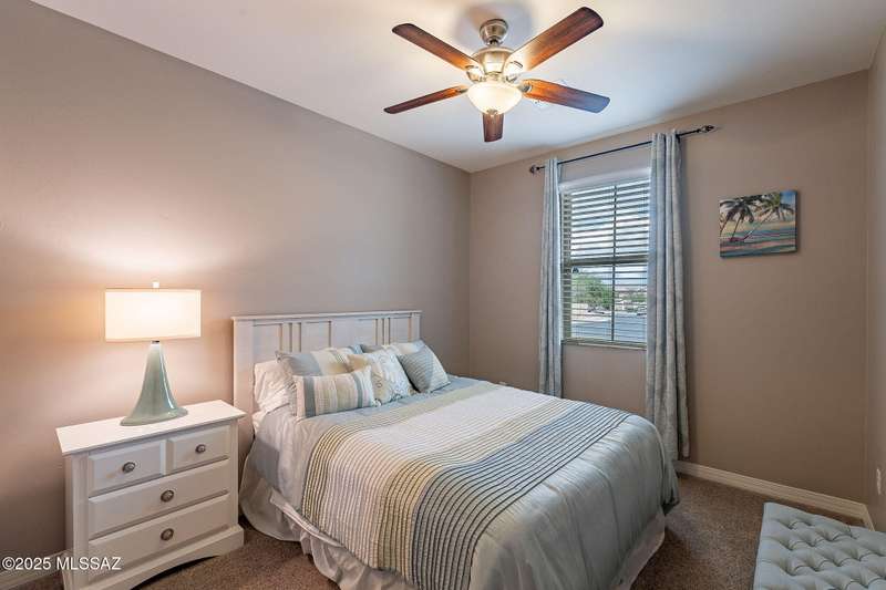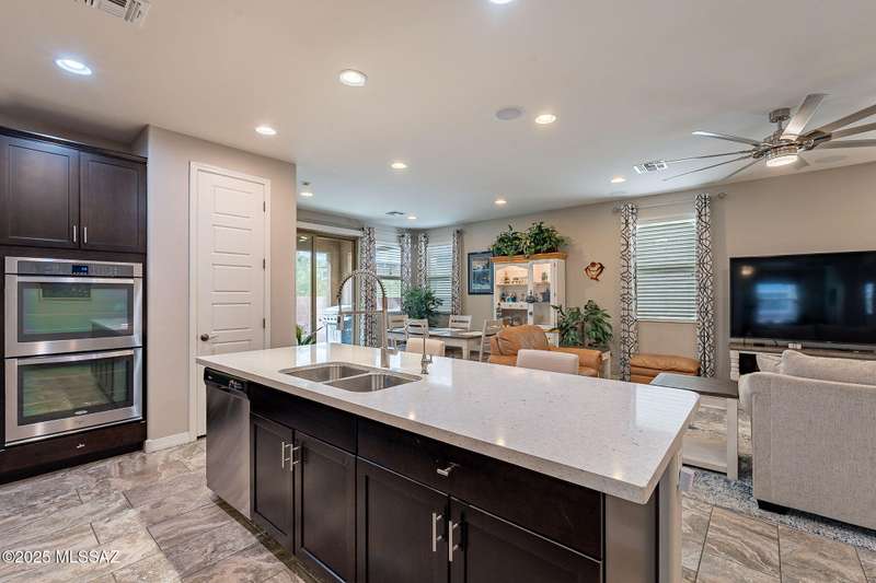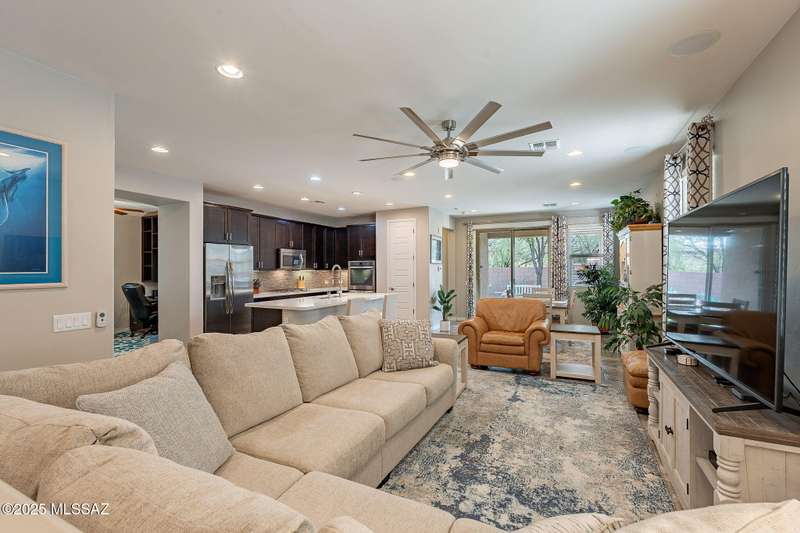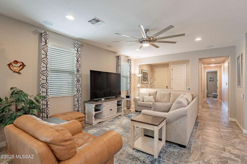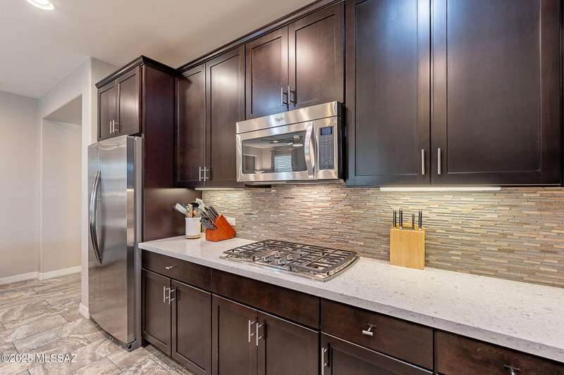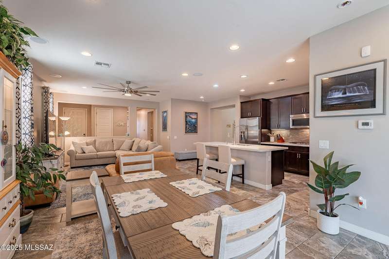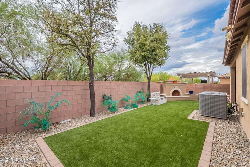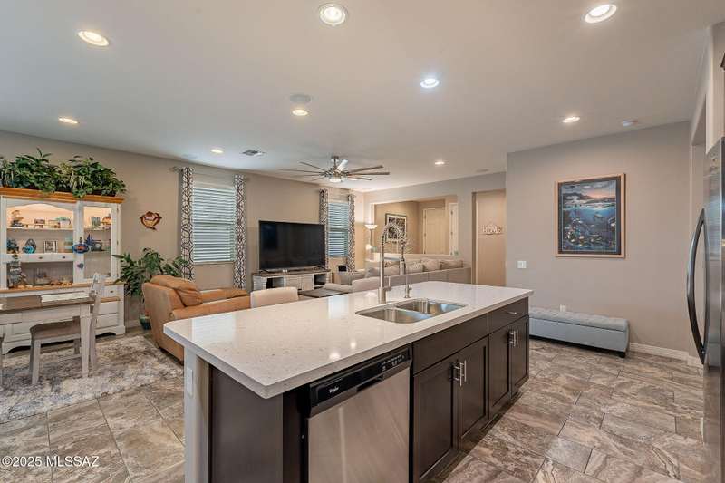 Highly upgraded property that looks like a model home in the fabulous master planned community of Rancho Sahuarita. The thoughtfully designed floorplan feels larger than the square footage! Owned 4 kilowatt solar system gives the added benefit of lower electric bills. Split bedroom plan features 3 bedrooms plus a large open den; gourmet kitchen with stainless steel appliances, gas stove top, double ovens, custom backsplash, 42'' cabinets w/ soft close drawers & pull out shelves. Large kitchen island with seating. Surround sound with volume control wall switches inside and outside. Laundry room with cabinets and washer & dryer on pedestals. Water softener, under sink water filter, upgraded flooring, and ceiling fans. Security door, alarm system and ring doorbell give you peace of mind!