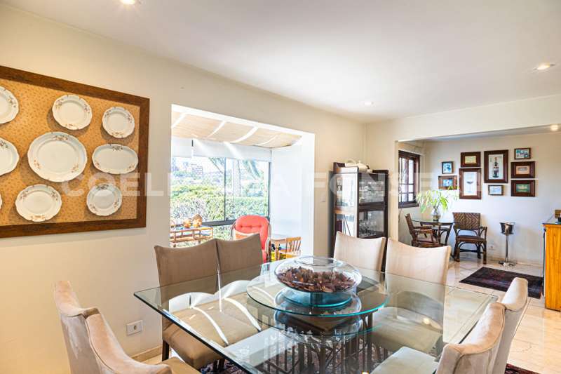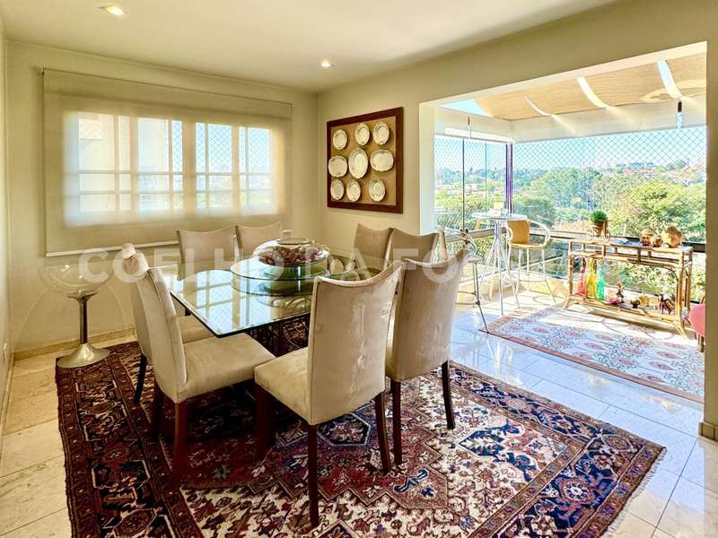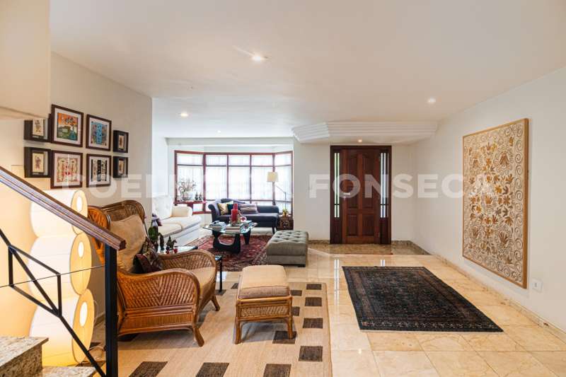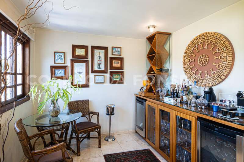Área social no piso intermediário, toda em mármore, com 2 salas de estar, sala de jantar com aconchegante varanda, bar com adega além de ampla cozinha.