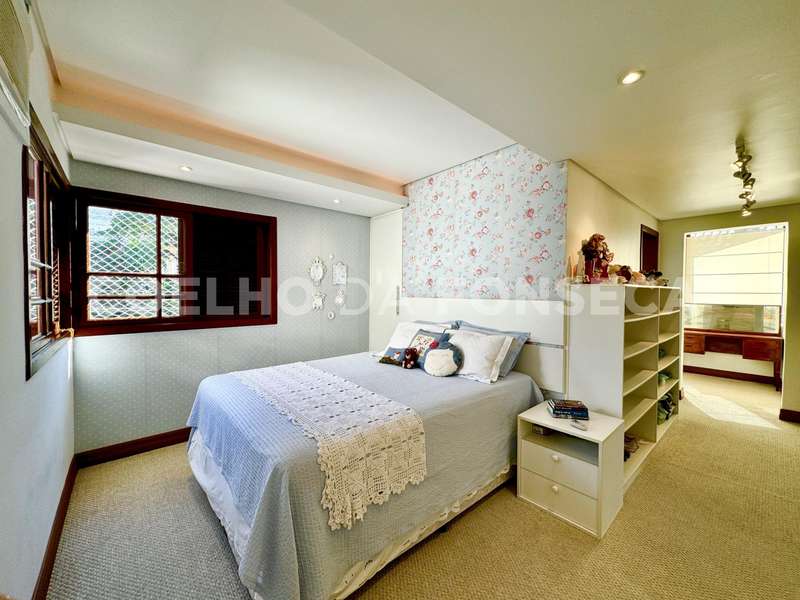 Área íntima no piso superior com 3 suítes, todas com armários e suíte master com closet e escritório.