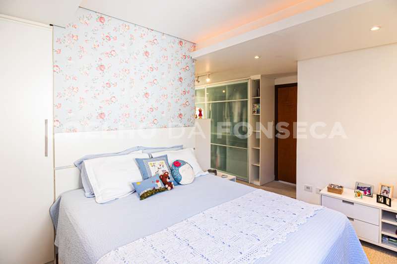 Área de lazer no piso inferior conta com sala de tv, espaço fitness, piscina e espaço gourmet com churrasqueira e forno de pizza.