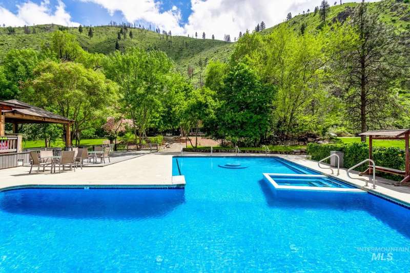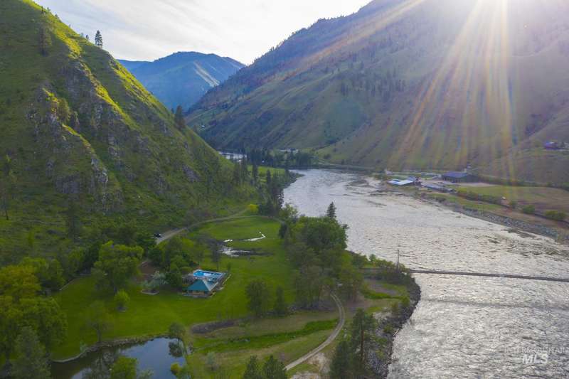 Tucked away on 155 private acres just 9 miles up Big Salmon River Road outside Riggins, Idaho, this geothermal hot springs retreat feels like its own hidden world. Cross the single-lane suspension bridge and you’re welcomed by sweeping grounds, rich with the history and character that have defined this estate for generations. At the heart of the property is a furnished three-story, 5,700 sq. ft. lodge, complemented by a separate complex featuring three 1-bed/1-bath condos. A pool house with a recreation room and additional sleeping space, plus an office with its own living quarters, round out the accommodations. The amenities are just as impressive: over a mile of Salmon River frontage, Starlink broadband internet, a spring-fed pond, a generous garden area, a greenhouse, and multiple water rights. Wildlife is abundant—elk, deer, and even the occasional bear wander through this untouched landscape. Long known for the mineral-rich, healing qualities of its geothermal waters, the property sits along the legendary Salmon River—the famed River of No Return—and enjoys easy year-round access with minimal snowfall. Price improvement reflects updates that are needed; property is being sold “as is.”