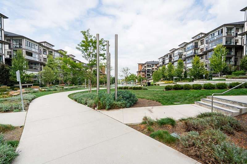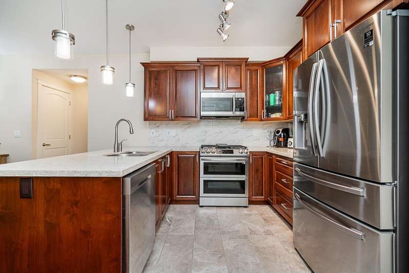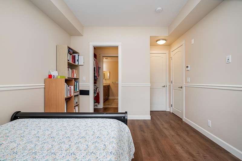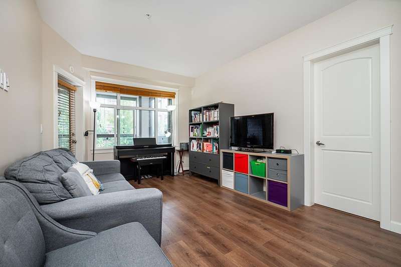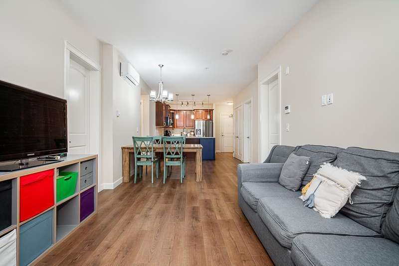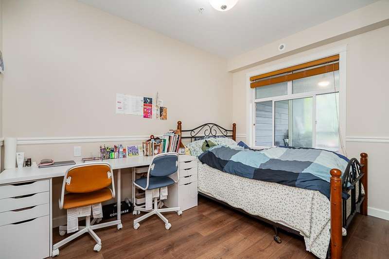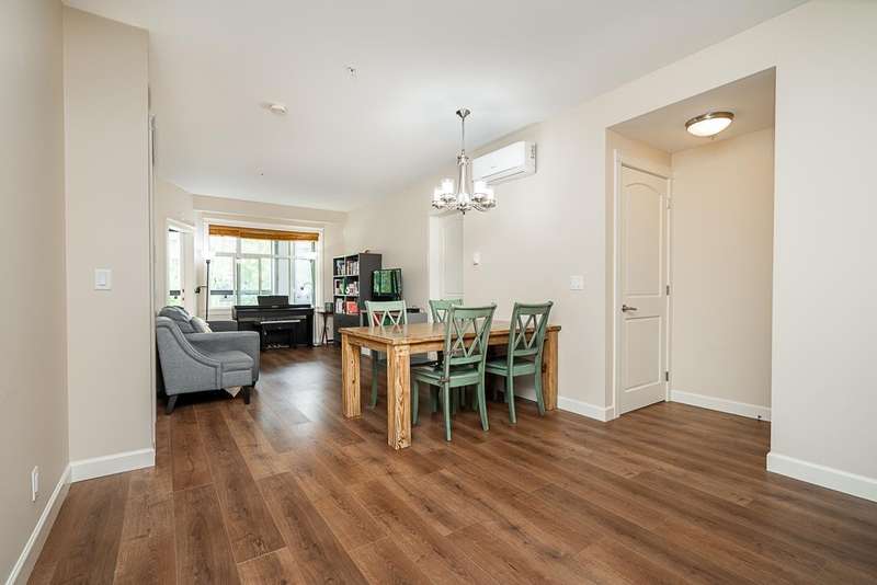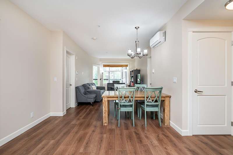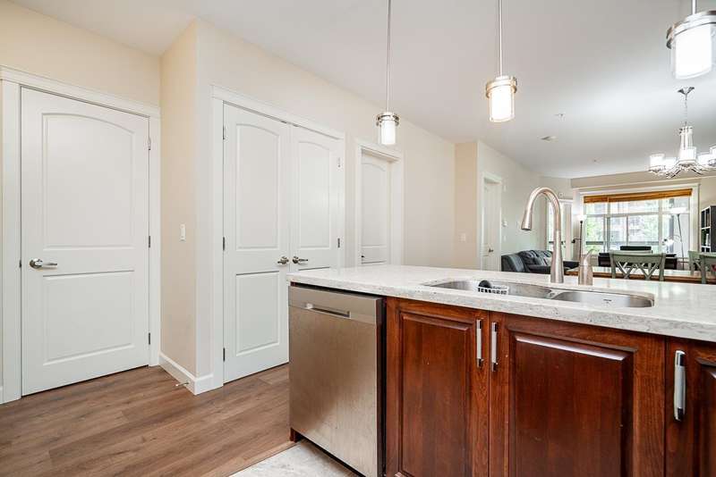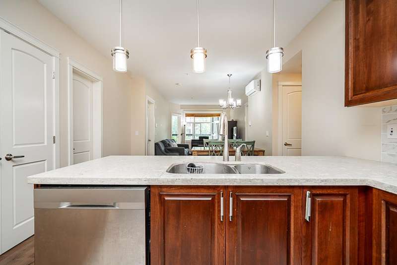 Yorkson Park - 2 Bed + 2 Bath + Den + Storage Unit. Functional layout with 2 large bedrooms across from each other- giving extra privacy, enclosed solarium with gas BBQ hook-up (gas included in strata fees), and 2 parking stalls with EV-capable rolling door storage by the parking space. Features include energy-efficient heat pump and A/C in every room, Samsung appliances, quartz countertops, heated bathroom floors with anti-fog mirrors, solid wood doors and closets, kitchen looking out to living area with ample cabinet space, European laminate flooring, Hybrid concrete and wood construction for quieter living. Convenient location across from Carvolth Park & Ride and beside the new 1.3-acre City Park. (id:58403)