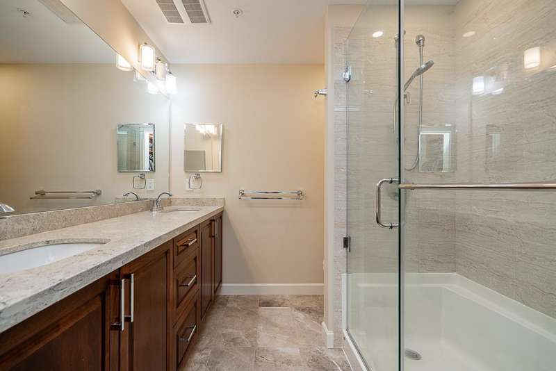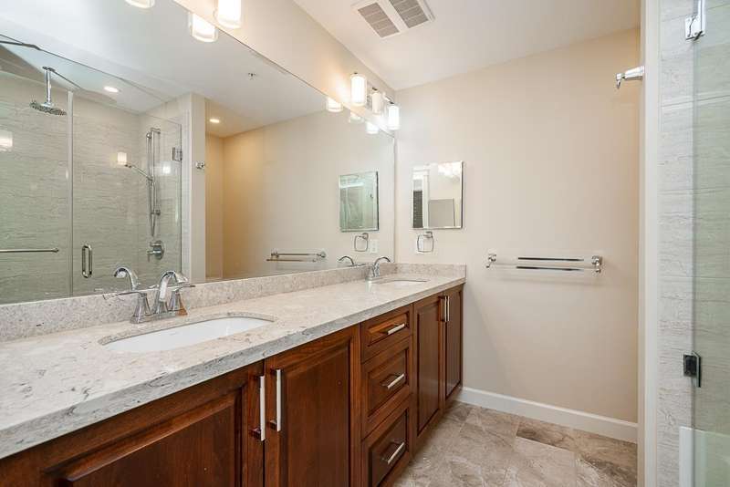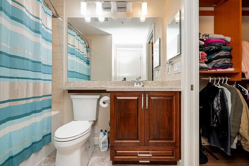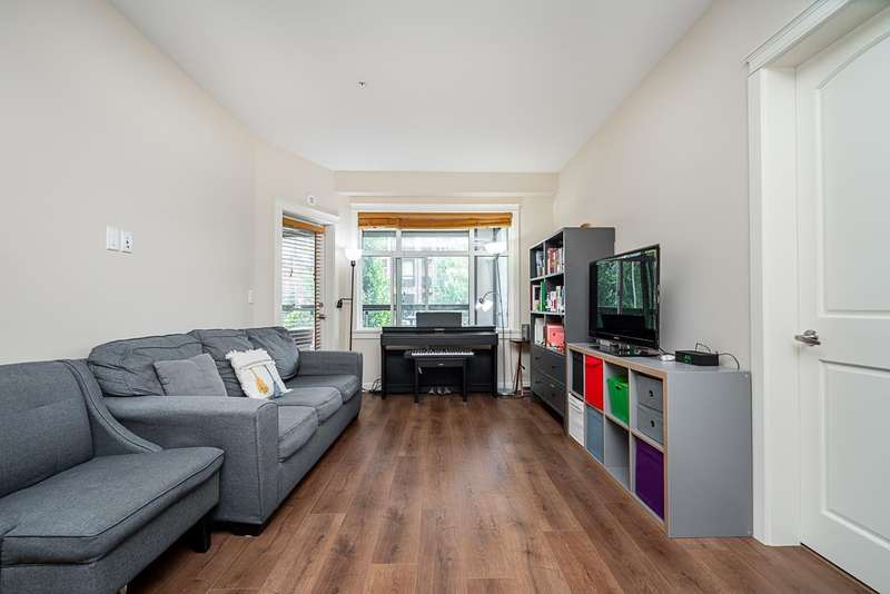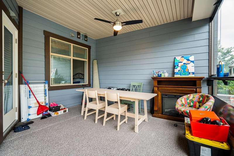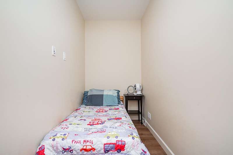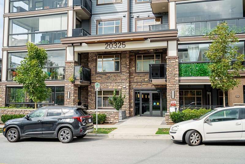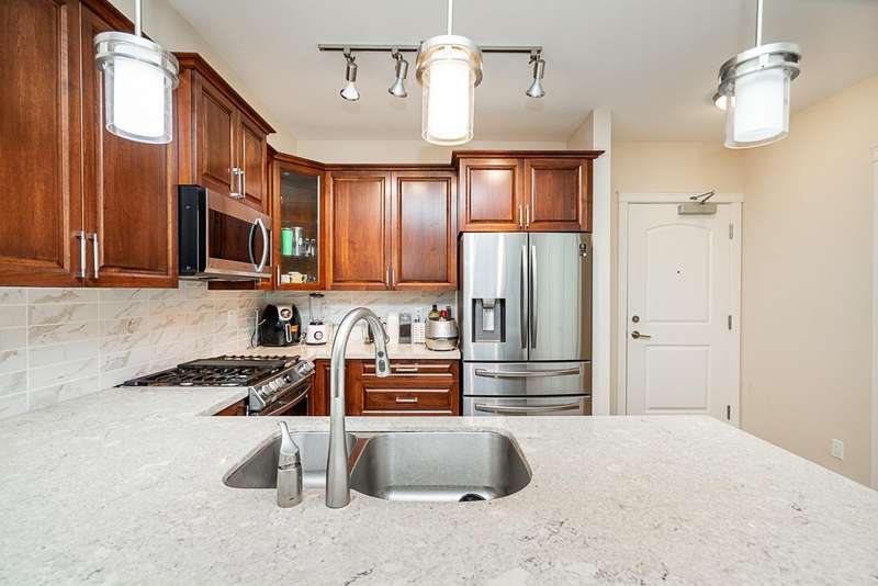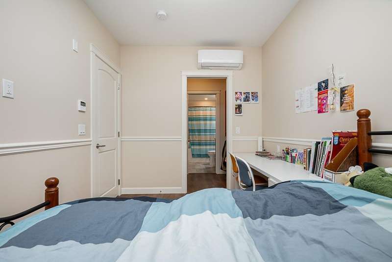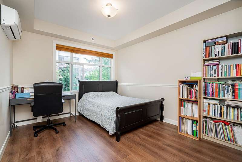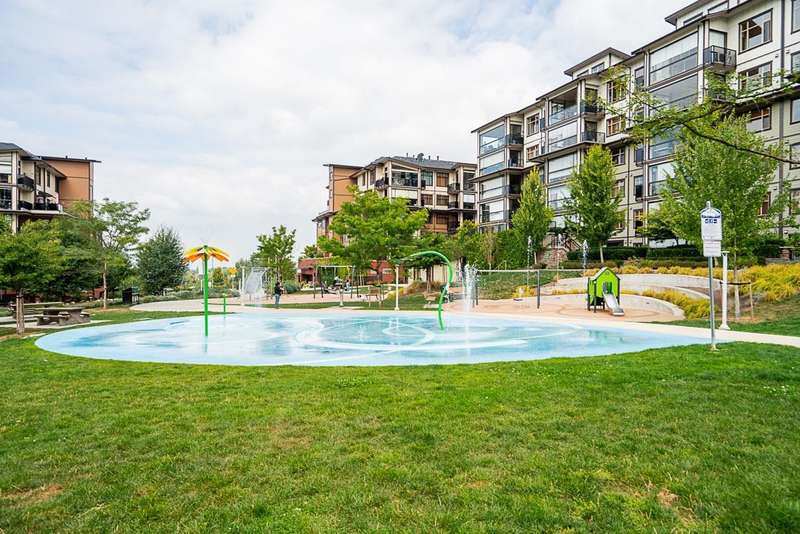 Yorkson Park - 2 Bed + 2 Bath + Den + Storage Unit. Functional layout with 2 large bedrooms across from each other- giving extra privacy, enclosed solarium with gas BBQ hook-up (gas included in strata fees), and 2 parking stalls with EV-capable rolling door storage by the parking space. Features include energy-efficient heat pump and A/C in every room, Samsung appliances, quartz countertops, heated bathroom floors with anti-fog mirrors, solid wood doors and closets, kitchen looking out to living area with ample cabinet space, European laminate flooring, Hybrid concrete and wood construction for quieter living. Convenient location across from Carvolth Park & Ride and beside the new 1.3-acre City Park. (id:58403)