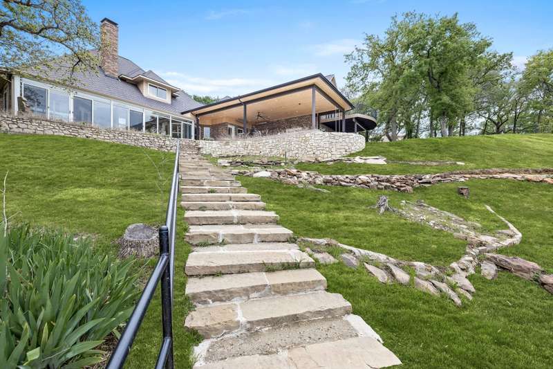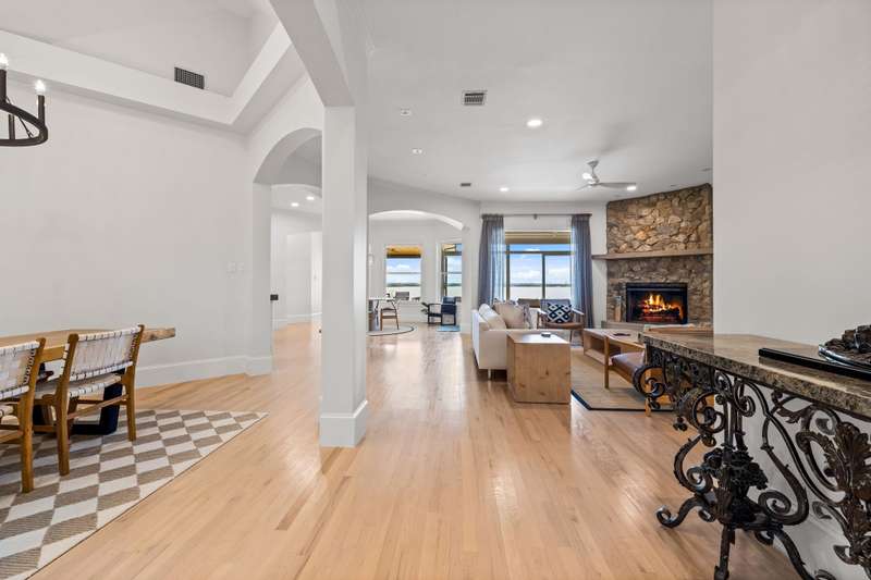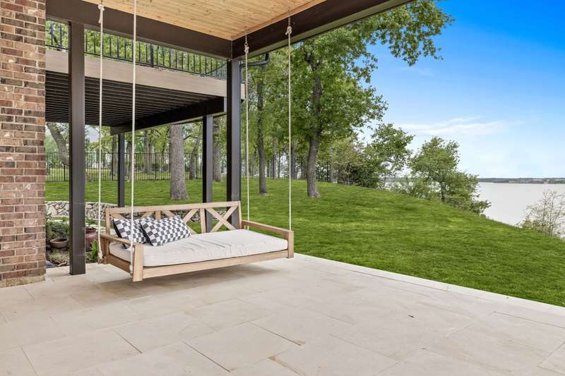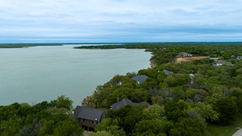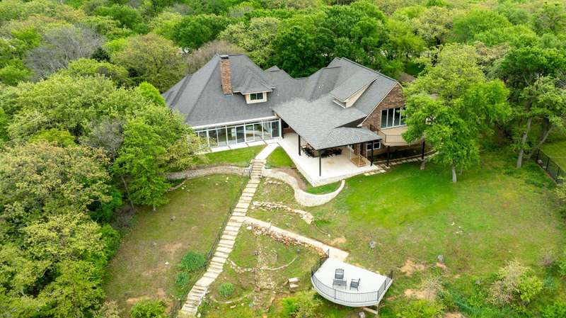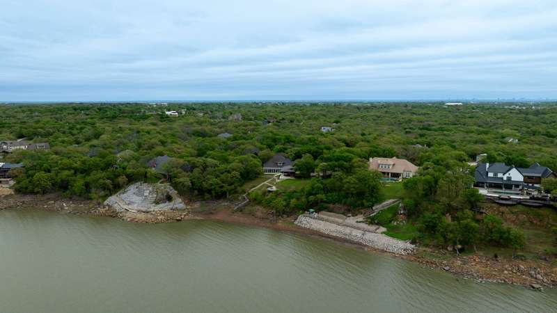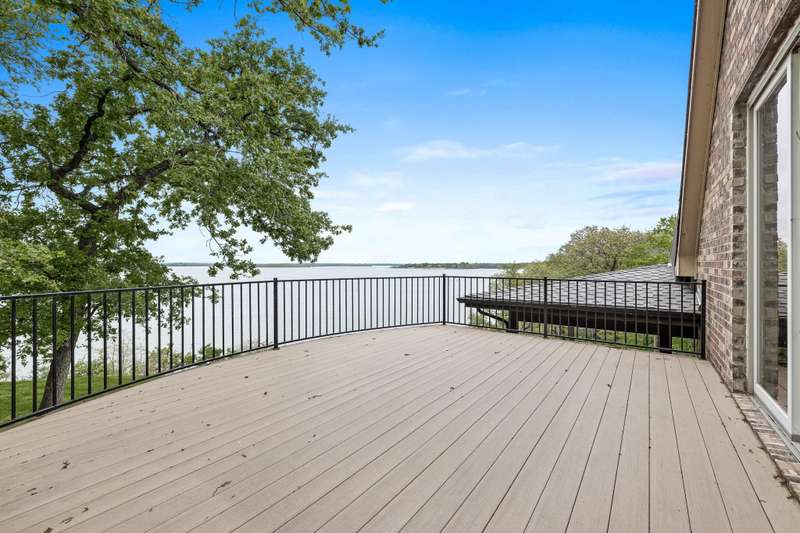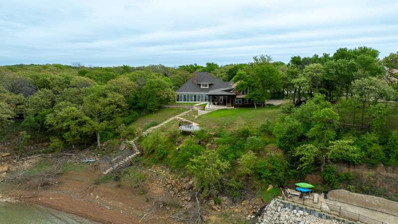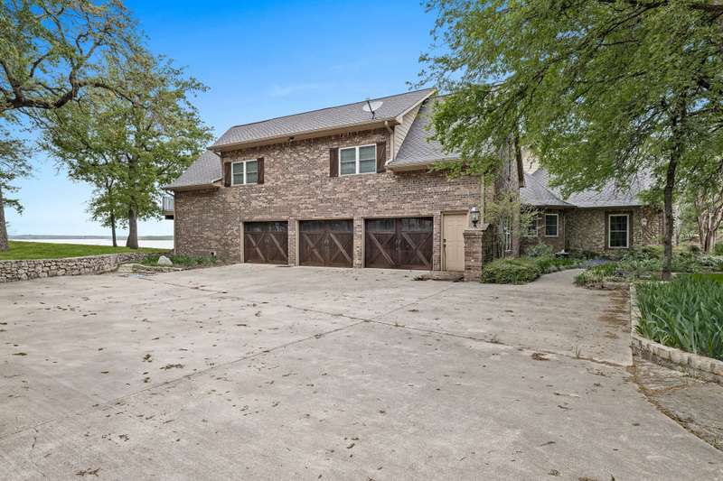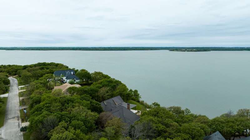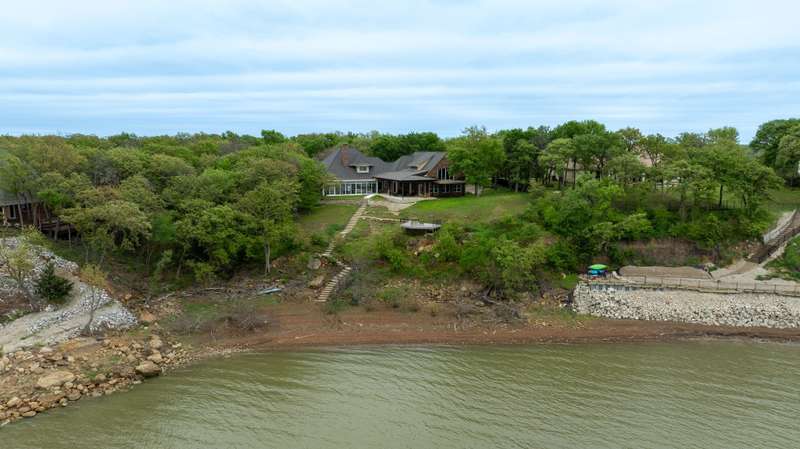 Lakefront stunner full of natural lighting, luxury details, and incredible views! Stylish dining room offers stately chandelier, high ceilings, and large windows to create airy and bright space for special occasions. Family room looks out to sparkling Lake Lewisville and offers ample room for comfortable family time, accented by wood-burning fireplace. Arched walkways lead to a gourmet kitchen, where your inner chef can enjoy the large granite-topped island with built-in JennAir cooktop and luxury stainless-steel appliances including double ovens, warming drawer, dishwasher, and microwave. Recessed ceiling adds a bit of flair to this open space, ideal for entertaining or cooking projects. Sunny breakfast nook overlooks lake and features stylish chandelier to create a cozy gathering spot. Elegant study offers floor-to-ceiling built-ins and space to spread out & create a comfortable home office. Primary bedroom is a true waterfront haven, with walls of windows overlooking lake and space for relaxing sitting area. Spa-like primary bath offers gorgeous soaking tub and extra features like dual vanities, large standing shower, and 2 walk-in closets. Secondary bedrooms offer walk-in closets and baths, perfect for families or guests. Enormous game room is made for hosting, with wall of built-ins for storage and generous room for pool table, crafting, and big screen for movie nights. First floor exercise room boasts gorgeous lakeside oasis views and ample room for exercise machines, weights, and yoga. Massive enclosed sunroom gives incredible outdoor views in comfortable setting, with plenty of space for seating and entertaining. Expansive covered & newly constructed patio offers amazing views. Additional features include newly constructed floating deck close to water and upstairs deck, multiple staircases, stone steps to lake, and boat.