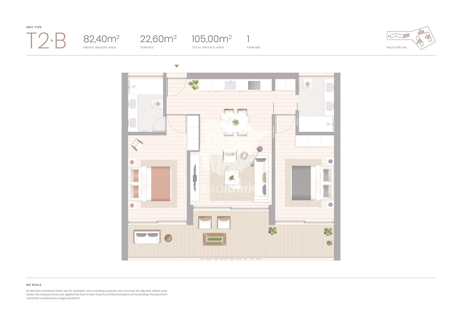 It consists of an open space that includes a living and dining area and kitchen, a suite, a second bedroom and a bathroom.