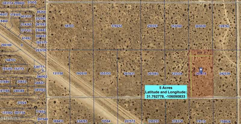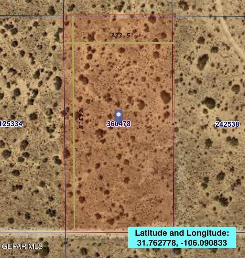 Undeveloped 5 acres for sale. Currently no zoning restrictions which allows you the freedom to do what you wish with this large parcel of land. Perfect for any immediate plans you may have or as a buy-and-hold investment. You will be hard pressed to find any other land of this size for this price anywhere in El Paso. Use the following Geo-coordinates to locate the land in mapping software such as Google Maps: 31.762778, -106.090833