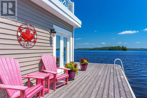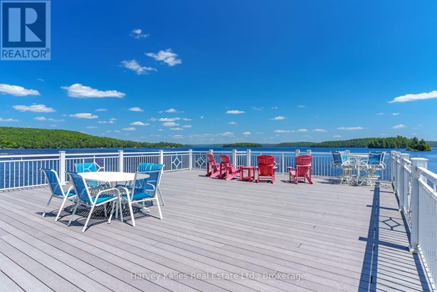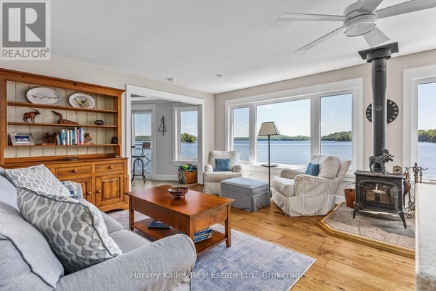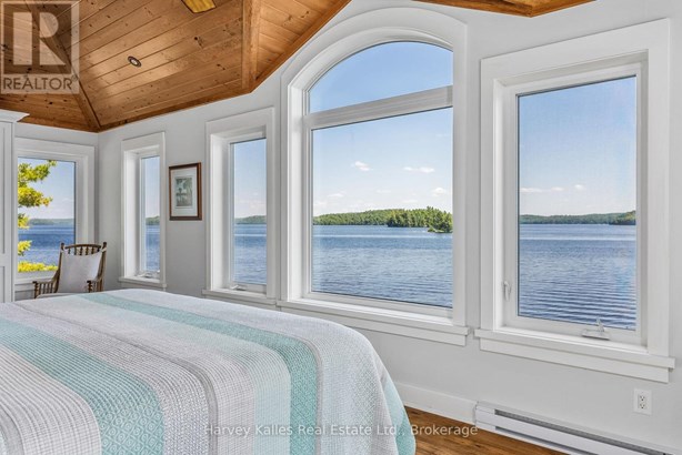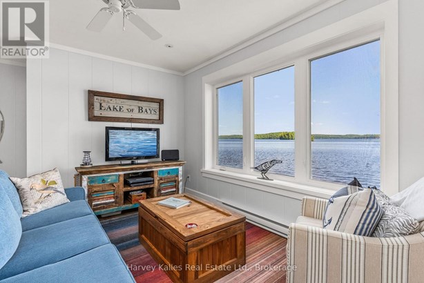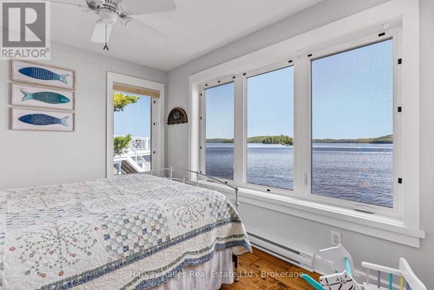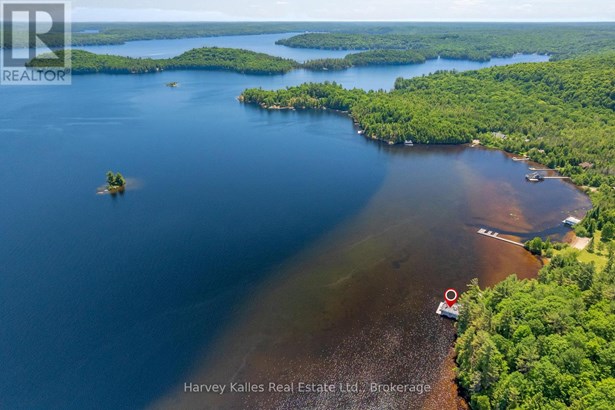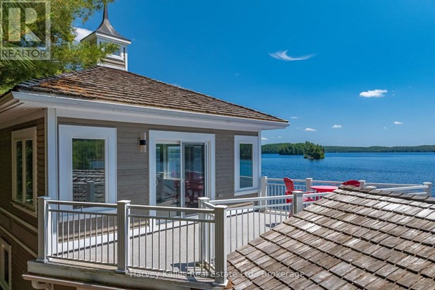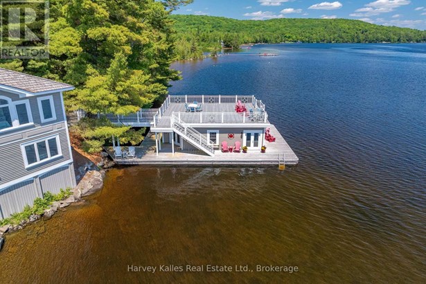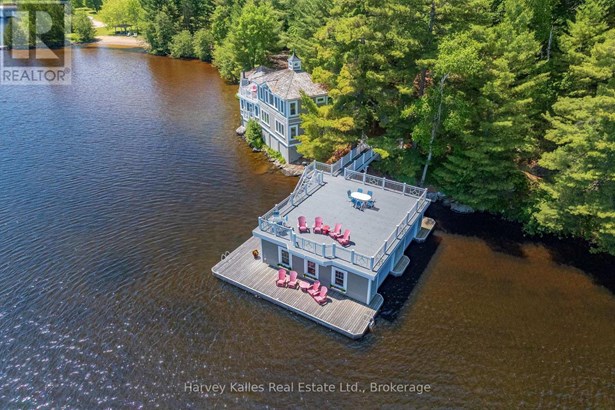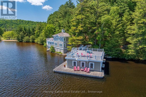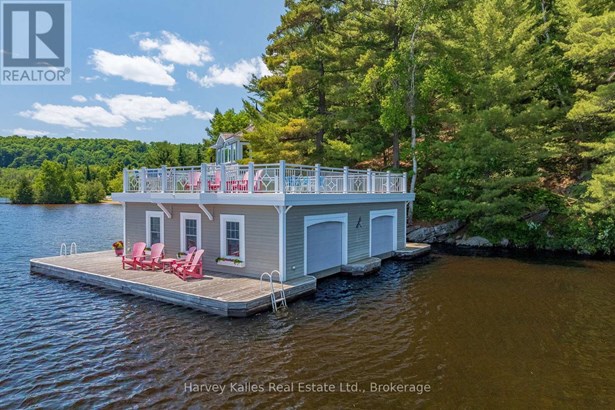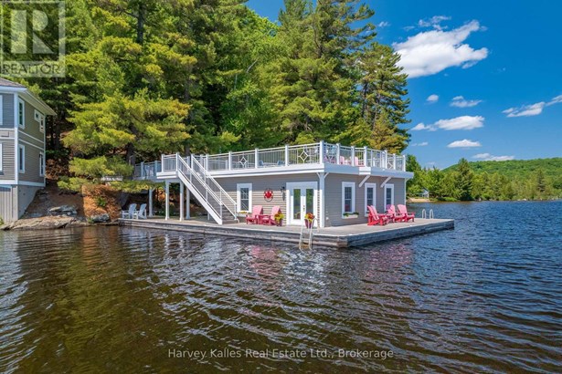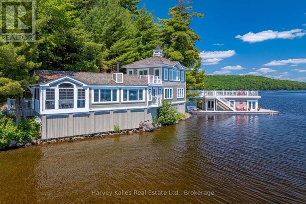 This extraordinary property spans 6.85 acres, featuring an impressive 573 feet of pristine, south-facing shoreline, offering a singular opportunity to experience waterfront living like never before. Ideally situated just feet from the water's edge, this beach house cottage is a true lakeside haven. Designed to maximize lake views from every angle, the interior features a modern kitchen, two living room spaces, and a large enclosed Muskoka room-perfect for gatherings, relaxation, or simply taking in the beauty of the surroundings. The property comes turn-key, with most furnishings included, allowing for an effortless transition to your new lakefront lifestyle. One of the standout features is its stunning primary suite, occupying the entire second level. This sanctuary features a 3-piece ensuite bathroom, a private deck, and breathtaking long lake views. Two guest bedrooms on the main floor offer bright, comfortable accommodations, ensuring that family and friends can fully enjoy their stay. Just steps away, the two-slip boathouse awaits, complete with a substantial composite sun deck ideal for entertaining, sunbathing, or simply enjoying the incredible views. On the opposite side of the cottage, a perfect beach area and a flat grassy space provide ample room for swimming, games, and outdoor fun, ensuring enjoyment for all ages with a gentle sandy entry to the lake. Lake of Bays, one of the largest lakes in the region, offers a vast shoreline waiting to be explored. With convenient access to boat launches and marina services, every day can be an adventure. Properties like this, with unique proximity to the water, expansive land, and comprehensive features, are few and far between. (id:16999)