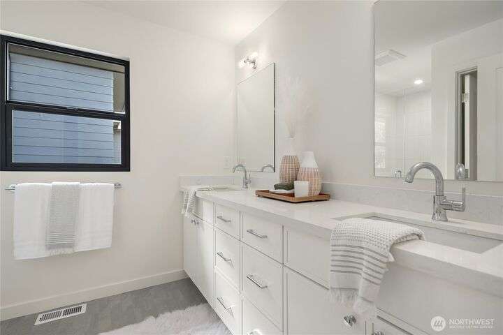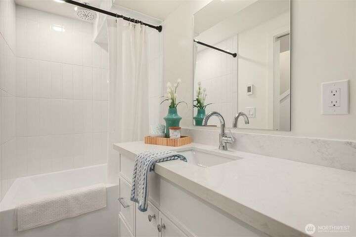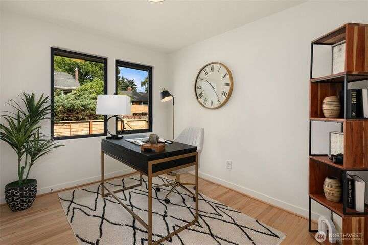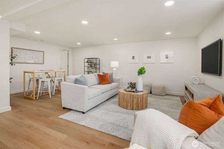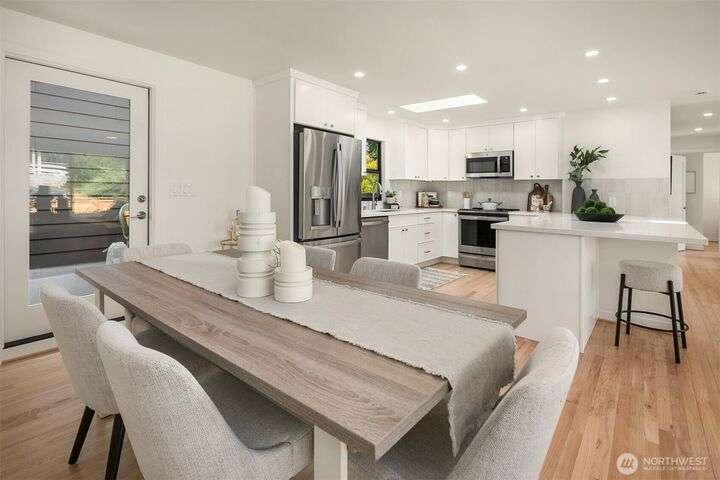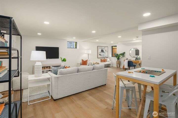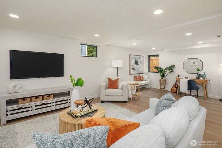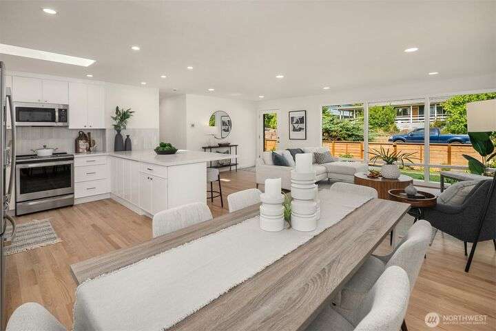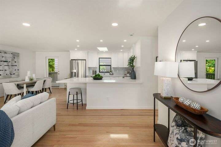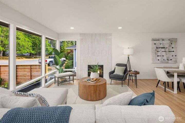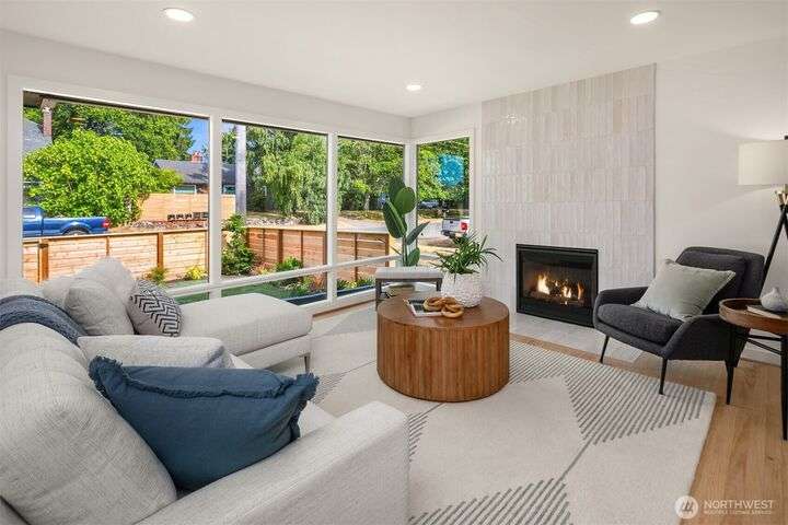 Beautifully remodeled 4-bedroom home in Seattle’s Bitter Lake neighborhood blends modern updates with classic charm. The spacious main level features an open-concept living and dining area with new hardwood floors, a gorgeous tiled gas fireplace, and abundant natural light. The new kitchen boasts quartz countertops, stainless steel appliances and stylish cabinetry. Four generous bedrooms offer flexible living, work-from-home, or guest space. Lower level rec room and laundry area. Enjoy new bathrooms with heated floors, new systems, new windows and thoughtful finishes throughout. One car attached garage. Convenient location near Bitter Lake Park, trails, shopping, and easy commuter access. Move-in ready and full of possibilities!