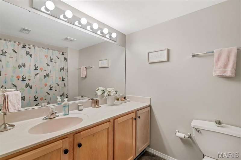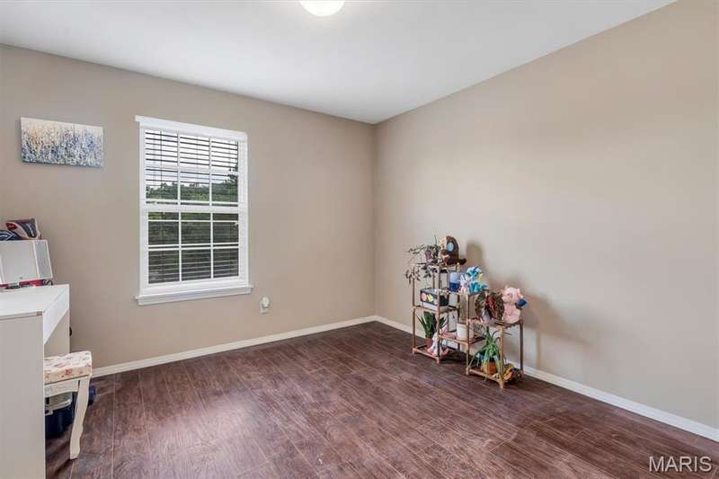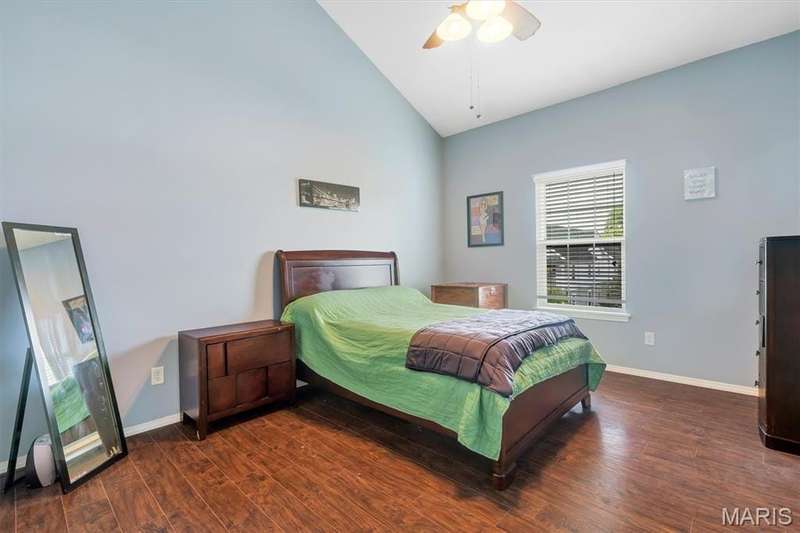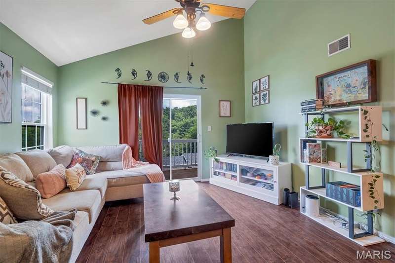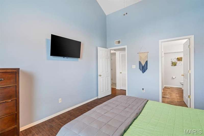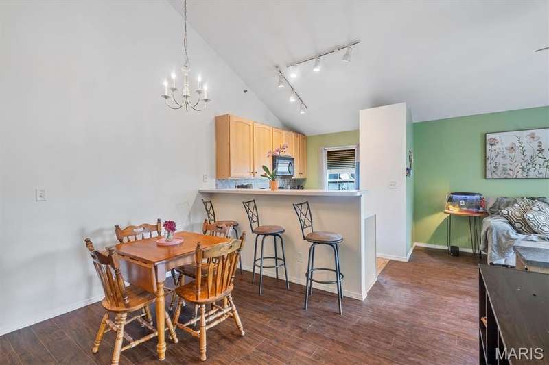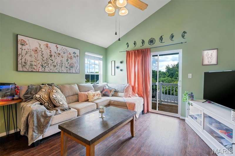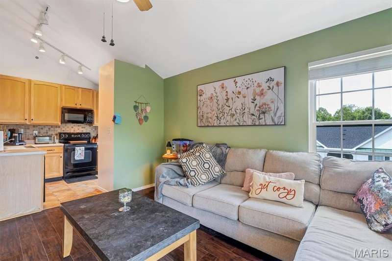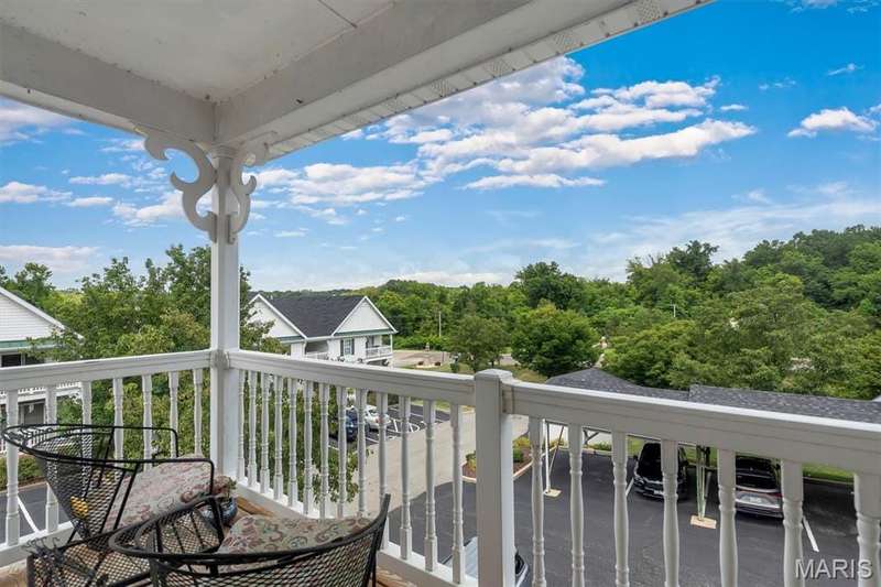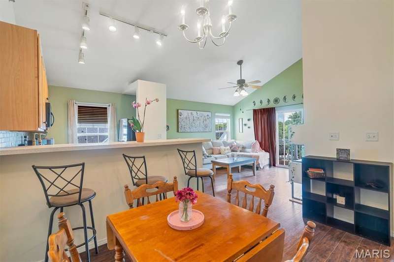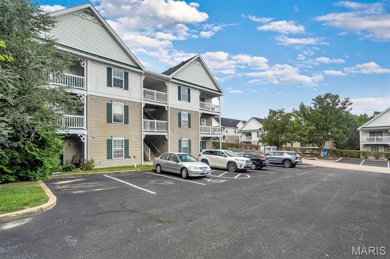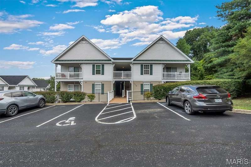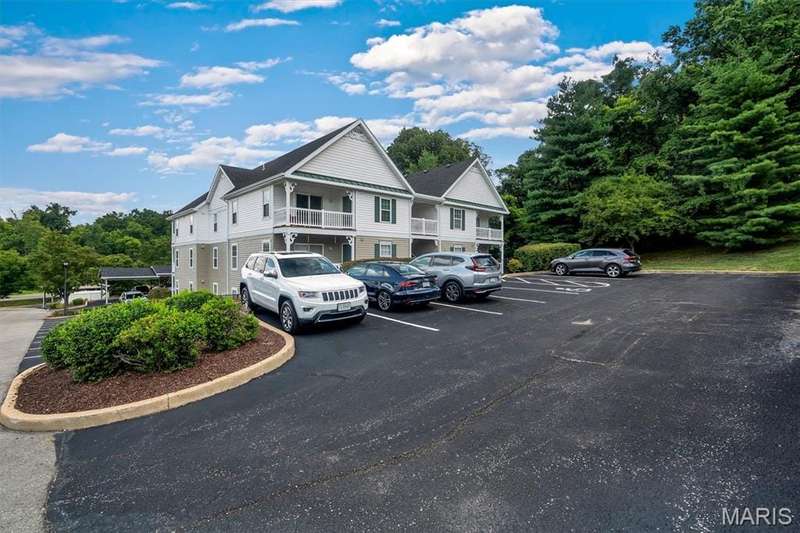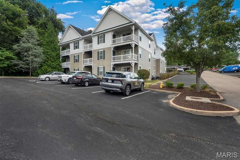 Comfort and convenience are featured in this open floor plan with soaring vaulted ceilings that create a spacious and airy feel. Gorgeous laminate wood flooring flows seamlessly through the living room, dining area, and both bedrooms. Enjoy a desirable split-bedroom layout offering privacy, with two full bedrooms and two full bathrooms. The large primary suite boasts a luxurious en-suite bath with a double-sink vanity, ample drawer space, a linen closet, shower, and a huge walk-in closet. The kitchen shines with ceramic tile flooring and backsplash, and the refrigerator stays! The inviting living room opens to a covered deck with an extra outdoor storage closet, perfect for relaxing or entertaining. Located on the upper floor, a balcony with a view. Additional features include in-unit laundry with a stackable washer and dryer included. The HOA includes water, sewer and trash. New roof - 2025. Conveniently located in the highly sought after Parkway School District, near restaurants, shopping, and entertainment. Don't miss this opportunity!