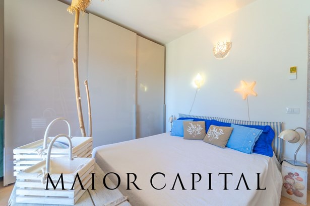 At the entrance, a spacious covered veranda invites you to relax outdoors, providing the ideal place to enjoy sunny days and summer evenings with a unique view of the garden and the sea. Inside, the living area features a spacious living room with a fully equipped kitchen, bright and airy, perfect for entertaining guests or relaxing with the family.