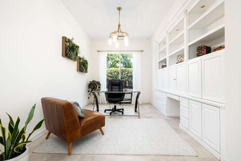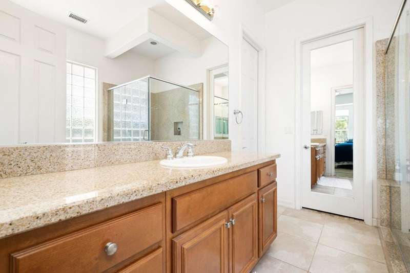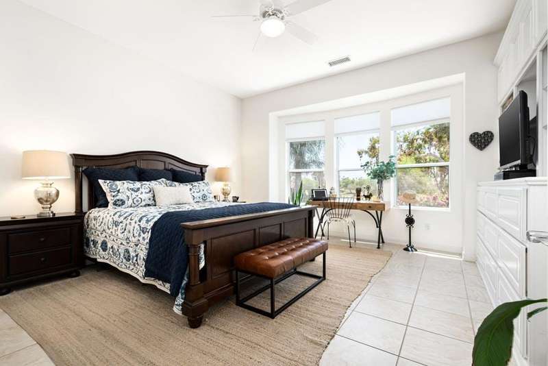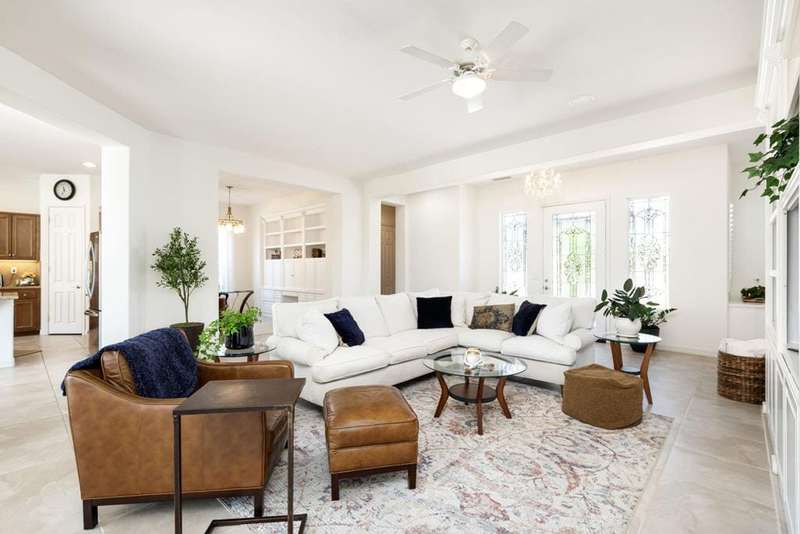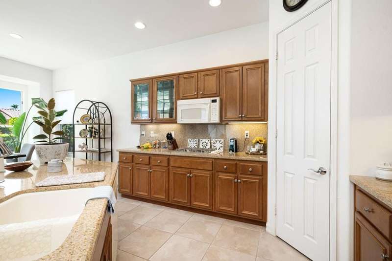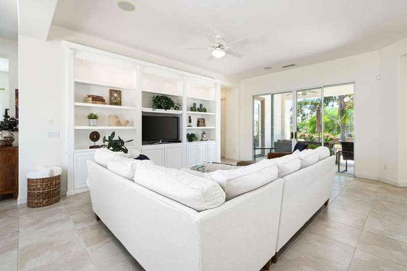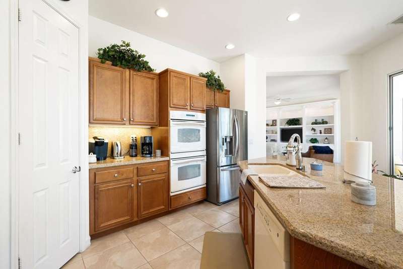 Experience the epitome of luxury living with this stunning Cassius plan, ideally situated above and behind the 11th par 3 hole, offering breathtaking views of the fairway, greens, and majestic mountains. This single-family residence, designed with a Tuscan facade and southern exposure, spans 2,216 square feet and features 2 bedrooms, 3 baths, with an option for a third bedroom. Elegantly upgraded, the home boasts a gorgeous glass-etched front door with side panels, built-ins with shelves and downlighting in the great room, dining area, and master retreat. The expansive great room opens seamlessly to the rear yard, while the kitchen impresses with slab granite counters and backsplash, a prep island, double ovens, gas cooktop, walk-in pantry, and a cozy nook for morning coffee. The guest bedroom offers a private bath with a shower-over-tub configuration, ensuring privacy and comfort for visitors. The spacious primary retreat is highlighted by a bay window and an en suite bath featuring slab granite counters, a large shower enclosure with bench seating, dual vanities, and a decorative glass block accent wall. Additional amenities include a den/office, formal dining room, surround sound, custom valances, an indoor laundry room with deep sink and cabinetry, and a covered patio perfect for entertaining, all while enjoying the stunning mountain and golf course views. A separate golf cart garage completes this exquisite home. Don't miss the chance to see this one up close!