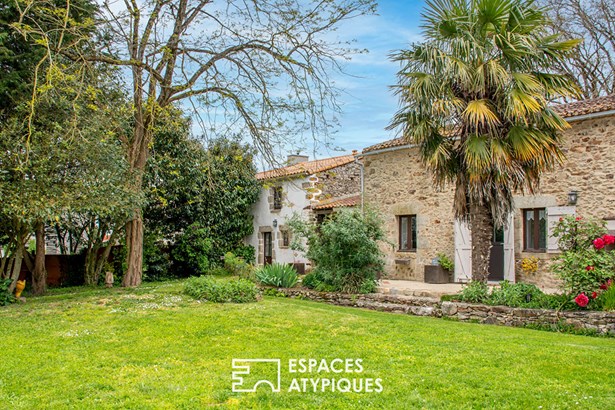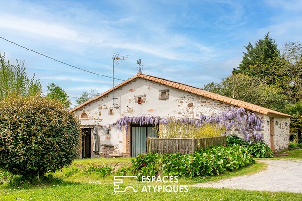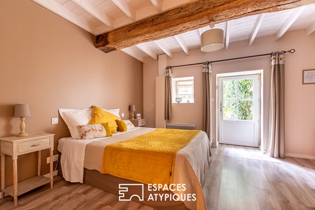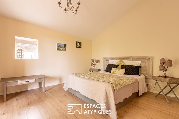The main house opens onto a beautiful entrance that bears witness to its history, with a master suite on the ground floor, a dining/living room with its cozy fireplace, and a kitchen opening onto the nature with a wood-burning stove. Upstairs, three bedrooms, a bathroom, and a large landing complete the property. The barn, renovated into a gite, is distinguished by its through-light and its beautiful volumes. It includes a large living room with a fitted and equipped kitchen, three bedrooms, and two bathrooms, providing an ideal space for hosting guests. Independent and full of charm, the annex housing the guest room consists of a bedroom with a shower room on the ground floor, as well as a mezzanine converted into a dormitory.