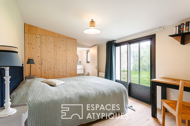 In the second part of the property, there are the common living areas: a living room, a dining room and a kitchen with a breathtaking view of the terrace and the garden without any vis-a-vis. A complete master suite on one level provides comfort for living there year-round or as a quality second home.