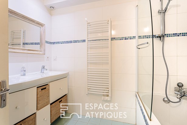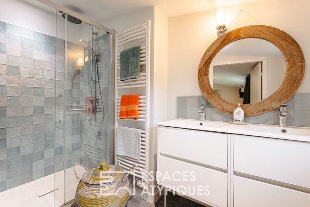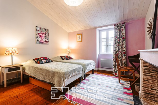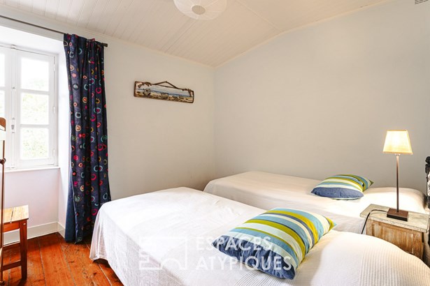 The first house opens onto a first living space with a convivial room, two bedrooms, one with a mezzanine, ideal for children, a bathroom and a toilet. A storage space, perfect for storing bicycles, allows for practical daily life.