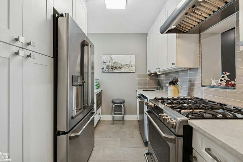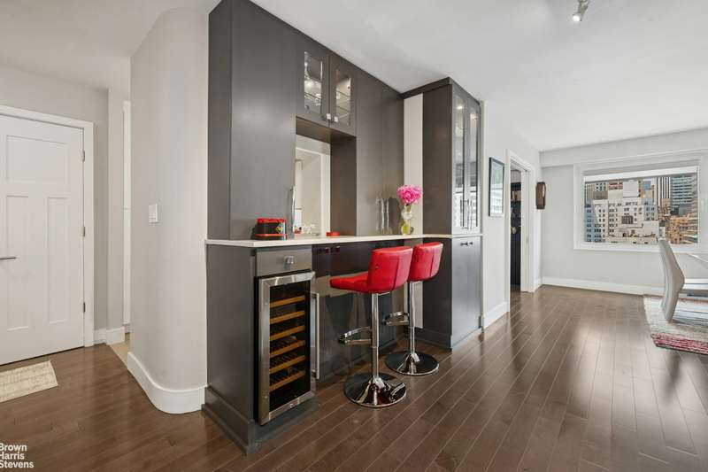 Prepare gourmet meals in the high-end chef's kitchen that overlooks the Chrysler building, equipped with custom cabinetry, countertops and backsplash, a pantry with slide-out shelves, and suite of stainless steel appliances including a stove with vented hood, double-door refrigerator with a built-in cafe /ice machine, dishwasher and microwave. Adjoining is a convenient bar/serving area with counter seating, a wine fridge, and custom display shelves.