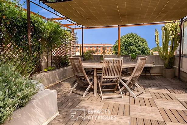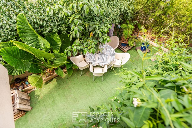 The surprise continues outdoors: a 60 m2 roof terrace, fully fitted with an elegant pergola, stainless steel outdoor kitchen, and planted planters. A true open-air living space, it enjoys optimal sunshine and increased autonomy thanks to the ecological installation of 8 solar panels.