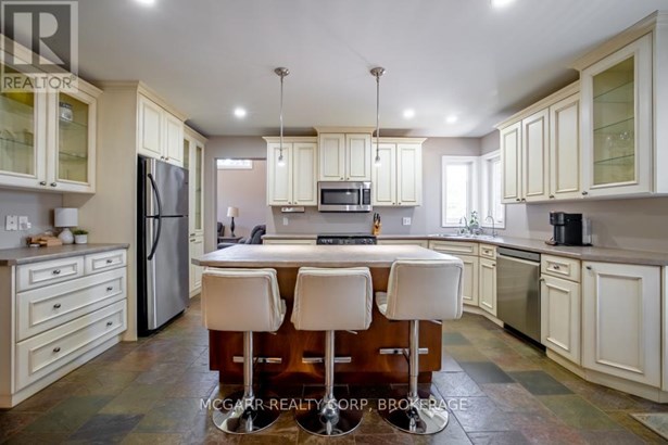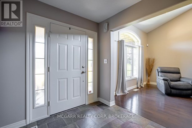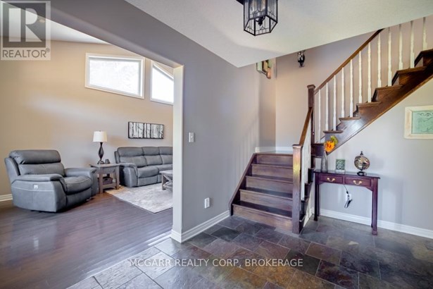Come home to 38 Nicholas and enjoy all that it has to offer. The spacious double driveway leads to the double garage with an inside entrance. The front walkway and patio invites you to enter the very large foyer with slate floors that flow through to the powder room and in home office or mud room. The 29ft long living room has a vaulted ceiling, gas fireplace, and lots of natural light. You could do a combo living and dining. The family size kitchen features a sit at island and many cabinets with good counter space. The formal dining room could also be a family room. The door from the kitchen leads to a very spacious deck and fully fenced pool size lot with a vinyl shed with concrete pad. The hot tub can stay if wished. The upper level features 3 bedrooms and 2 bathrooms. A 4pc services the two carpeted bedrooms. The primary suite with bamboo floors has a walk-in closet and large 4pc ensuite with large jetted tub and a large separate shower. The lower level has a large family room with a thermostat controlled gas fireplace. If you need more bedrooms there is space for another one plus a R.I. bathroom. Extras include alarm system, water back flow in the wine cellar. R.I. for 4th bathroom, hard wired for smoke and carbon monoxide detectors, sump pump and reverse osmosis water filter. Seller is flexible on closing and can accommodate a quick closing.