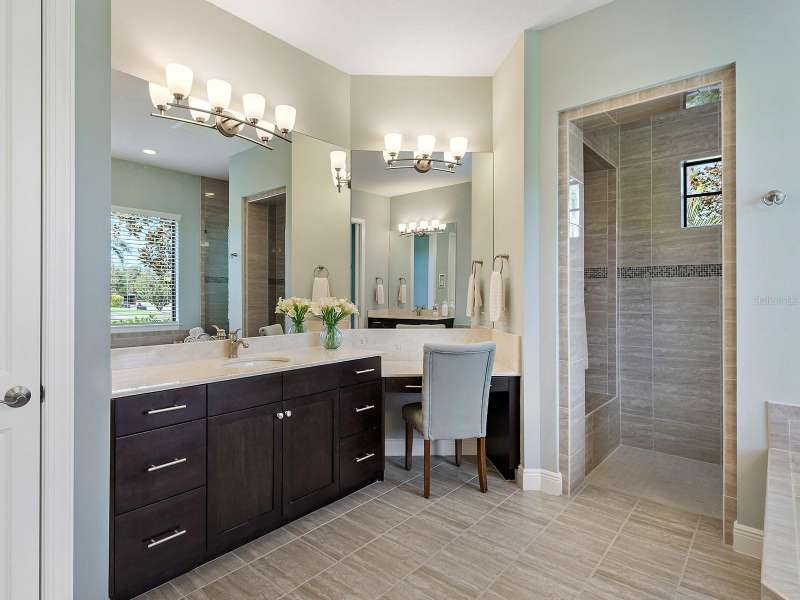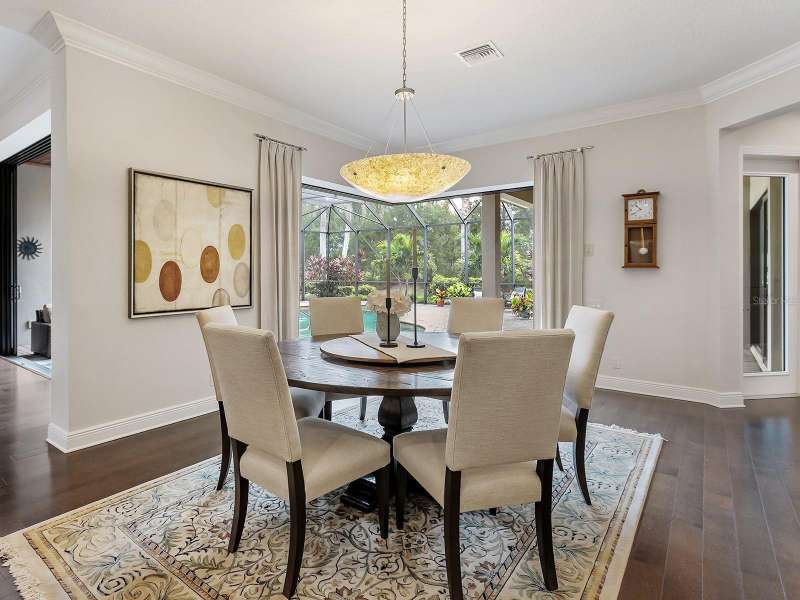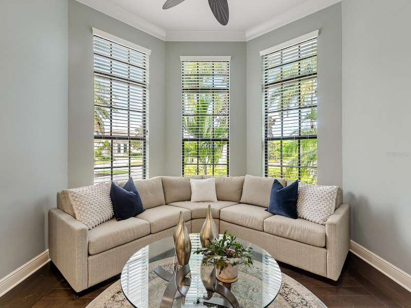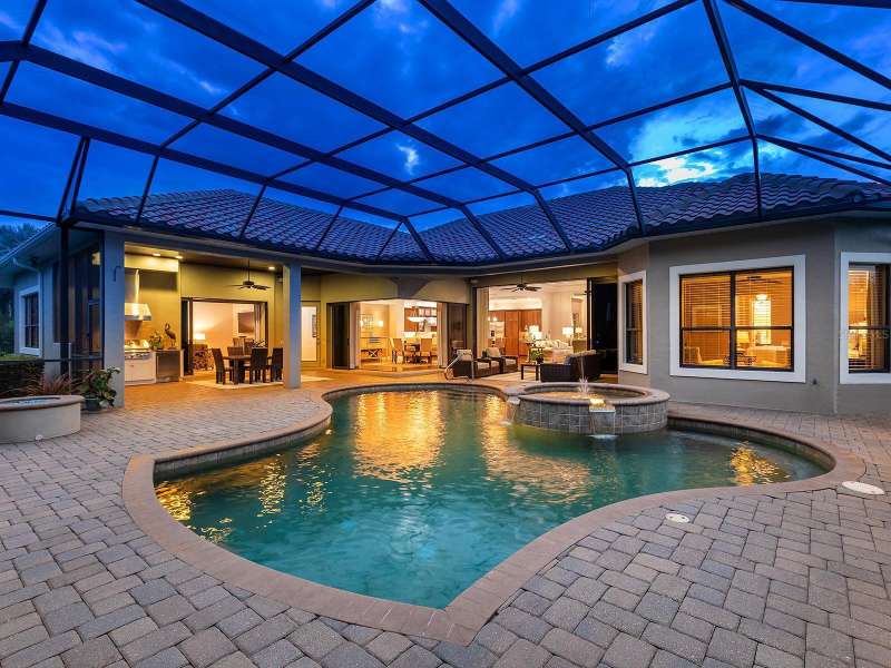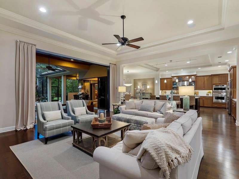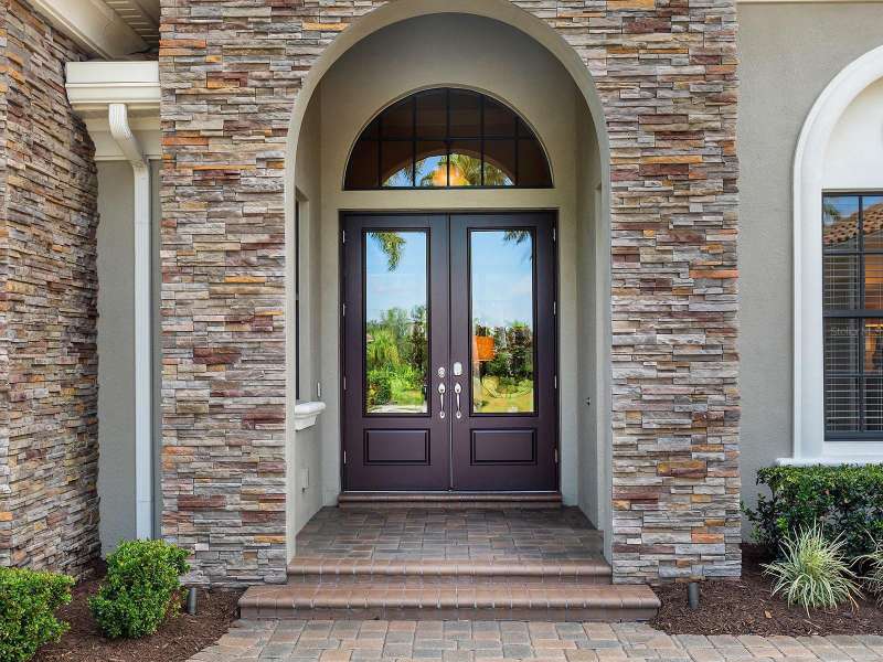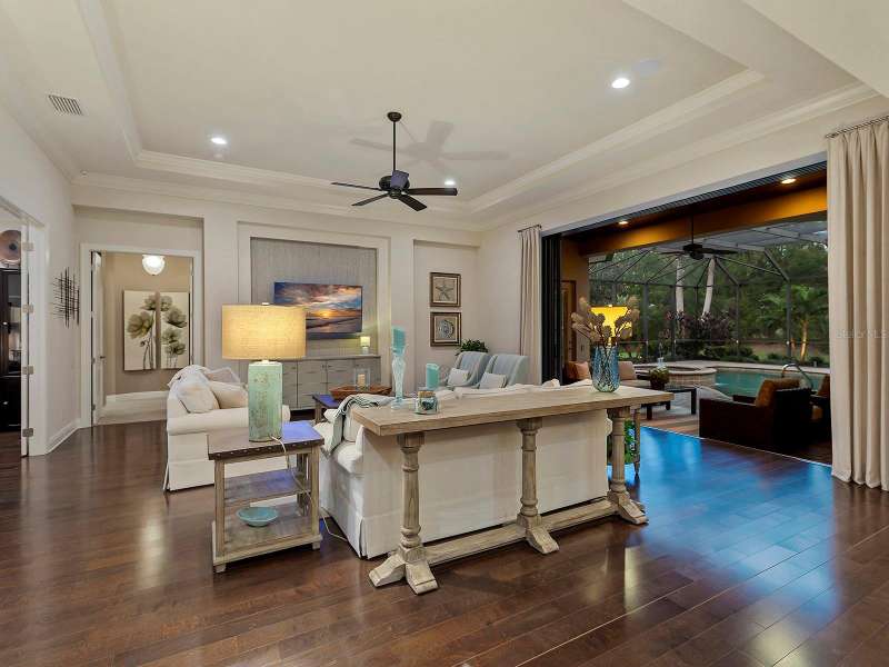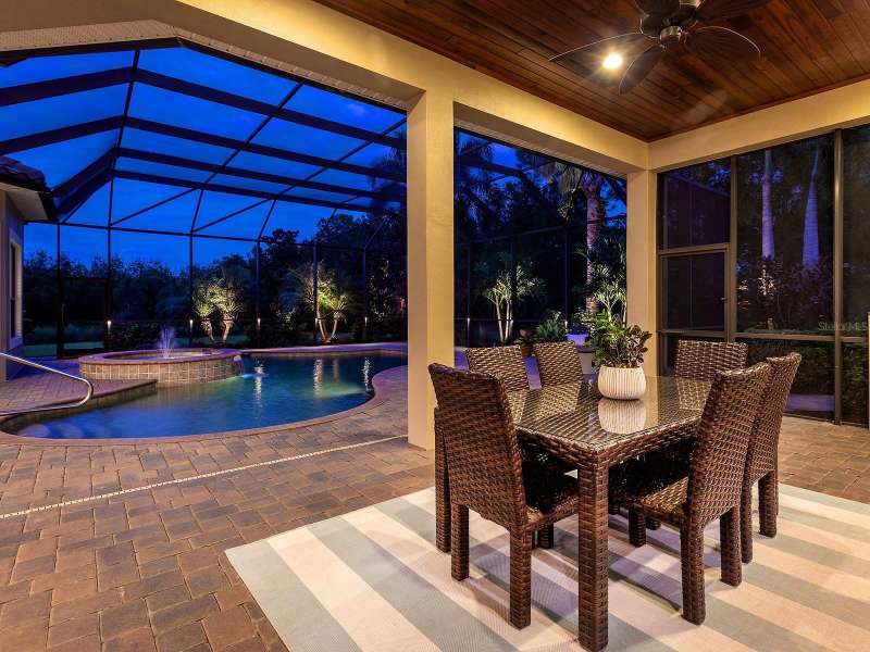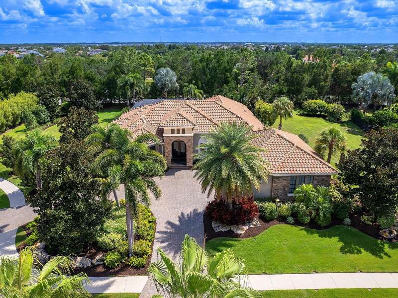 One of the most desirable homes in all of Country Club East is now available! Boasting the second largest lot in the entire neighborhood and located within the desirable Royal Valley enclave, this custom expanded Bermuda home by Arthur Rutenberg is truly a rare find. Enjoy nearly one full acre of private and lush landscaping on a secluded street with a cul-de-sac bump out beside the house for added privacy. This customized residence is perched amongst towering palms with a wide circular paver driveway, massive side and back yards, and oversized 3-car side garage. Gracing nearly 3,700 SF, this customized residence gleams with a stacked stone façade, wood flooring, crown molding, designer touches, and smart storage. Large double impact glass front doors welcome you in from the manicured front drive to a spacious foyer where the modern floor plan offers an open flow perfect for entertaining. The central great room with tray ceiling has an entertainment niche with designer wallpaper, and impact sliding glass doors to the lanai. Your outdoor oasis is the epitome of Florida living with a freeform, heated saltwater pool and spa with water feature surrounded by lush garden-like landscape. Enjoy entertaining on the paver lanai from the two covered entertaining areas with cypress wood ceilings, and the summer outdoor kitchen with grill and 2025 bar fridge. Inside prepare meals from the chef’s kitchen with a quartz central island, perfect for guests to gather around and watch the chef create culinary delights from the GE Monogram stainless steel appliance suite including gas cooktop with griddle and wall oven. The custom cabinetry offers unparalleled storage around the perimeter and at the island, display space in the frosted glass uppers, and extra storage in the cleverly hidden large walk-in pantry. The adjacent dining room with designer chandelier spills out onto the lanai through disappearing corner glass sliders. The primary suite offers comfort and luxury with a warm color palette, seating area overlooking the garden, dual walk-in closets with custom storage, and spa-like bathroom with soaking tub, walk-in shower, and dual split vanities plus makeup area. Guests will enjoy their own private suites in two separated guest bedrooms each with en-suite bathrooms, walk-in closets, and enough space for king beds. Working from home has never been better in the spacious front den featuring a separate bay-style sitting area and double doors, then retire to the spacious bonus room perfect as a media or game room, both of which are surrounded by extra insulation for sound reduction. This exceptional residence also features a pool powder bath, large storage room, functional laundry with plentiful cabinetry, and oversized 3-car side-loading garage. Peace of mind is secured with impact windows and doors, surge protector, 2025 tankless water heater, 2025 inspection of the roof with 13-15 years additional life, and silver Florida Green Home Certification. Enjoy the country club lifestyle at the gated Country Club East with 3 community pools, fitness center, clubhouse, walking trails, social events and more. If you’re looking for additional amenities, membership to Lakewood Ranch Golf and Country Club is optional and available for access to 3 Clubhouses, 4 championship 18-hole golf courses, fitness center with pool, and tennis and pickleball courts. Lakewood Ranch is the top multi-generational community in the country for 7 years in a row.