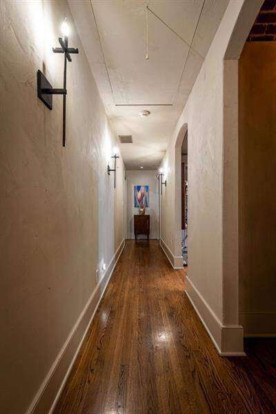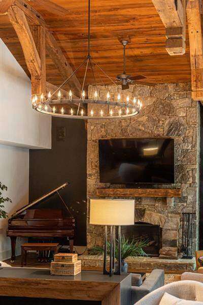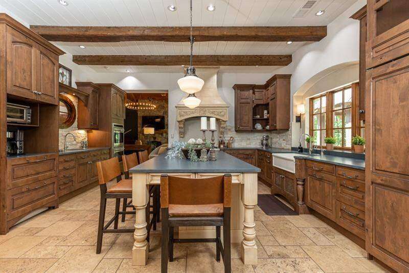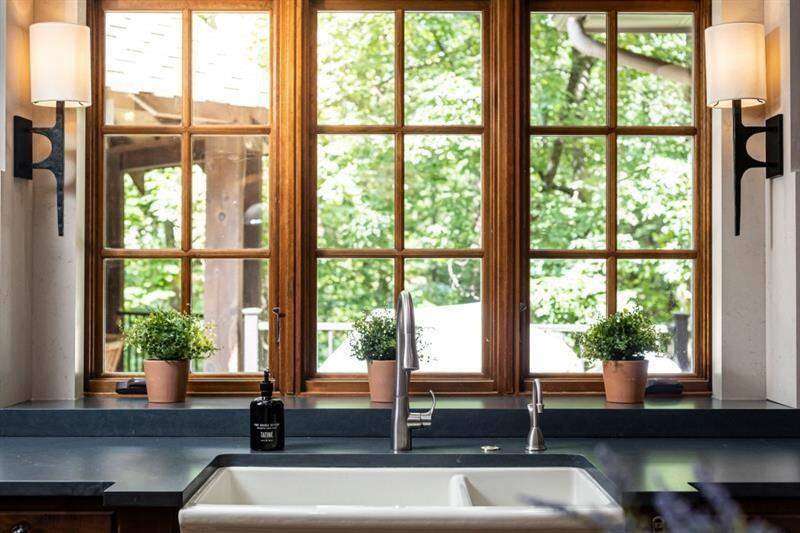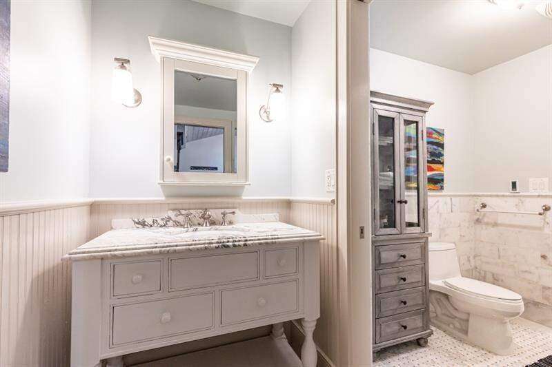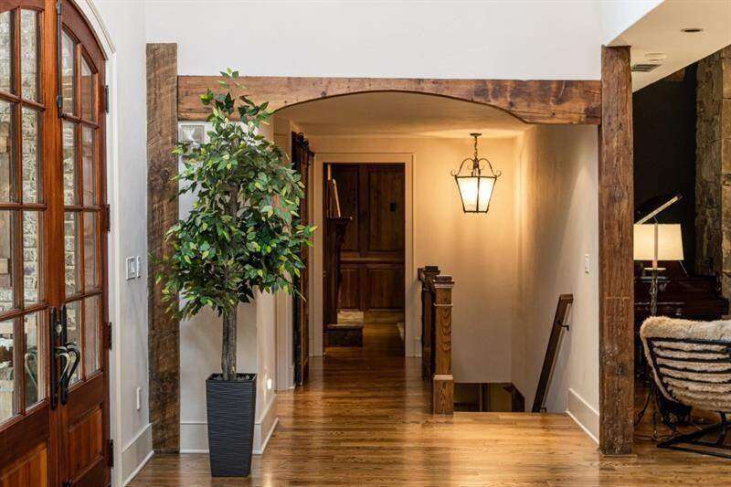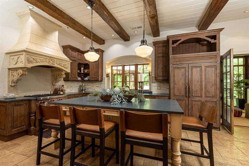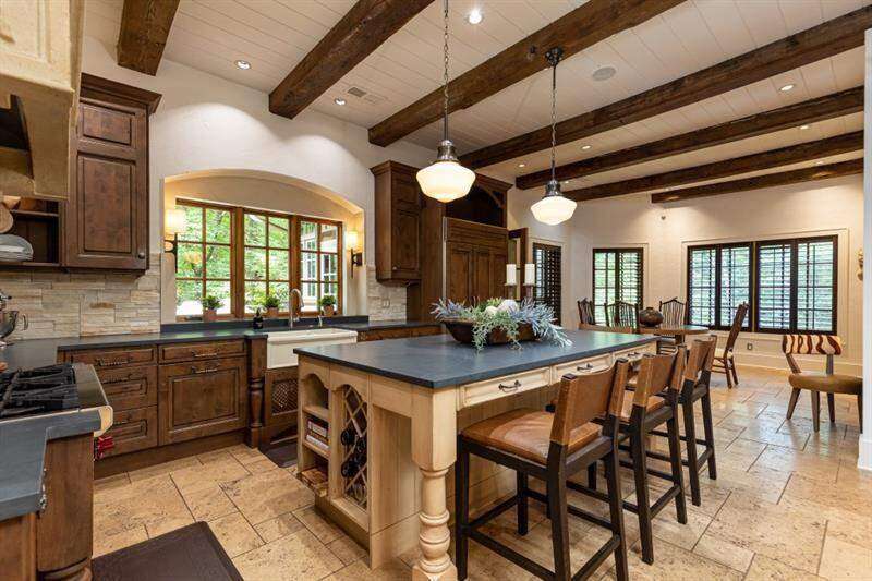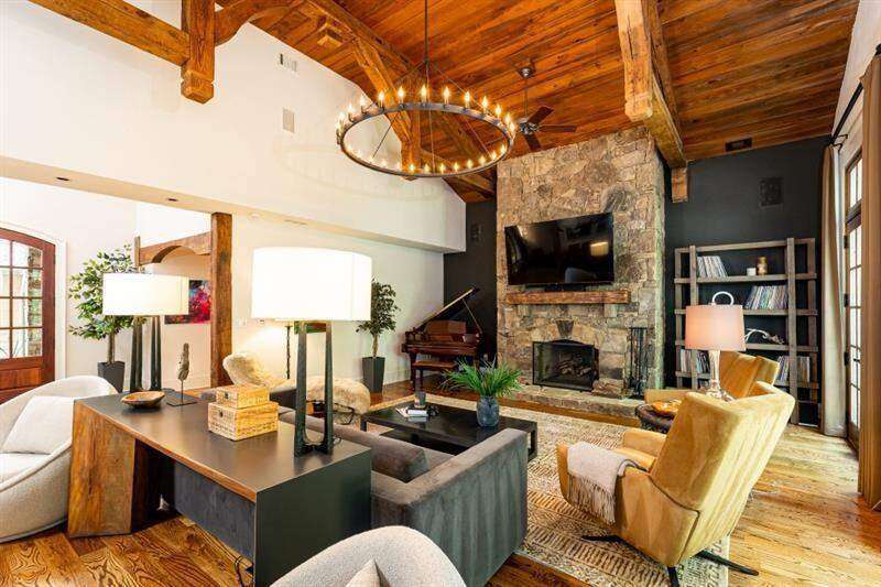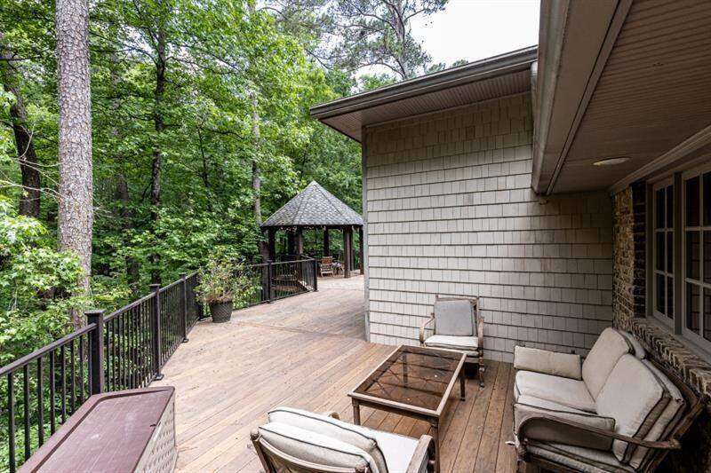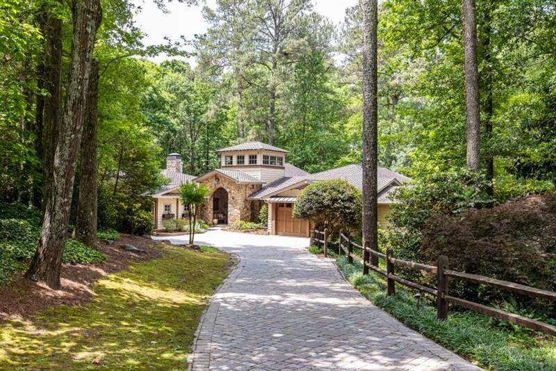 Escape to this remarkable property sitting on over an acre of land with a serene stream as your back drop. Curated to perfection this home offers an elevated lifestyle close to heart of Vinings. Walking through the front door you enter the great room with beamed ceiling, floor to ceiling stone fireplace and beautiful views of the canopy of trees that surround the property. The overside separate dining room features wood barreled ceiling and nearby butlers pantry making it perfect for family gatherings and entertaining. The Design Galleria kitchen is perfection with dining area, kitchen island, built in office, Sub-zero and wolf appliances, wet bar, separate drink drawer, farmhouse sink, stacked stone backsplach & limestone vent hood. Conveniently located of the kitchen is the mud room with ample cabinet space and sink. A peaceful Yoga-sunroom just off the kitchen offers a view of the entire property. Tranquil primary bedroom with sitting area & limestone fireplace are located on the main floor. Two additional bedrooms with tiled bathroom and a beautiful wood paneled library with fireplace are also on the main floor. The main floor opens to wrap around rear deck and Pavillion give full with views of the stream and offer an unbelievable setting for any gathering. The second level offers two additional bedrooms and two additional entertaining spaces including a large sitting area with fireplace, game room and two full bathrooms. The newly completed terrace level with half bath offers room for a gym, home office,workshop, studio etc.and has a separate entrance that opens to the stream and backyard. The home has a two car garage with artist studio and also an additional covered parking spot with a storage shed. The home and property work together to bring a harmonious way of living. Some of the property upgrades include the completed terrace level with bathroom, new lighting, new decking, kitchen upgrade and new generator.