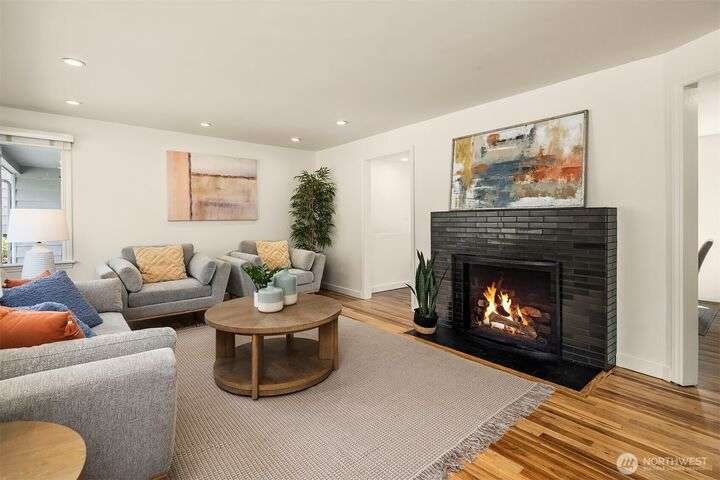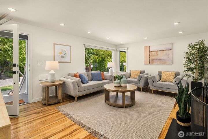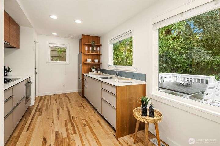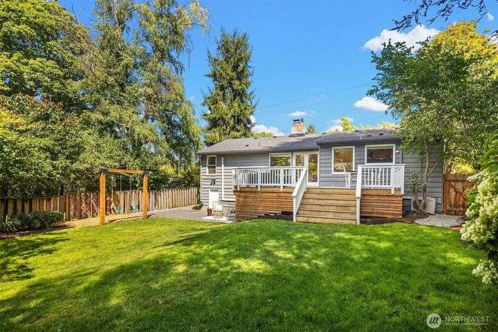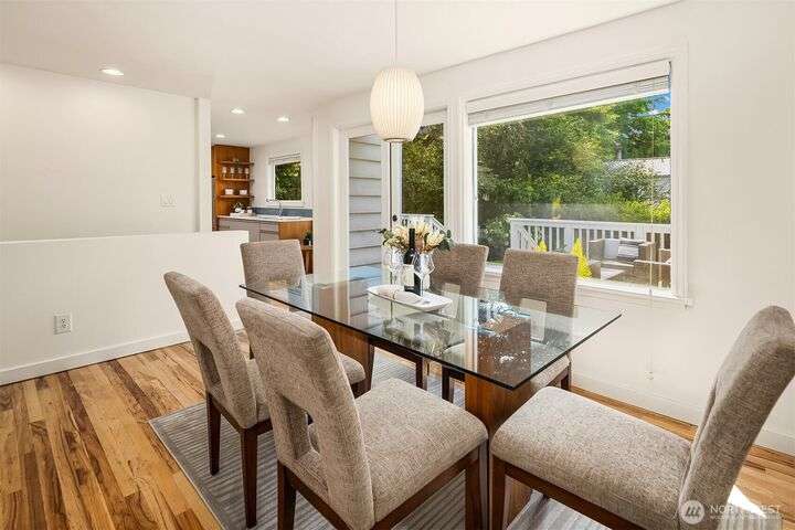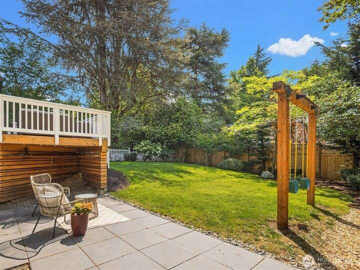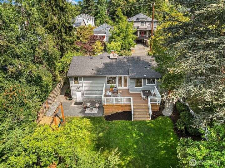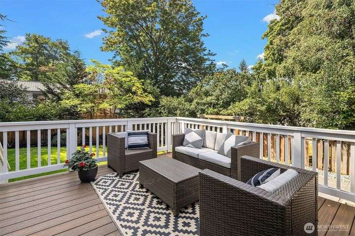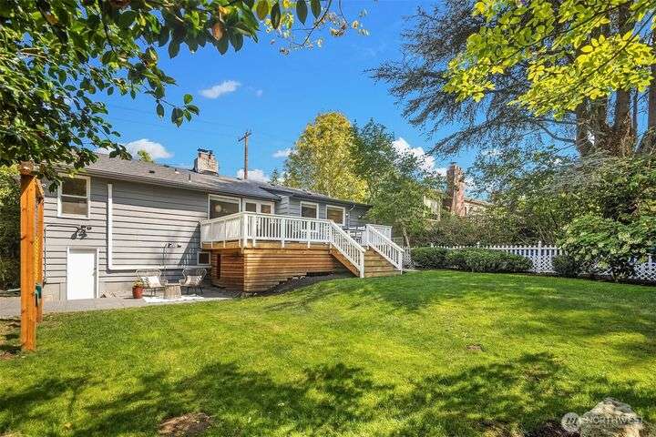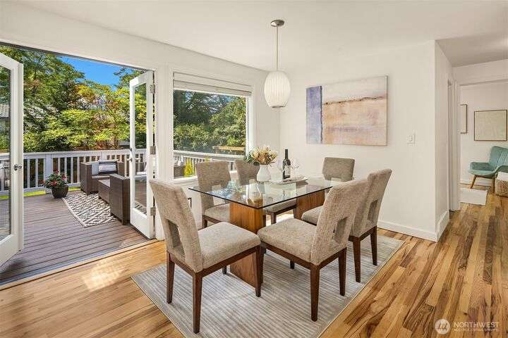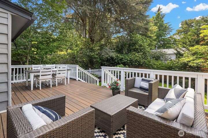 Hawthorne Hills home with charming deck & backyard, just an easy walk to Burke-Gilman Trail & Metropolitan Market + easy access to U-Village, Magnuson Park, & other amenities. This well-loved & maintained home has a bright & functional layout. A covered front porch opens to the main living space featuring hardwood floors, large picture window + cozy fireplace & flows into the dining area & kitchen with French doors to backyard, deck, & lower patio. The home has 3 bedrooms up & a renovated full bath with heated floors. The daylight basement offers a family room, 4th bedroom, additional bathroom with laundry/utility area, & extra storage. Relax & entertain in the south-facing, private & sunny backyard. 1-car garage + off street parking.
