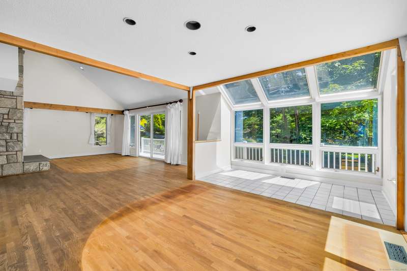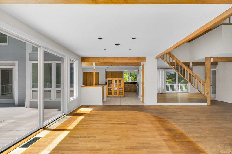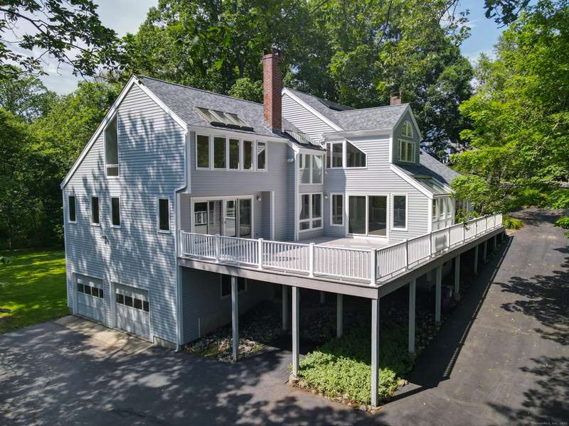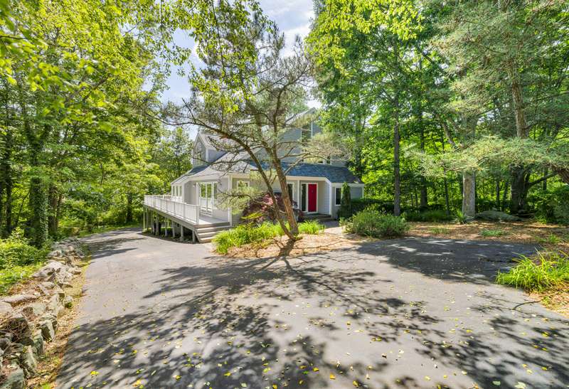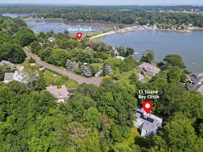 LOCATION, LOCATION, LOCATION! Nestled within a peaceful cul-de-sac just around the corner from the beach, this one-of-a-kind, custom-built Cape Cod-style home blends timeless charm with a contemporary flair. Located on desirable Island Bay Circle, enjoy the convenience of being minutes from the downtown village, restaurants, shopping, and the shoreline. This thoughtfully designed 5/6 bedroom, 3 1/2 bath home has had only one owner and was built as a "green" home, using natural, eco-friendly materials throughout. Expansive windows flood the interior with natural light, highlighting the home's architectural features and creating a warm, inviting atmosphere. The dramatic two-story living room is a showstopper, featuring a floor-to-ceiling stone gas fireplace, exposed beams, and sliding glass doors that open to a wrap-around deck, perfect for seamless indoor to outdoor living. The dining area, surrounded by solarium-style windows, flows effortlessly into a spacious kitchen; ideal for every