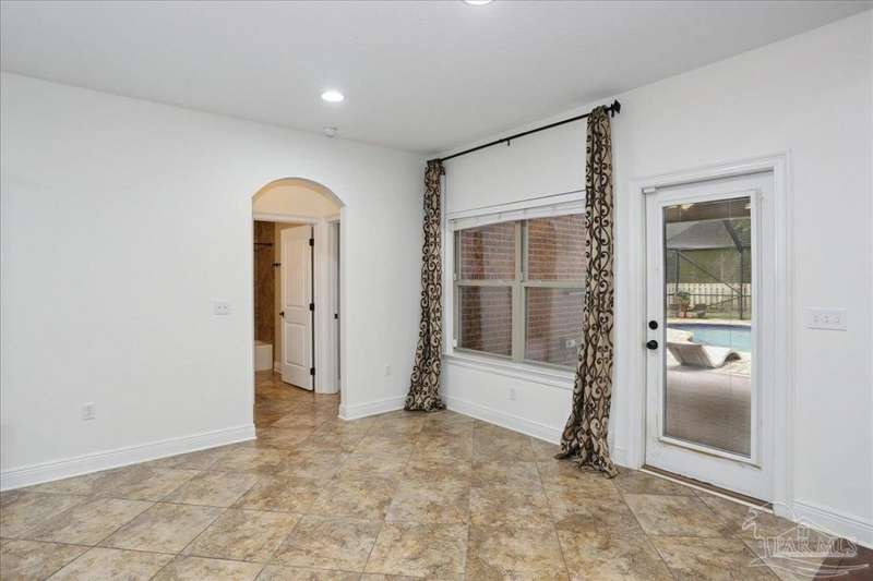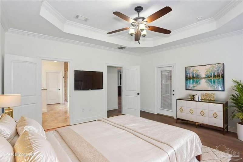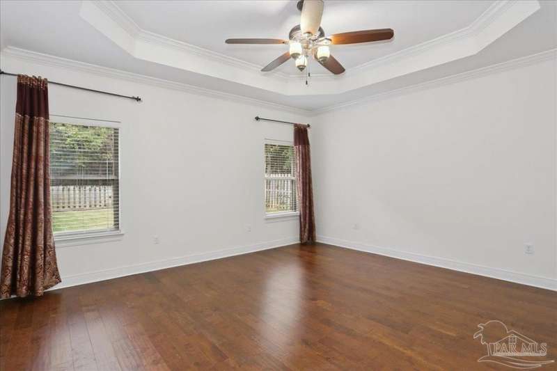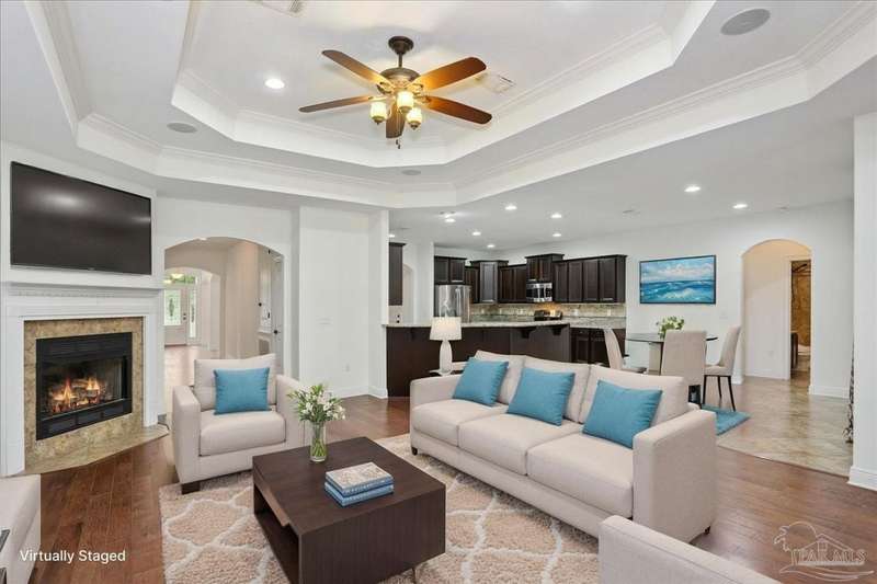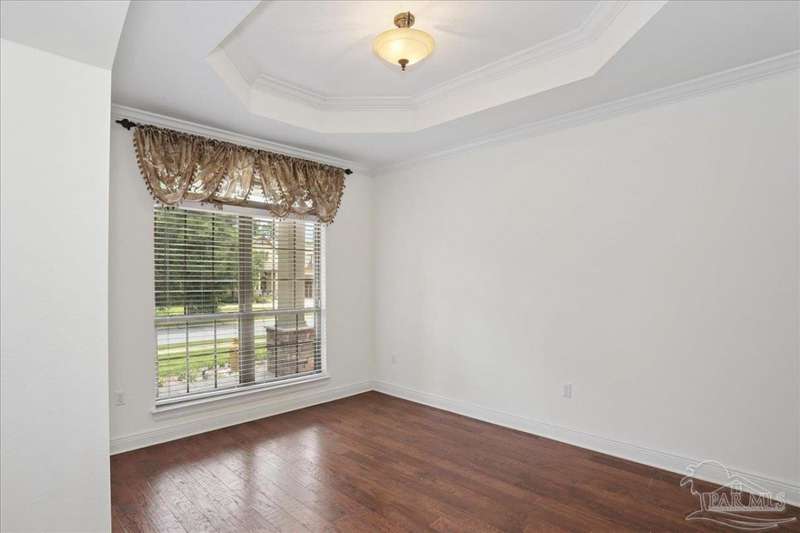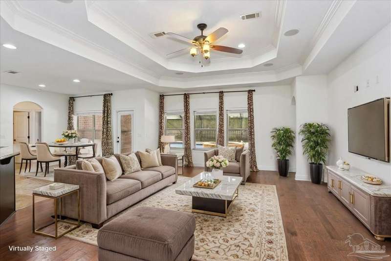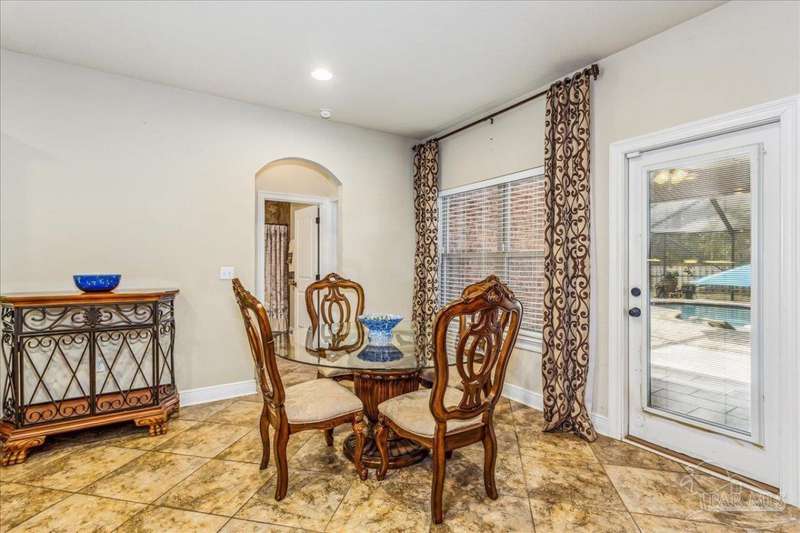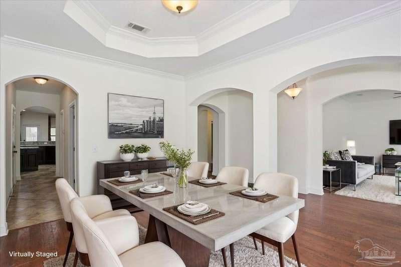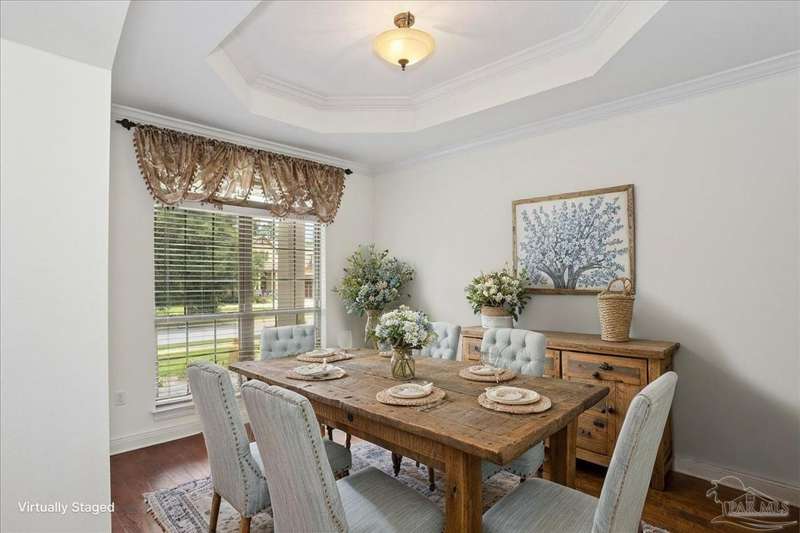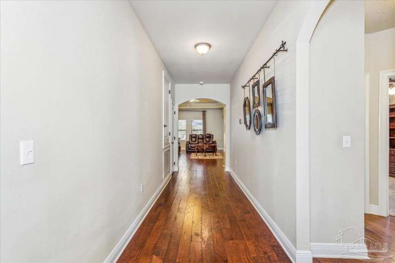 EXQUISITE LIVING in this premier one-story, pool home home located in the gated community of Nature Trail. Nicely positioned against the greenbelt for desirable backyard privacy. You will find a superior level of craftsmanship throughout this home which includes, beautiful hand scraped hardwood flooring, custom cabinetry, detailed trim, crown molding and granite stone in the kitchen and bathrooms. Truly a well-planned spacious home featuring a newer whole house generator, split floorplan, office space, fully appointed gourmet kitchen with gas range, beautiful primary bedroom ensuite with elevated ceiling, additional bedrooms and room for in-laws. The spacious living room provides a seamless transition to a stunning designed outdoor space with swimming pool/hot tub accented with pavers and covered lanai and extra yard space to accommodate for pets or swing set. The patio area has ample room for large gatherings perfect for entertaining with an outdoor kitchen or relaxing with friends and family around the swimming pool/hot tub. This property includes additional recreational opportunities, tennis and pickleball courts, community swimming pool, basketball court, fitness center, 5 miles of hiking trails and ponds to fish. Located only 2.5 miles to the interstate and less than 30 minutes to Pensacola's award winning sandy white Beach!