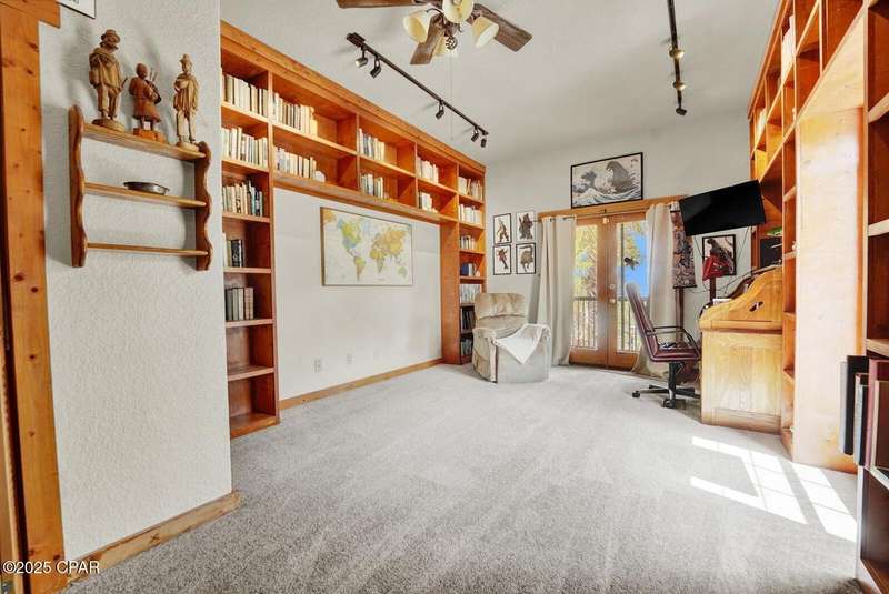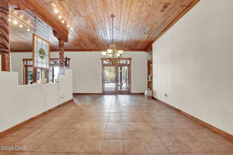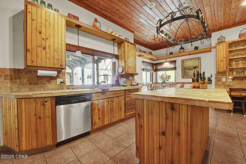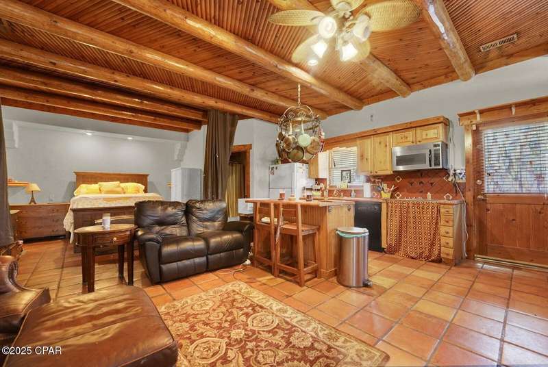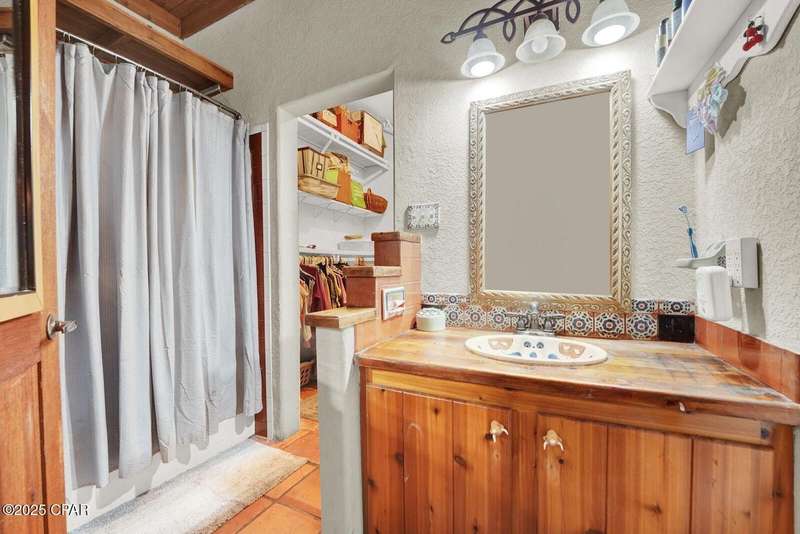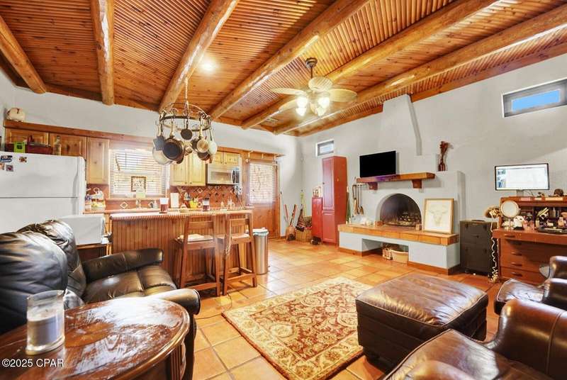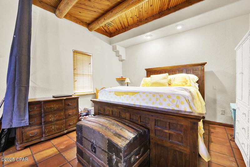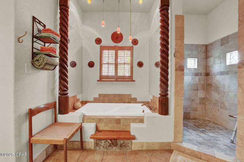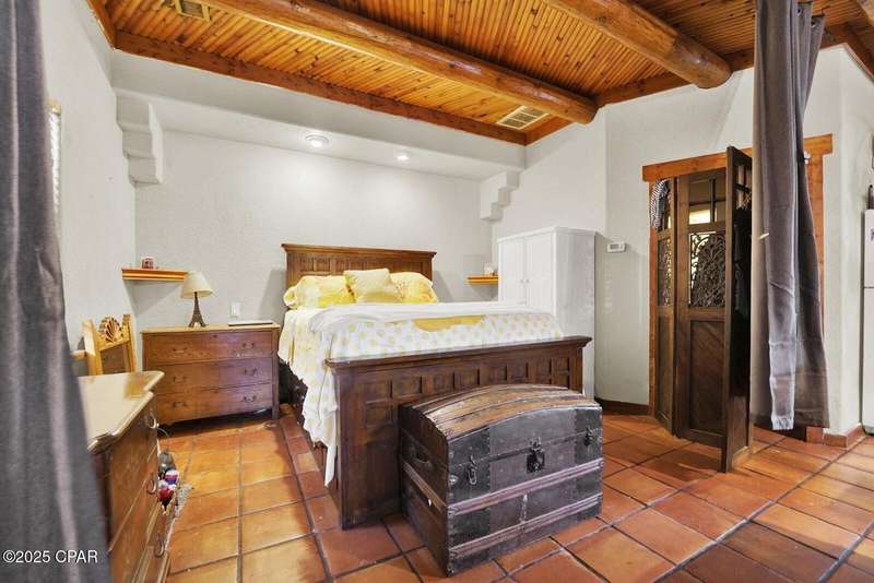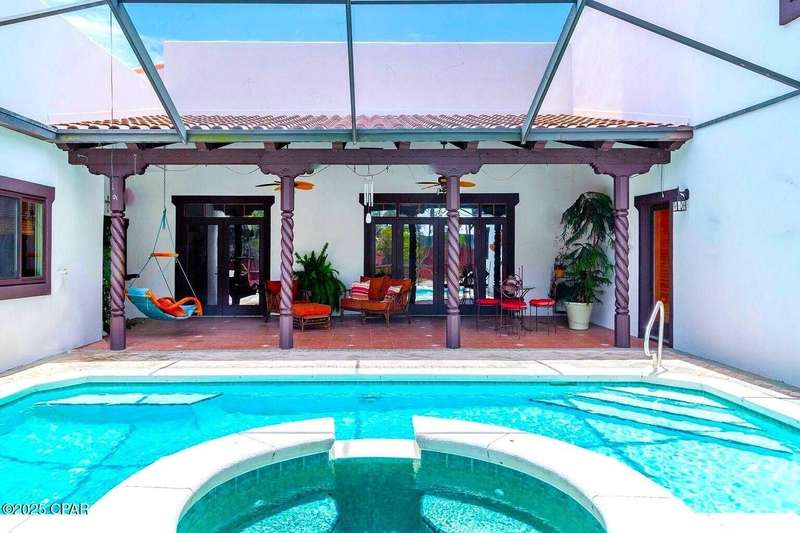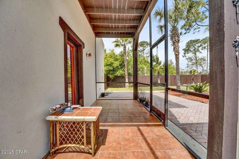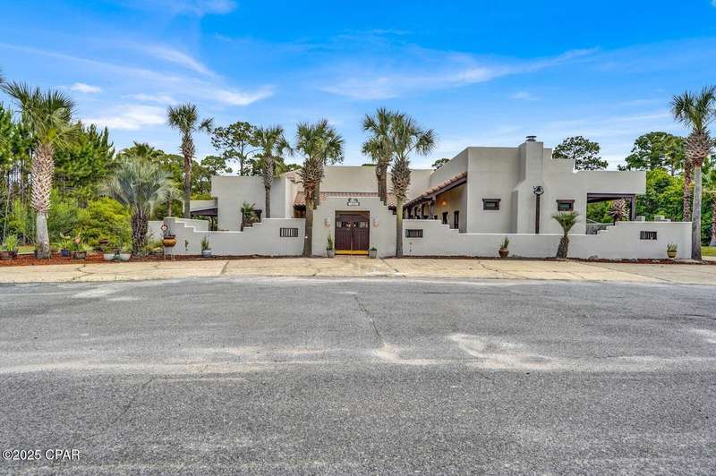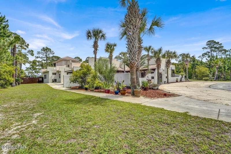 Nestled in the highly sought-after Mack Bayou area of Santa Rosa Beach, this exquisite Spanish Hacienda-inspired estate offers a rare blend of architectural charm, expansive living, and refined indoor-outdoor entertaining - all just minutes from 30A and Grand Boulevard with their vibrant mix of upscale dining, shopping, and coastal lifestyle experiences. Situated on a private road, this thoughtfully designed residence welcomes you through a gated courtyard adorned with a striking double-tiered fountain, setting the tone for the serene elegance found throughout. The home's flowing layout includes a spacious main residence and a private guest wing, ideal for multi-generational living or hosting in style. The main house boasts a grand living room anchored by afireplace and custom built-ins, seamlessly connecting to the formal dining area and an oversized chef's kitchen complete with island, breakfast nook, pass-through windows to the lanai, and abundant storage. Soaring glass doors open onto a luxurious screened lanai featuring a pool, spa, and multiple patio spaces perfect for alfresco gatherings.The expansive master suite is a private retreat with a fireplace, two separate access points to the lanai, a spa-inspired bath with soaking tub and walk-in shower, dual vanities, and a massive walk-in closet. A main-level guest bedroom with private entry and a full bath adds to the home's versatile layout. Upstairs, a charming study-library overlooks the pool and patio area and features floor-to-ceiling bookshelves, a private screened porch, full bath, and generous closet easily convertible into an additional guest suite. The separate guest quarters wing includes its own kitchen, living room with wood-burning fireplace, full bath, laundry, and a private rear courtyard, making it ideal for extended stays or independent living. Additional features include a two-car garage, a detached pool/garden and storage building. This incredible home features a Stone-Coated Metal roof, offering the aesthetic charm of traditional shingles with the exceptional durability of metal. Known for its strength and resilience, this premium roofing system typically lasts 40 to 70+ years, far outperforming traditional roofing!This elegant residence offers timeless design and comfort with convenient access to the best of 30A and Grand Boulevard. Buyer to verify all dimensions.