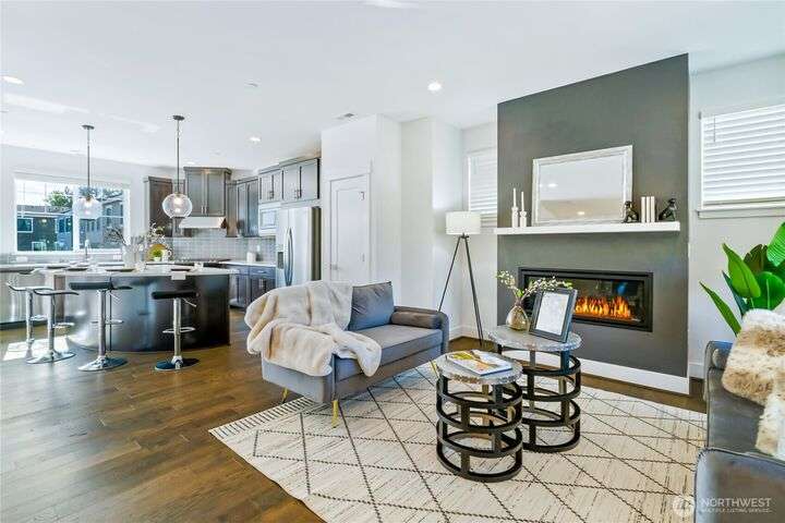 Sophisticated style & vibrant city living meet in this contemporary 2-bedroom corner-unit townhome. The light-filled open main level is perfect for entertaining, w/ a designer kitchen showcasing sleek quartz countertops, premium S.S. appliances, & an inviting gas fireplace for cozy evenings. Beautiful hardwood floors flow throughout the home w/ no carpet anywhere adding warmth and timeless appeal. A chic powder room adds a touch of luxury for guests. Upstairs, both bedrooms are spacious private en-suites. Enjoy year-round comfort w/ central A/C, 2-car garage, & unbeatable walkability to charming shops, trendy dining, and scenic parks — plus access to an elegant community clubhouse ideal for gatherings, celebrations, or relaxed weekends.