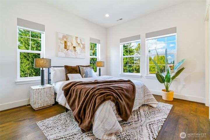 Sophisticated style & vibrant city living meet in this contemporary 2-bedroom corner-unit townhome. The light-filled open main level is perfect for entertaining, w/ a designer kitchen showcasing sleek quartz countertops, premium S.S. appliances, & an inviting gas fireplace for cozy evenings. Beautiful hardwood floors flow throughout the home w/ no carpet anywhere adding warmth and timeless appeal. A chic powder room adds a touch of luxury for guests. Upstairs, both bedrooms are spacious private en-suites. Enjoy year-round comfort w/ central A/C, 2-car garage, & unbeatable walkability to charming shops, trendy dining, and scenic parks — plus access to an elegant community clubhouse ideal for gatherings, celebrations, or relaxed weekends.