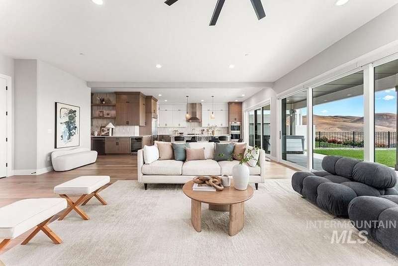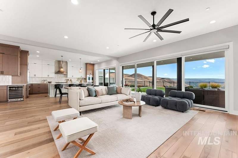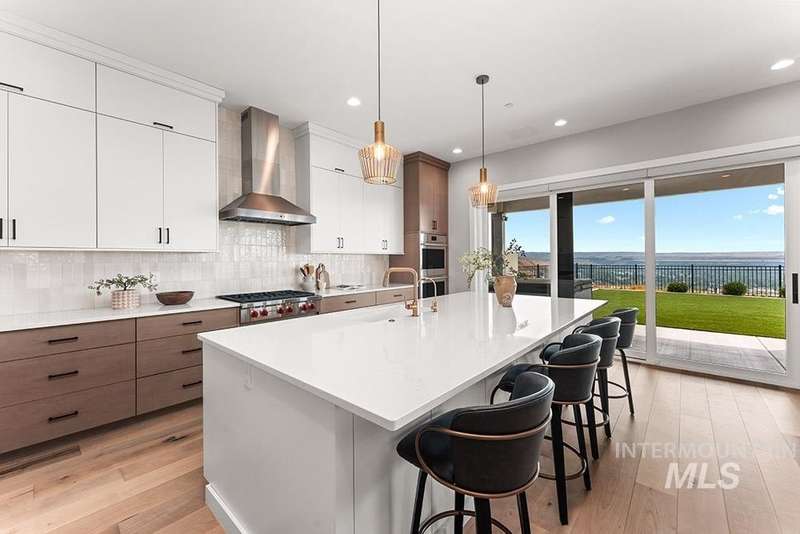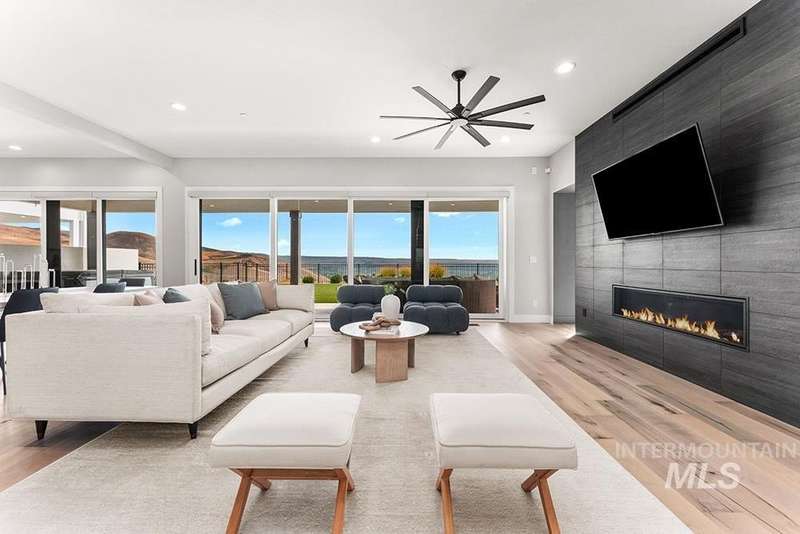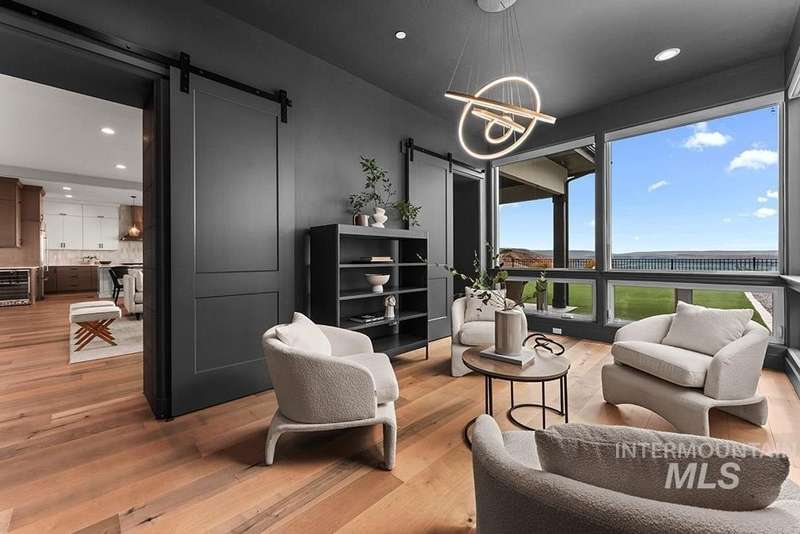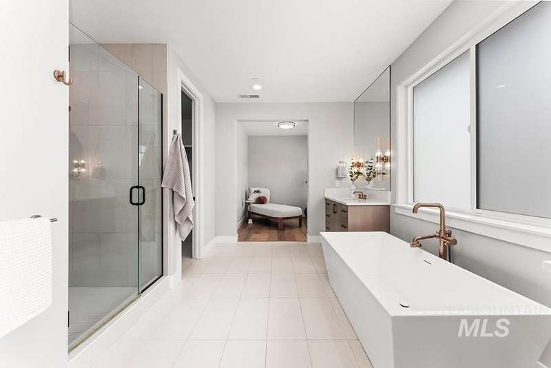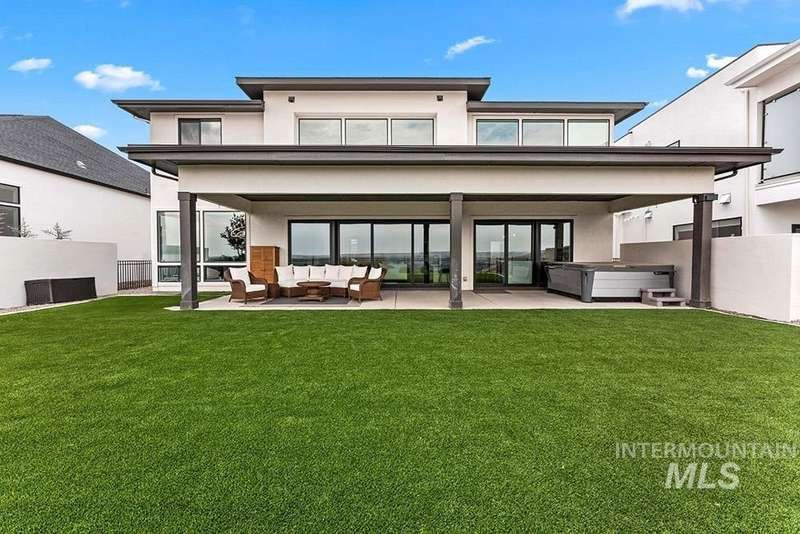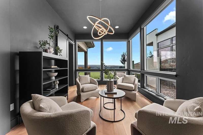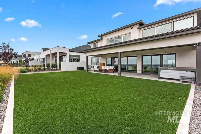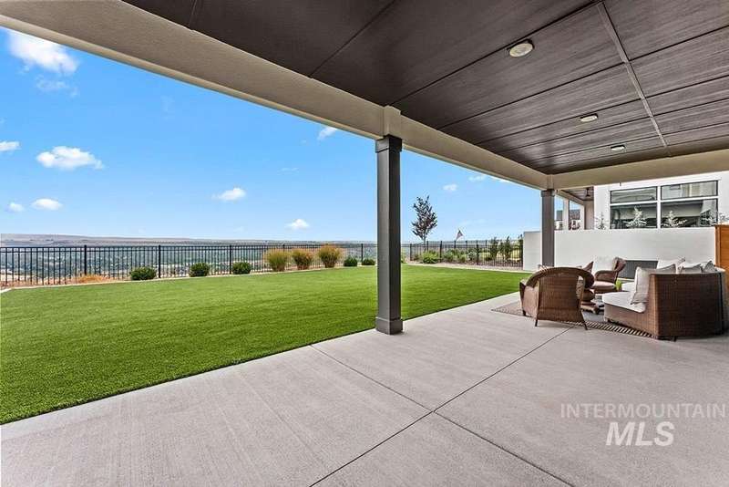 Modern luxury in Harris North! Elevated above Boise, this extraordinary home offers the perfect blend of elegance, function, & outdoor access. The community seamlessly connects to miles of foothill trails, a pool, & is just minutes from SE Boise amenities and the Greenbelt. The striking design features a spacious open layout with wood flooring, designer lighting, and expansive telescoping glass doors that frame sweeping foothill views. The great room is centered around a floor-to-ceiling fireplace and opens to a private moody lounge. The kitchen showcases two-tone ceiling-height cabinetry, zellige tile backsplash, dual ovens and dishwashers (Wolf Sub Zero), and an island for entertaining. The luxurious primary suite includes dual walk-in closets, a freestanding soaking tub, dual vanities & a private flex room perfect for a home gym or studio. The backyard is a private sanctuary with a large covered patio, hot tub & turf lawn, positioned to take in the breathtaking views.