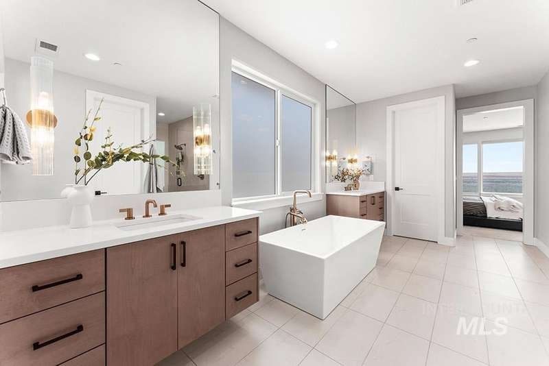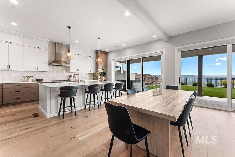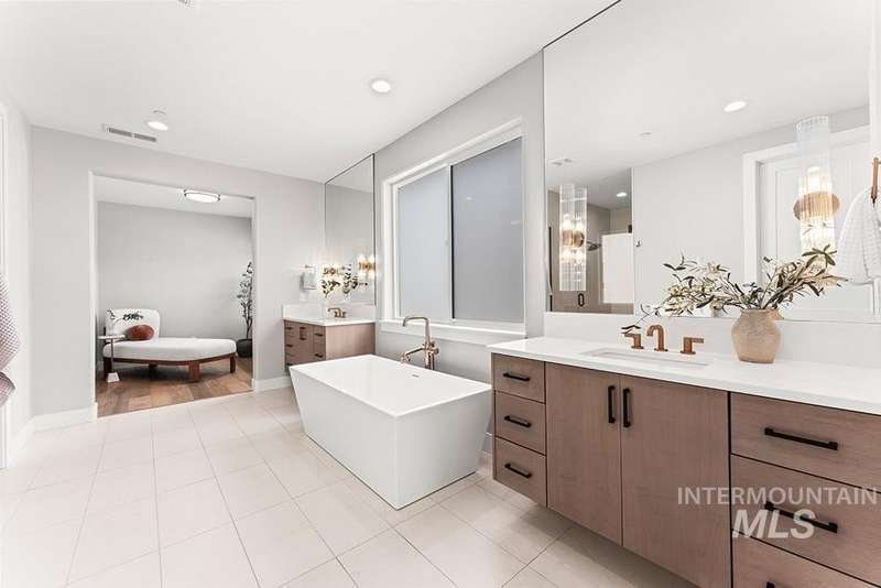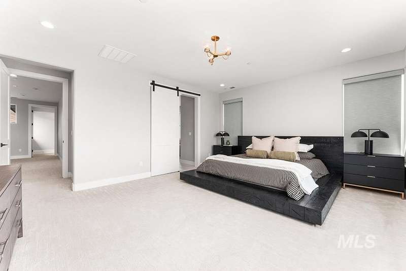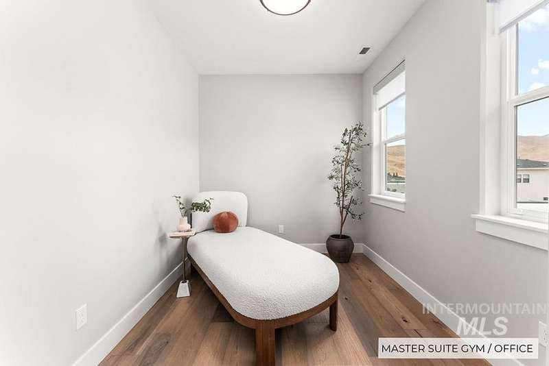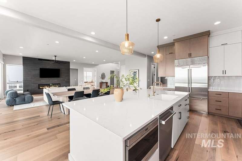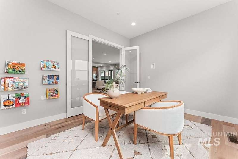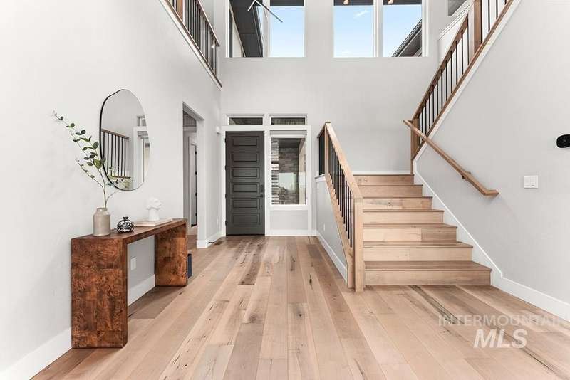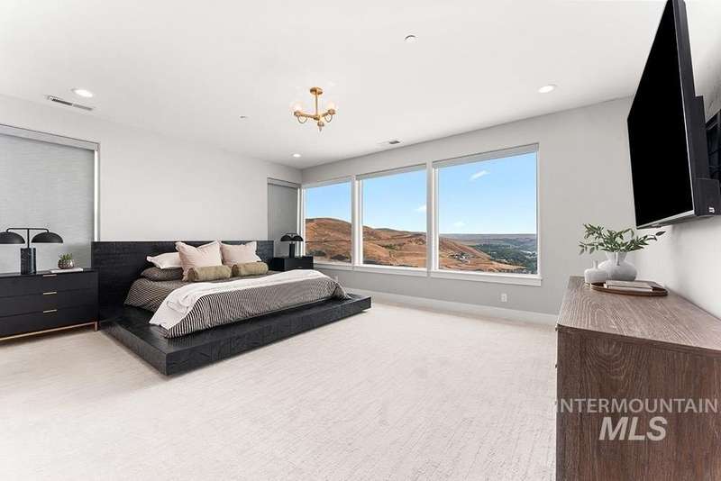 Modern luxury in Harris North! Elevated above Boise, this extraordinary home offers the perfect blend of elegance, function, & outdoor access. The community seamlessly connects to miles of foothill trails, a pool, & is just minutes from SE Boise amenities and the Greenbelt. The striking design features a spacious open layout with wood flooring, designer lighting, and expansive telescoping glass doors that frame sweeping foothill views. The great room is centered around a floor-to-ceiling fireplace and opens to a private moody lounge. The kitchen showcases two-tone ceiling-height cabinetry, zellige tile backsplash, dual ovens and dishwashers (Wolf Sub Zero), and an island for entertaining. The luxurious primary suite includes dual walk-in closets, a freestanding soaking tub, dual vanities & a private flex room perfect for a home gym or studio. The backyard is a private sanctuary with a large covered patio, hot tub & turf lawn, positioned to take in the breathtaking views.