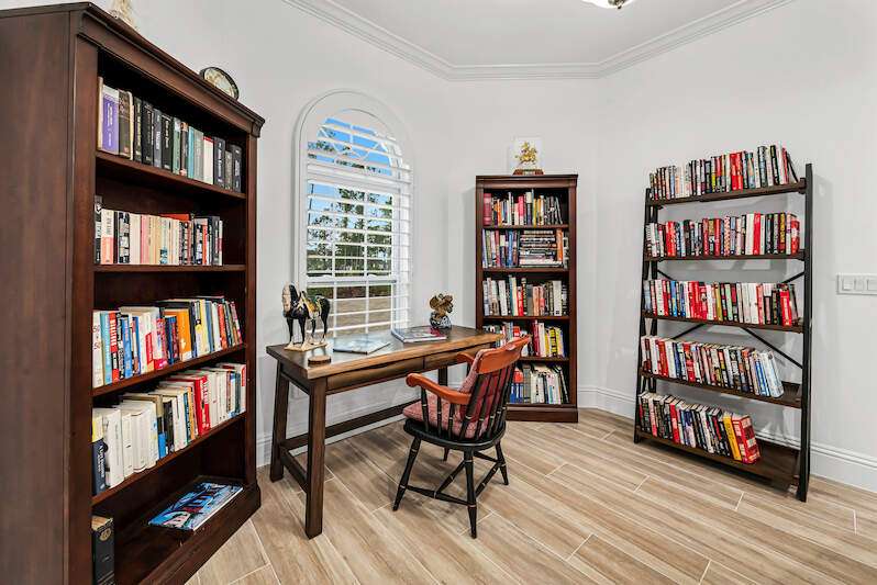 New price. All reasonable offers warmly welcomed-seize the chance to claim this extraordinary estate as your own! Escape to Your Private Paradise! Tucked away on a sprawling 2.81-acre oasis, this breathtaking estate home seamlessly marries timeless elegance with modern luxury. A striking stone-accented exterior and a grand covered entry with chic impact doors welcome you to a world of refined living. Step inside to discover a masterpiece of design-5 1/4'' crown molding, bold seven-inch baseboards, solid wood plantation shutters, and soaring tray ceilings grace the living and dining spaces, exuding sophistication at every turn. The heart of the home, a gourmet kitchen, dazzles with sleek shaker cabinetry, luminous quartz countertops, and custom LED lighting, perfect for culinary adventures. Porcelain plank tile flows effortlessly throughout, guiding you to a serene, covered patio for seamless indoor-outdoor living. Retreat to the expansive 17x17 primary suite, a haven of tranquility, featuring a cedar-lined walk-in closet and a spa-inspired bathroom with dual sinks, a rejuvenating rain shower, and a decadent soaking tub. Pre-wired for media, this tech-savvy home is ready for your modern lifestyle. Outside, a lush tapestry of Flori tam grass, swaying palms, vibrant perennials, majestic Live Oaks, and 60 Areca palms creates a private, picturesque retreat. Envision your future with room to craft a sparkling pool, a stylish outdoor kitchen, or a charming guest house-the possibilities are endless! Nestled near top-rated schools, premier shopping, and exquisite dining, this secluded sanctuary offers the best of both worlds.