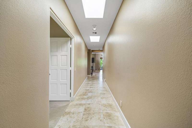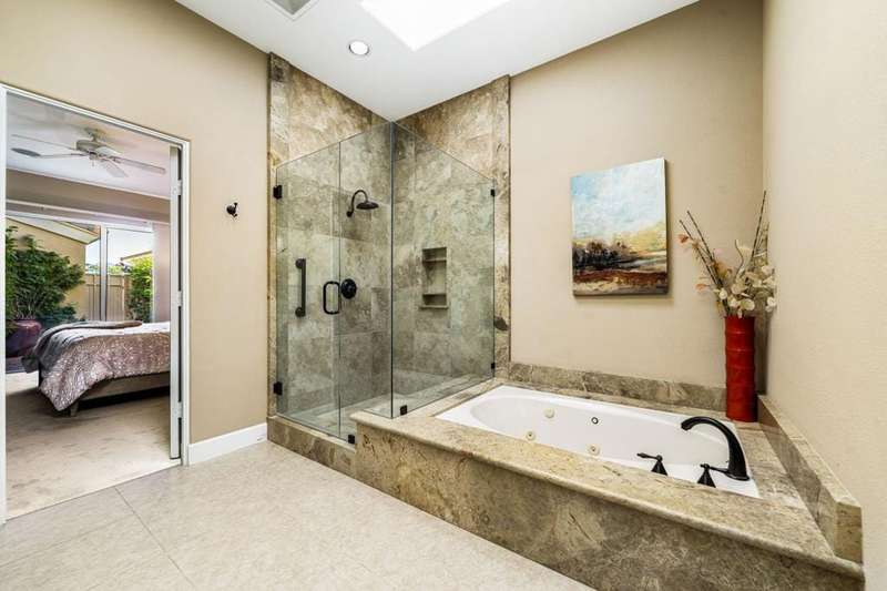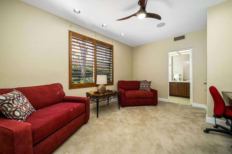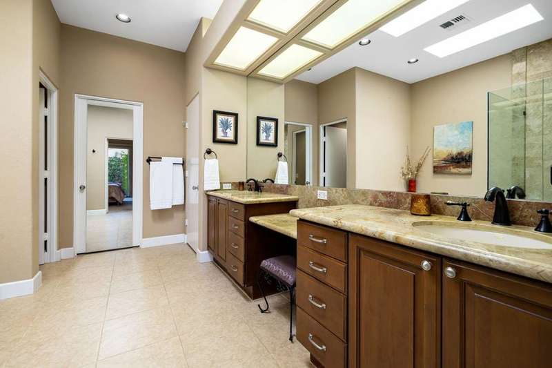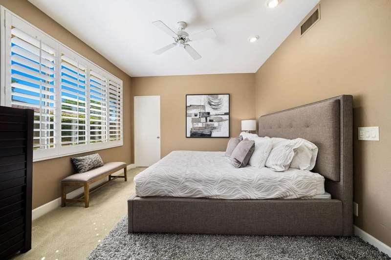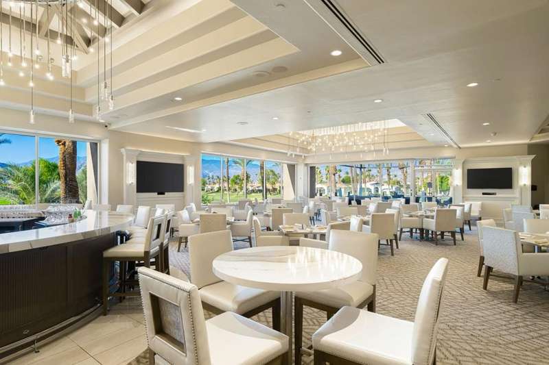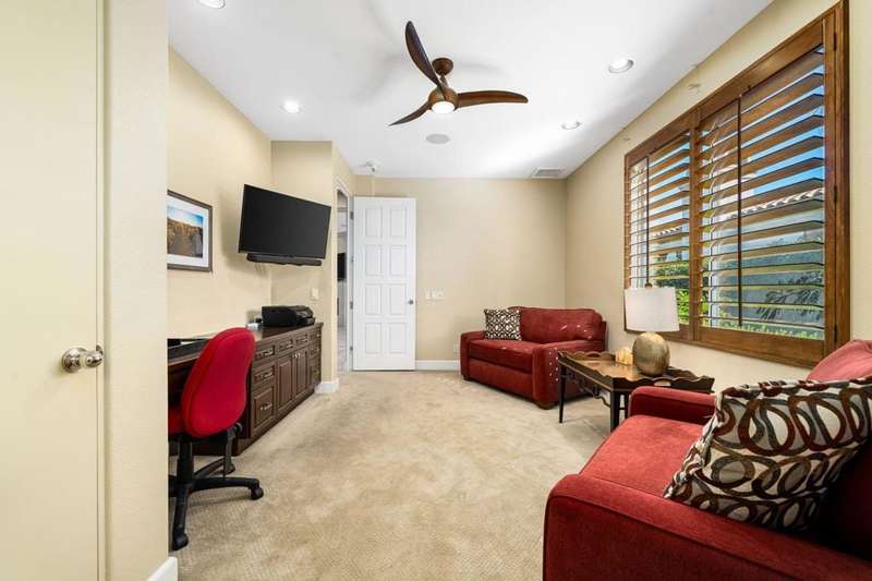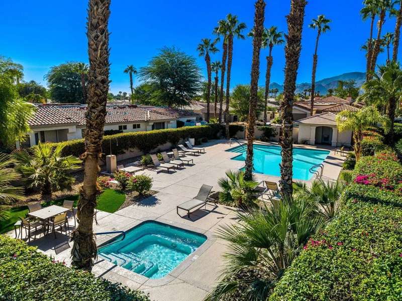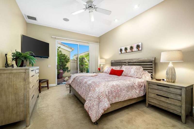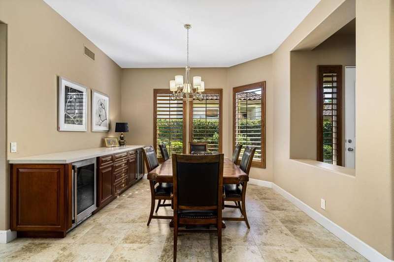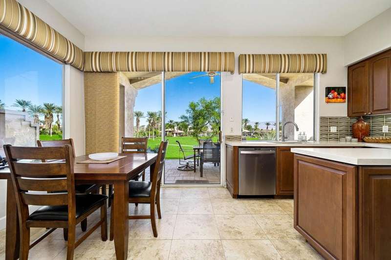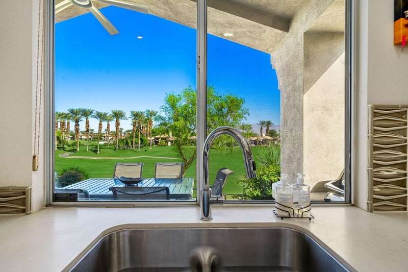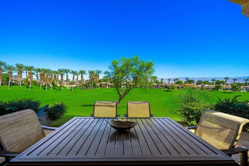 This beautiful & meticulously maintained Acacia-4 sits on an elevated lot with views of the Arnold Palmer Grove-4 course and majestic Chocolate mountains in the background. Upgrades include totally remodeled kitchen (2023) with new counter tops, gas cooktop, stainless appliances, chic backsplash, gooseneck faucet, new water heater (2023), & rear patio pavers. The dining area houses a huge wall to wall custom buffet with two beverage coolers; one for wine and one for non alcoholic beverages. The original pony wall in the great room has been removed to create an expansive feel & a flat screen 65'' wall mounted TV sits above the fireplace. Each bedroom is ensuite and one of the guest bedrooms has a custom wall to wall desk plus two pull-out sofa beds for guests & family members to enjoy. The lovely primary ensuite boasts a frameless shower stall, jetted tub, and looks out to a serene private patio for maximum relaxation. The 2 car garage plus golf cart space has an epoxy floor and mini split A/C. Located in the HOA where monthly dues include all gardening (front yard, courtyard & rear) exterior water, tree trimming, painting & electricity, roof maintenance, wi-fi, cable, trash, & pest control, all for lock & leave stress free convenience. One of the 38 community pools is just 4 doors away, Club membership is available with no wait, & Turnkey furnished.