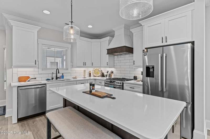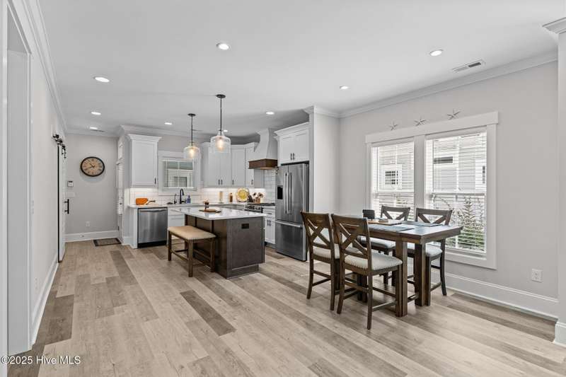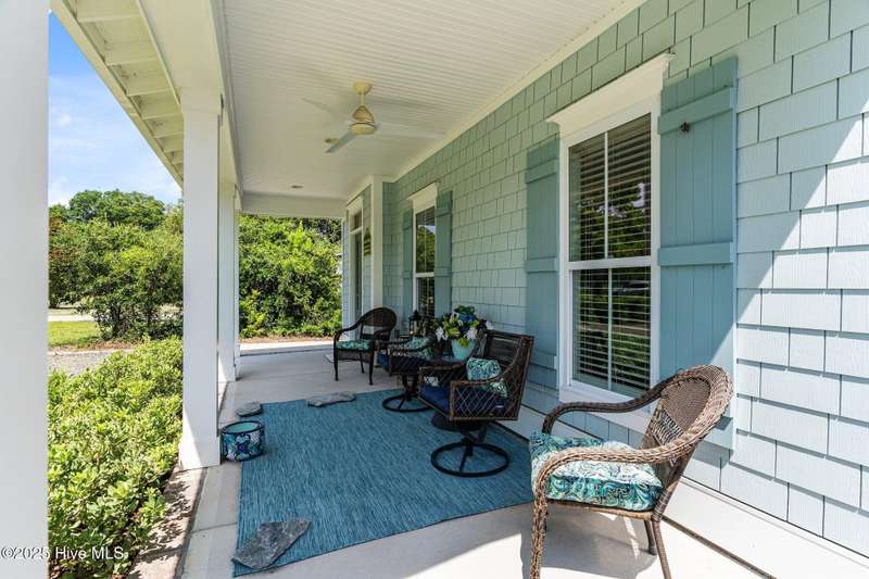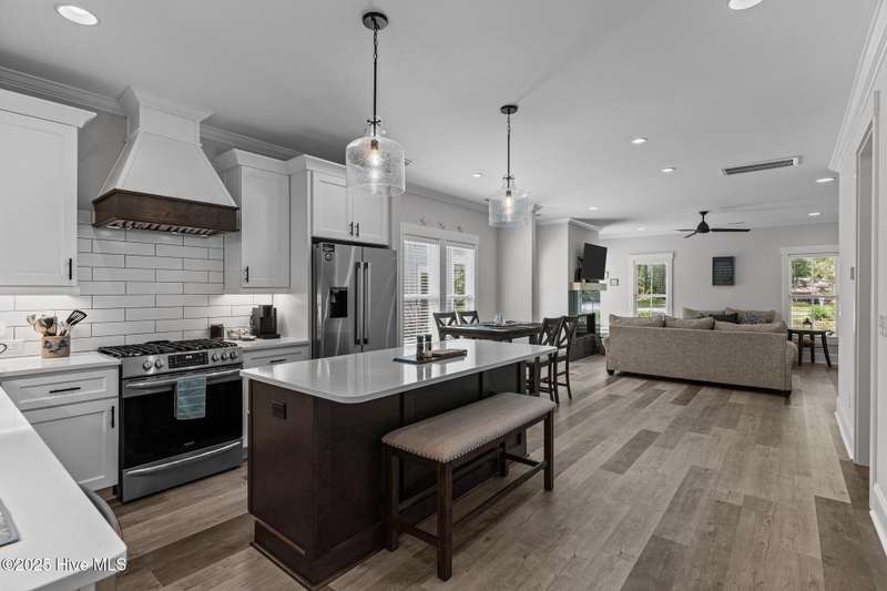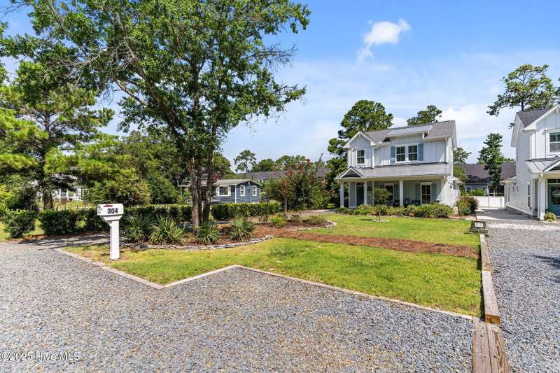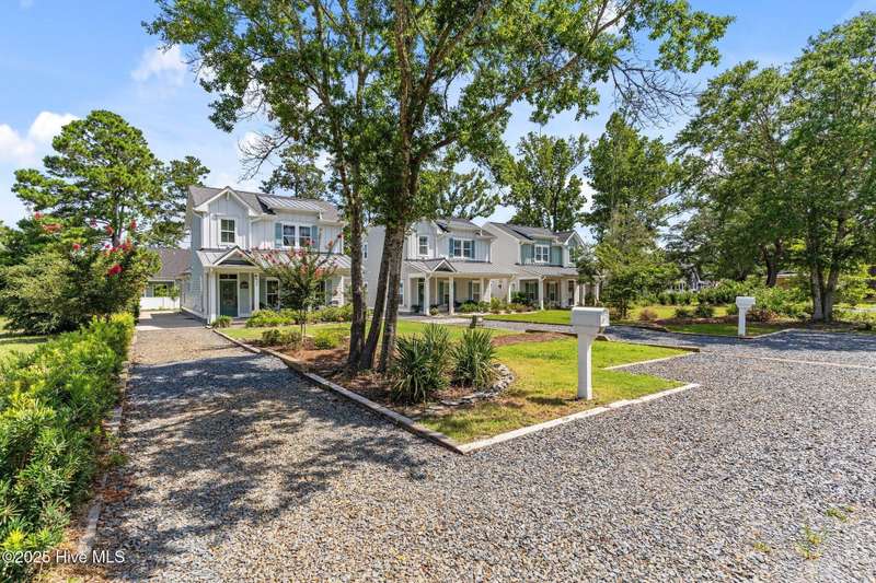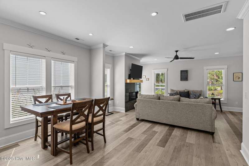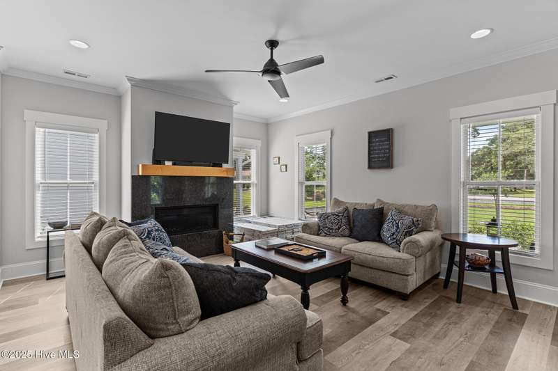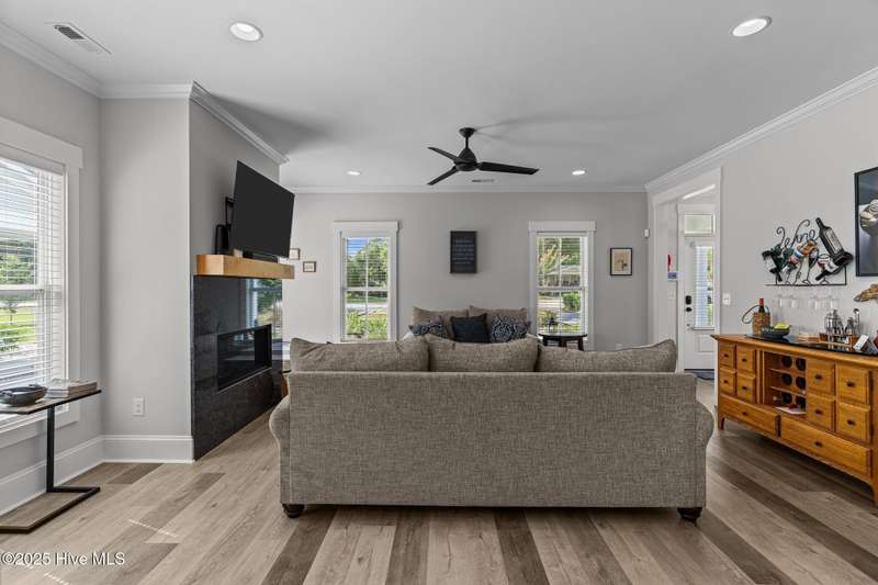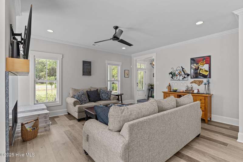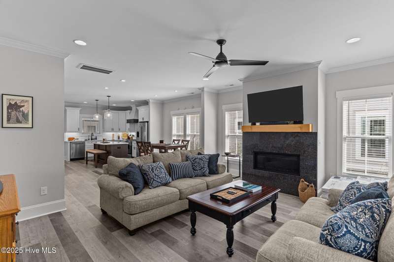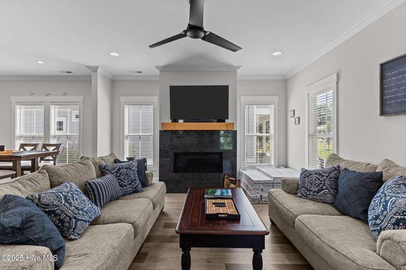 This beautiful home, built in 2023 by Coastline Homes NC, is packed with features and ready for you to move in! Located just a quick golf cart ride from waterfront dining and local shops, you'll love the relaxed coastal lifestyle this home offers. With over 1,800 square feet of thoughtfully planned space, it includes a garage, a newly enclosed sunroom for year-round enjoyment, a cozy fireplace, tankless water heater, a reverse osmosis system under the kitchen sink, gas range, quartz countertops, powder room, separate laundry area, gutter guards, spacious pantry, and a charming covered front porch. The first-floor primary suite is a peaceful retreat featuring a walk-in tiled shower, large walk-in closet, ceiling fan, and calming, coastal-inspired tones. Upstairs offers even more space with two additional bedrooms, a full bath, and a flexible loft area. As an added bonus, the owners had plans to upgrade the first-floor LVP flooring and are offering to complete the installation with an acceptable offer.