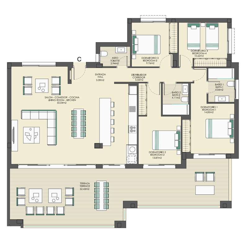 This luxury apartment is located in Casares Costa. It consists of 4 bedrooms and 3 bathrooms, with a total of 232,22m2 built and has a terrace of 52,43m2. The apartment is part of an exclusive residential with communal pool and garden, garage and lift. The residential offers a wide range of amenities and services to enjoy. It has a heated pool and two stunning design pools with night lighting. It also has a coworking/gourmet space where you can work or enjoy delicious meals. The location of this residential is excellent. It is located in Casares, on the Costa del Sol, where there are developing projects such as a new golf course and an extensive commercial area. In addition, the sophisticated design of the residential blends perfectly with the environment, creating smart spaces that maximize natural light and allow you to live more sustainablely. You can choose between different types of housing. There are low floors with garden and back terrace, floors with large terraces and penthouses with sea views and private Jacuzzi. All houses have large terraces, parking space and storage room. The apartment is equipped with air conditioning, underfloor heating in the main bathroom and a design kitchen equipped with modern appliances. In addition, it has an innovative system of thermal and acoustic insulation, which makes your home a sanctuary of tranquility and comfort. Do not miss the opportunity to live in this exclusive luxury apartment in Casares Costa. Contact us for more information! *The price corresponds to the most economical property of 4 rooms of the residential. The price and some details may vary depending on availability.