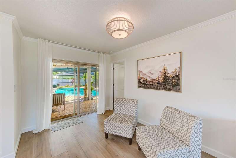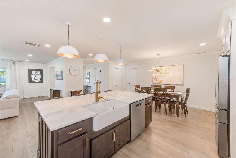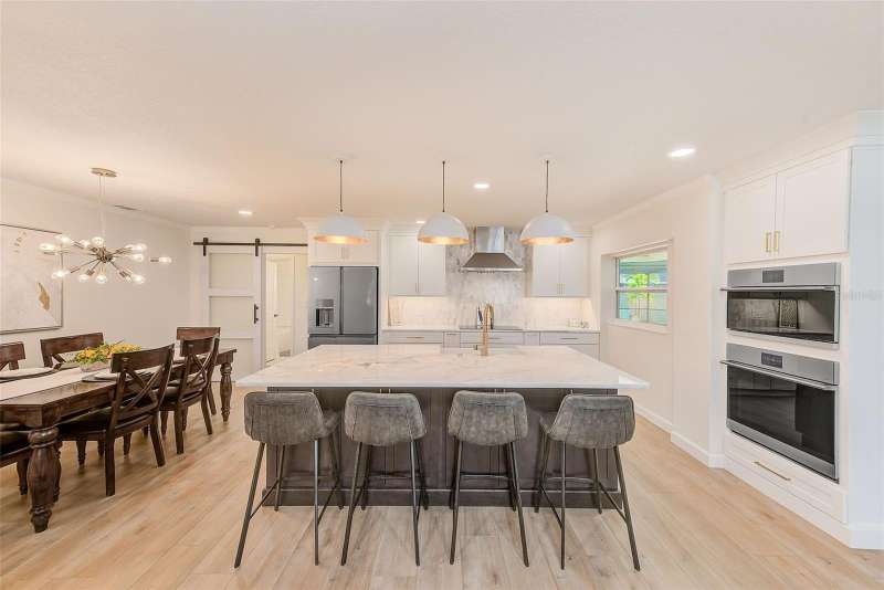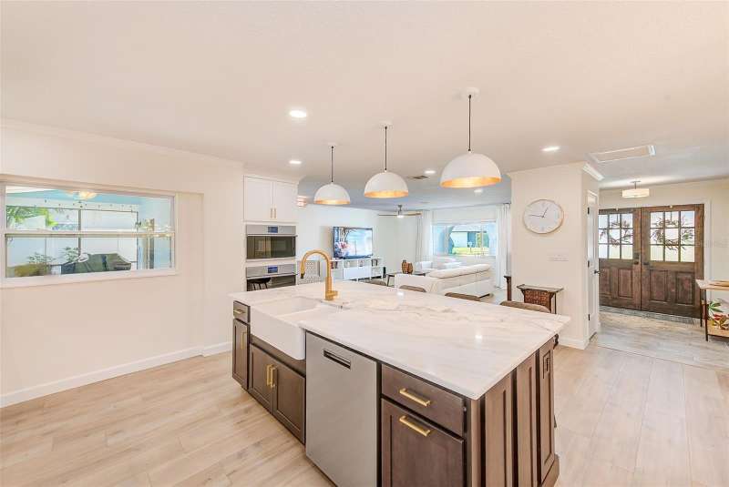 Under contract-accepting backup offers. Prepare to be impressed by this stunning, professionally renovated pool home that looks like it was designed by an interior stylist. Offering 4 bedrooms, 2 baths, a 2-car garage, and over 2,000 square feet of living space, this home’s prime central Pinellas County location blends designer-quality finishes with the ideal Florida lifestyle. The open-concept layout is anchored by an absolutely show-stopping kitchen that serves as the centerpiece of the home. A massive island with Dolomite countertops delivers marble-like elegance that’s both heat and scratch resistant.The chef’s suite of appliances includes an induction cooktop, stainless range hood, double oven with built-in air fryer and convection microwave, a large farmhouse sink with touchless faucet, and brushed-gold hardware that complements the soft-close cabinetry and custom tile backsplash. Crown moulding adds a refined finishing touch, while the dining and living areas flow seamlessly toward the pool for effortless entertaining. Luxury vinyl plank flooring extends throughout the home, with designer tile in the entry and baths. The spacious primary suite features sliding glass doors to the pool, a walk-in custom closet, double linen closet, and a modern barn-style frosted-glass door leading to the ensuite bath. The newly renovated bathroom feels like a spa retreat with a large frameless glass shower surrounded by tranquil, sea-glass-colored tile, a double wood vanity with quartz counters, a wide rectangular mirror, and stylish side-light sconces that create a warm, zen-like ambiance. The split floor plan offers privacy, with three additional bedrooms and another full bath on the opposite side of the home, also accessed by a matching barn-door entry. The large laundry room includes built-in shelving and a utility sink, providing plenty of storage and convenience. Step outside to a true backyard retreat. The pool and lanai were completely redone in 2025—including new screening, pump, and resurfacing—creating a sparkling centerpiece for the expansive outdoor space. The large vinyl-fenced yard offers plenty of room for entertaining or play, while the extended paver driveway provides extra parking for guests, a boat or recreational toys. In addition to designer finishes and location, peace of mind comes standard: the roof was replaced in 2017, the water heater in 2025, and in 2024 a mixed-bed water filtration system was installed to deliver pure high-quality water throughout the home. Located just a short distance from Eagle Lake Park with its scenic nature trails, dog park, and picnic areas, and minutes to the Largo Community Center, Largo Rec Center, Largo Library and Largo Central Park. Shopping, dining, golf, and the award-winning Gulf beaches are all nearby — offering the perfect balance of luxury living and convenience. Only about 10 minutes to the Clearwater/St. Pete airport and less than 30 minutes to Tampa and Tampa International Airport, this home offers easy access to everything Tampa Bay has to offer. This home is truly move-in ready and stands out for its impeccable design, quality craftsmanship and unbeatable location.