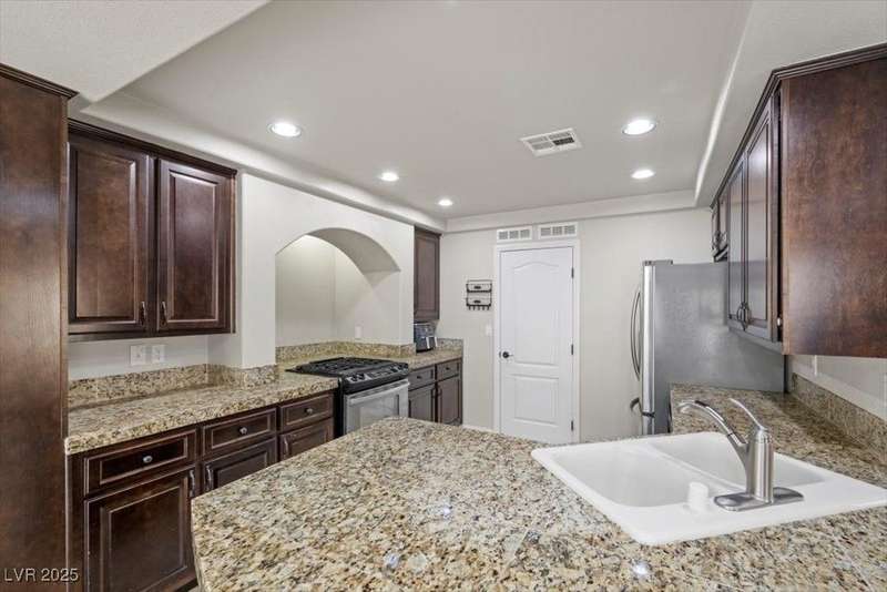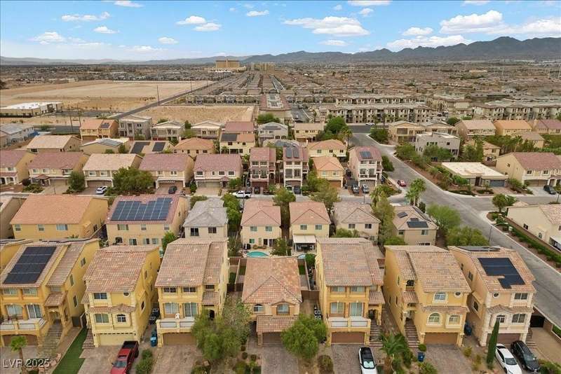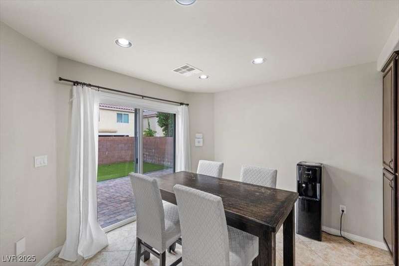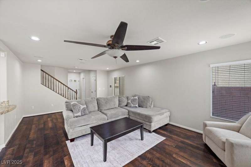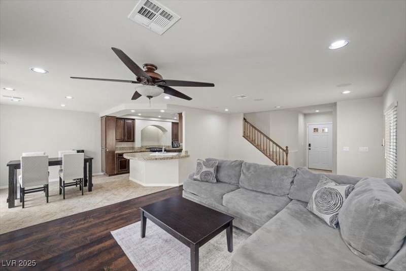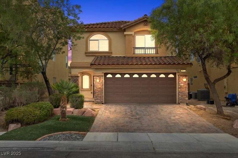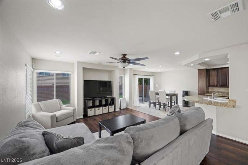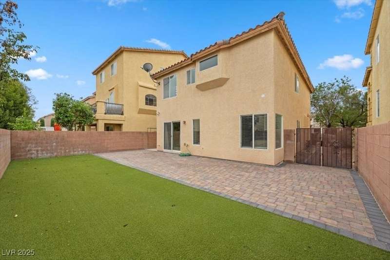 Welcome to this beautifully maintained two-story home in the highly desirable Southwest Las Vegas! From the moment you arrive, the mature landscaping creates a warm welcome and wonderful curb appeal. Step inside to a bright and inviting open floor plan where the spacious living room features modern laminate flooring and light, airy walls that enhance the home's natural flow. The kitchen is a true centerpiece with granite countertops, rich dark cabinets, and a design that overlooks the dining and living areas perfect for entertaining and everyday living. Upstairs, you will find the spacious primary suite and a primary bathroom complete with dual sinks and a large walk-in shower. With 4 bedrooms total, this home provides the flexibility for family, guests, or a home office. Completing this home is a spacious backyard with artificial turf and pavers. This home is a perfect choice for first-time buyers or anyone looking for a move-in ready home in a prime location.
