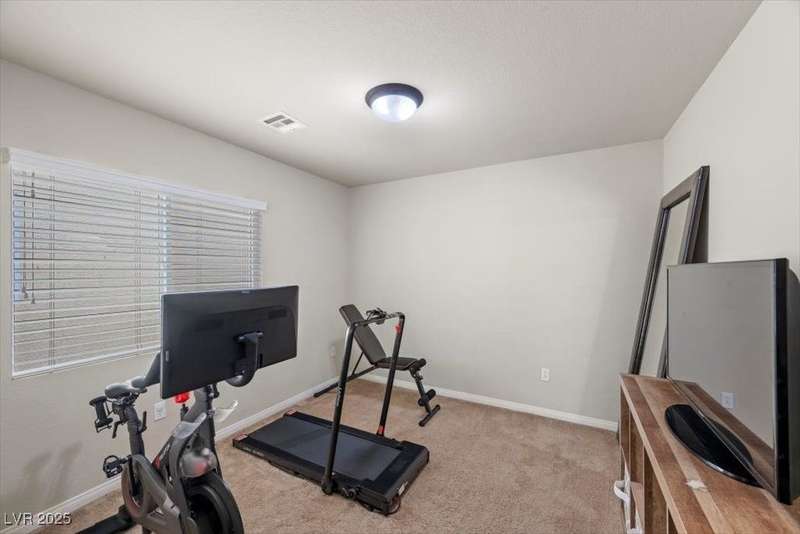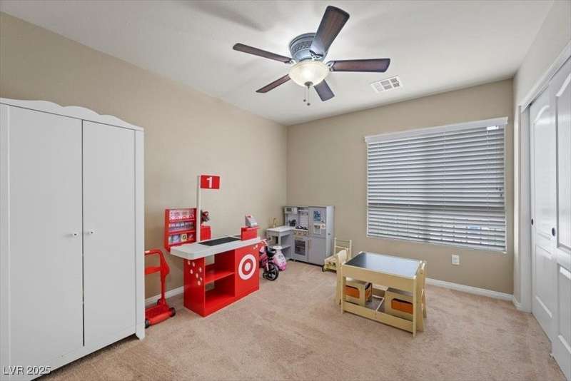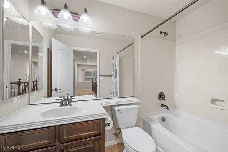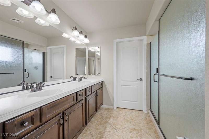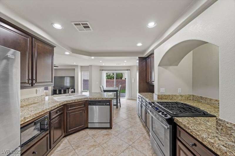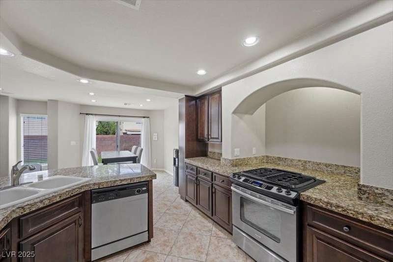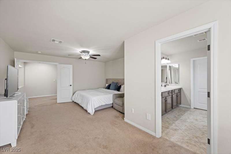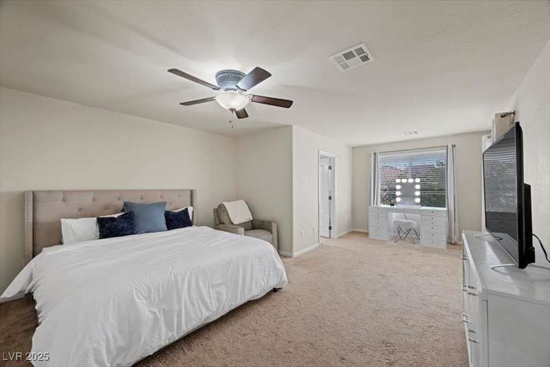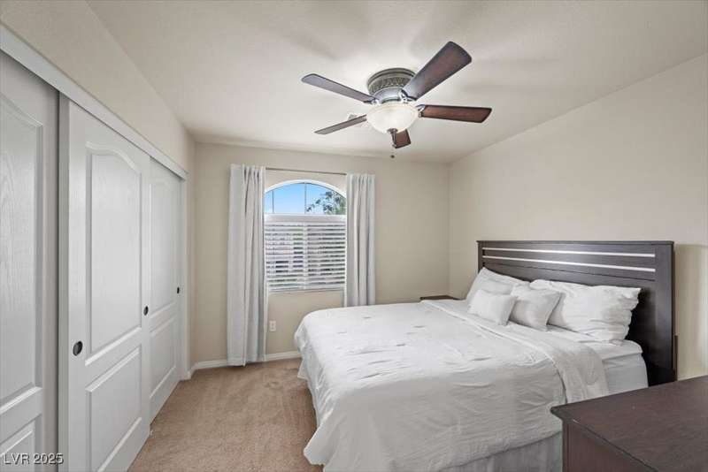 Welcome to this beautifully maintained two-story home in the highly desirable Southwest Las Vegas! From the moment you arrive, the mature landscaping creates a warm welcome and wonderful curb appeal. Step inside to a bright and inviting open floor plan where the spacious living room features modern laminate flooring and light, airy walls that enhance the home's natural flow. The kitchen is a true centerpiece with granite countertops, rich dark cabinets, and a design that overlooks the dining and living areas perfect for entertaining and everyday living. Upstairs, you will find the spacious primary suite and a primary bathroom complete with dual sinks and a large walk-in shower. With 4 bedrooms total, this home provides the flexibility for family, guests, or a home office. Completing this home is a spacious backyard with artificial turf and pavers. This home is a perfect choice for first-time buyers or anyone looking for a move-in ready home in a prime location.