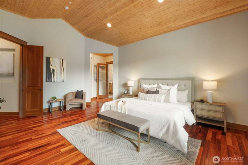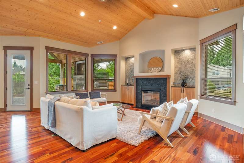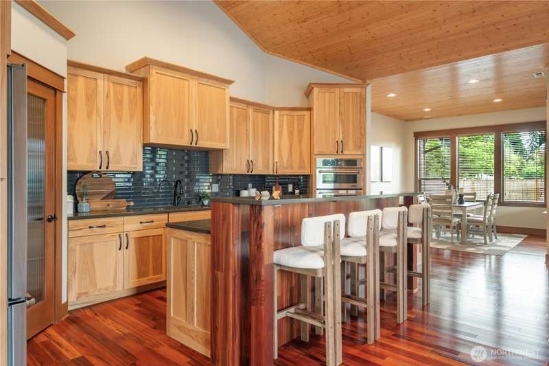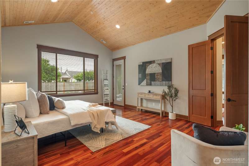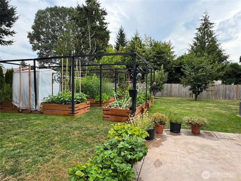 Don’t miss this private lodge style sanctuary! The flat almost ½-acre lot with private drive & gated entry boasts a one-story 2014 custom-built home that is a car collector’s dream! It has an oversized 3-car attached garage + 4-car detached shop w/½ bath & 10’ doors for your RV/boat. The home has a grand covered entry that leads to sizable foyer w/adjacent office, vaulted ceilings & an open great room w/gas fireplace, dining area, & cook’s kitchen. The luxurious primary suite features a spa-style bath. Step outside to the 422+ SF covered patio w/fireplace, built-in BBQ & TV wiring. Fenced yard w/fruit trees and a garden of raised beds- your urban farm to table awaits! Mature landscaping throughout. Sewer connected. Minutes from I-5 and 509.