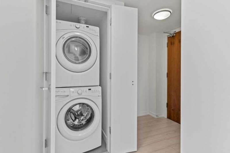 8th-Floor Luxury Corner Suite – Outlook at Waterfront Experience elevated urban living in this 8th-floor, 2-bedroom, 2-bathroom corner suite located in the prestigious Outlook at Waterfront. Crafted for both style and functionality, the kitchen boasts stone surfaces, premium integrated appliances, a gas cooktop, and generous pantry space—all illuminated by modern recessed lighting. The open layout is finished with wide-plank laminate and ceramic tile flooring, creating a welcoming and elevated atmosphere. The primary bedroom features a stylish 3-piece ensuite, while the second bedroom is conveniently located near the full 4-piece main bathroom. In-suite laundry adds everyday convenience. Additional Highlights: Central air conditioning TWO side-by-side assigned parking stalls Secured storage locker (4’x6’) located close to the elevator Exclusive Building Amenities: Fully equipped fitness center and yoga studio Hot tub and sauna Theatre room, social lounge, and guest suite Car wash bay, secure visitor parking, and on-site concierge Whether it’s a morning jog along the river, an afternoon in the park, or dinner downtown, everything Calgary has to offer is right outside your door.