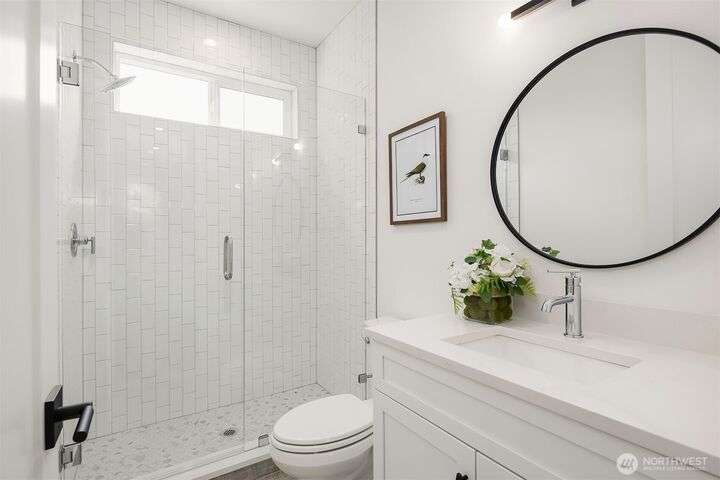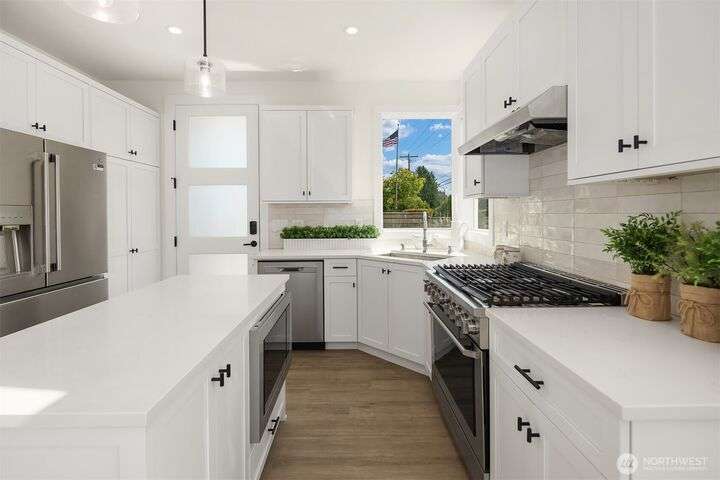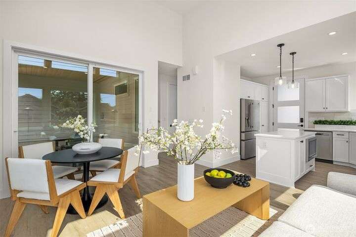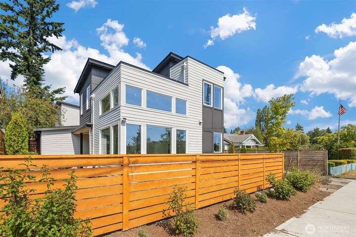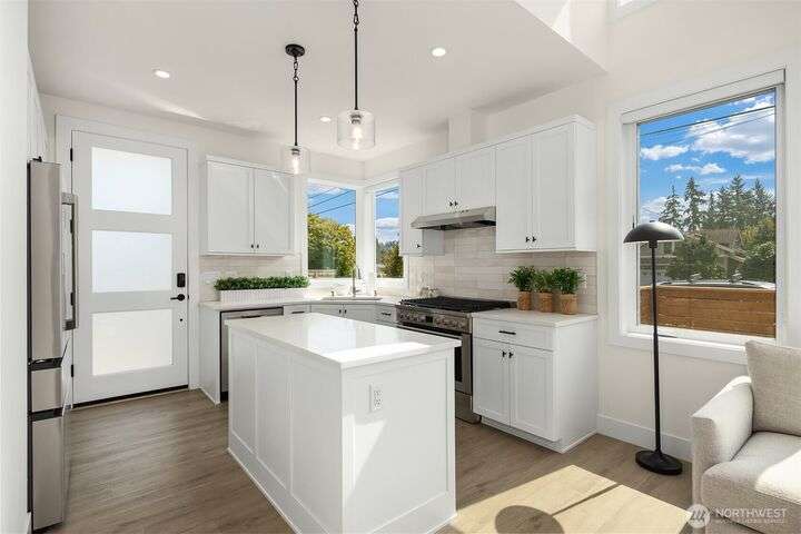 Stunning 3bed/2.5bath modern residence in coveted Norkirk neighborhood. Light filled, open-concept main living features sleek kitchen w/ample cabinetry, quartz countertops, gas range & central island. Great room boasts soaring 2-story ceiling & south-facing floor-to-ceiling windows flooding the space w/natural light. Guest suite on the main. Upstairs, a loft & 2 additional bedrooms w/own en-suite bath. Each living area is equipped w/mini-split for year-around comfort. Step outside to spacious covered patio w/outdoor heater & fully fenced private yard. Oversized 1- car garage w/EV charger & additional driveway parking. Luxury finishes & energy efficient features throughout. Sought-after LWSD. Just a short stroll to DT Kirkland & waterfront.