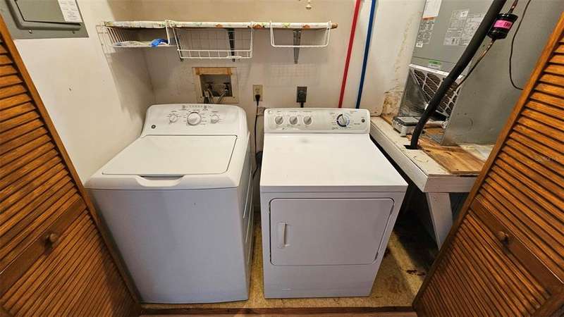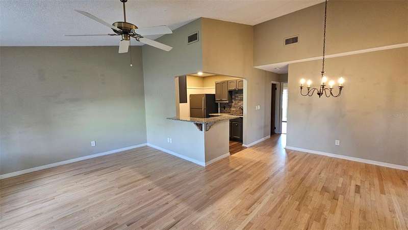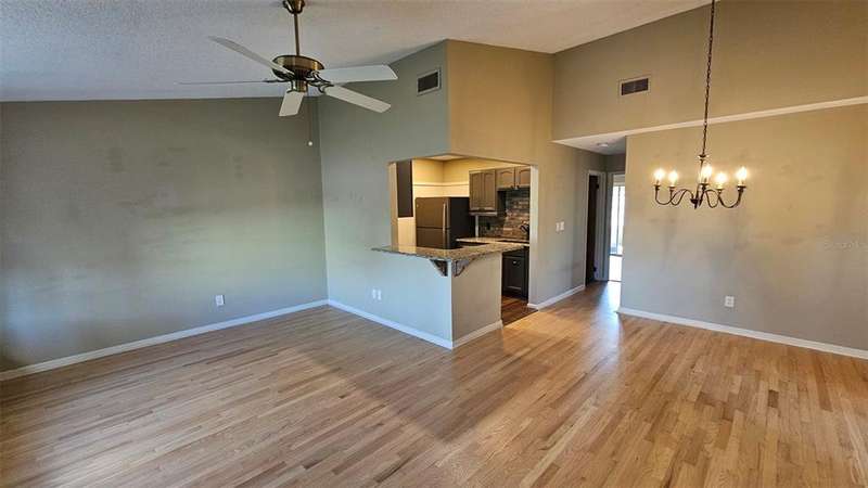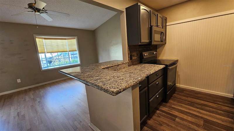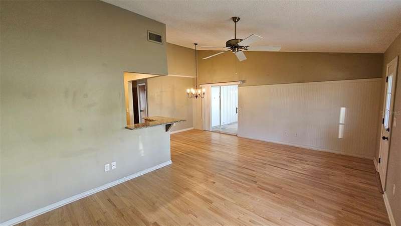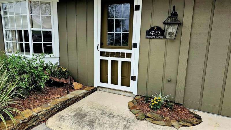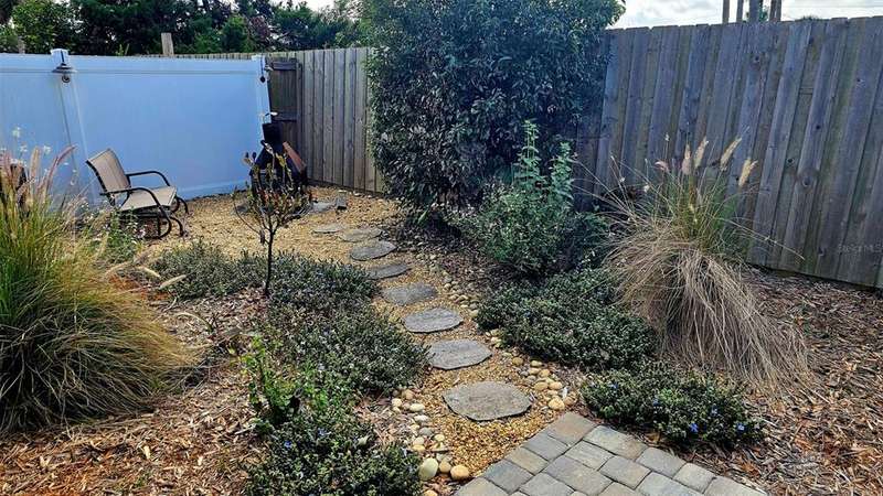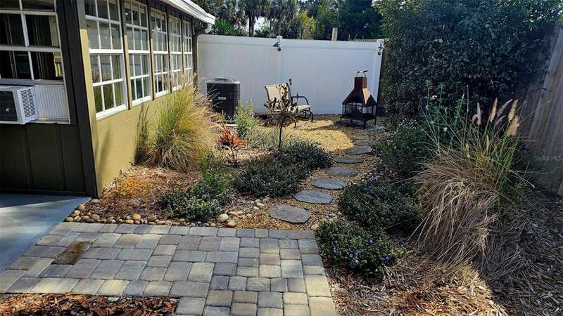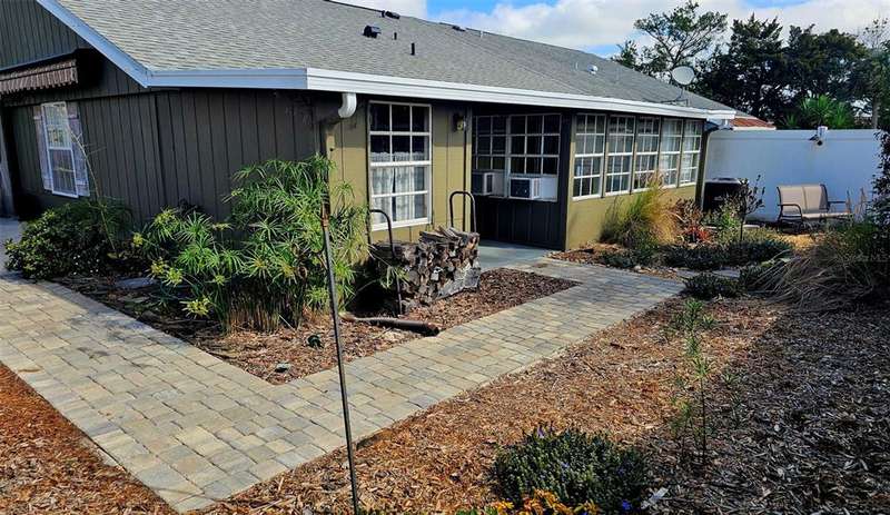 Updated golf villa with Brand New ROOF in January 2025 and New AC 2024. Engineered wood floors throughout living area and bedrooms, and luxury waterproof vinyl in bathrooms and kitchen. Updated bathroom cabinets, faucets and countertops. Kitchen has been opened up to become part of the living area, with granite counters and extra seating at bar area. Newer SS kitchen appliances - 4 to 5 years young, dishwasher 2023. Vaulted ceiling in living/dining area and bay window. Spacious garage with lots of natural light, storm rated door, and storage closet housing 50 gallon water heater. Interior laundry with full-size W/D. Spacious Florida Room with window AC units provides additional 170 sq. ft. of living space, and leads to patio area for covered outdoor space. Large storage area/workshop is the perfect man-cave or hobby area. Beautiful backyard with zero landscaping and no lawn to maintain is perfect spot for entertaining, grabbing some rays or getting away from the rest of the world. Side yard has electric awning with drop-down sunscreen for additional outdoor living space. Ample side-by-side parking on driveway, as well as garage parking. Golf cart friendly community, ride your golf cart to Hidden Lakes Golf Club clubhouse/restaurant, or Municipal Golf Course/Restaurant. Nestled between 2 golf courses and near the Historic Canal Street shopping district. Eclectic Flagler Avenue shops and dining venues are but a few minutes away by car, as is the beach! Low annual HOA fees provide termite bond and irrigation system and water for sprinklers. Community heated pool/spa, available by optional and separate membership to Pool Association.